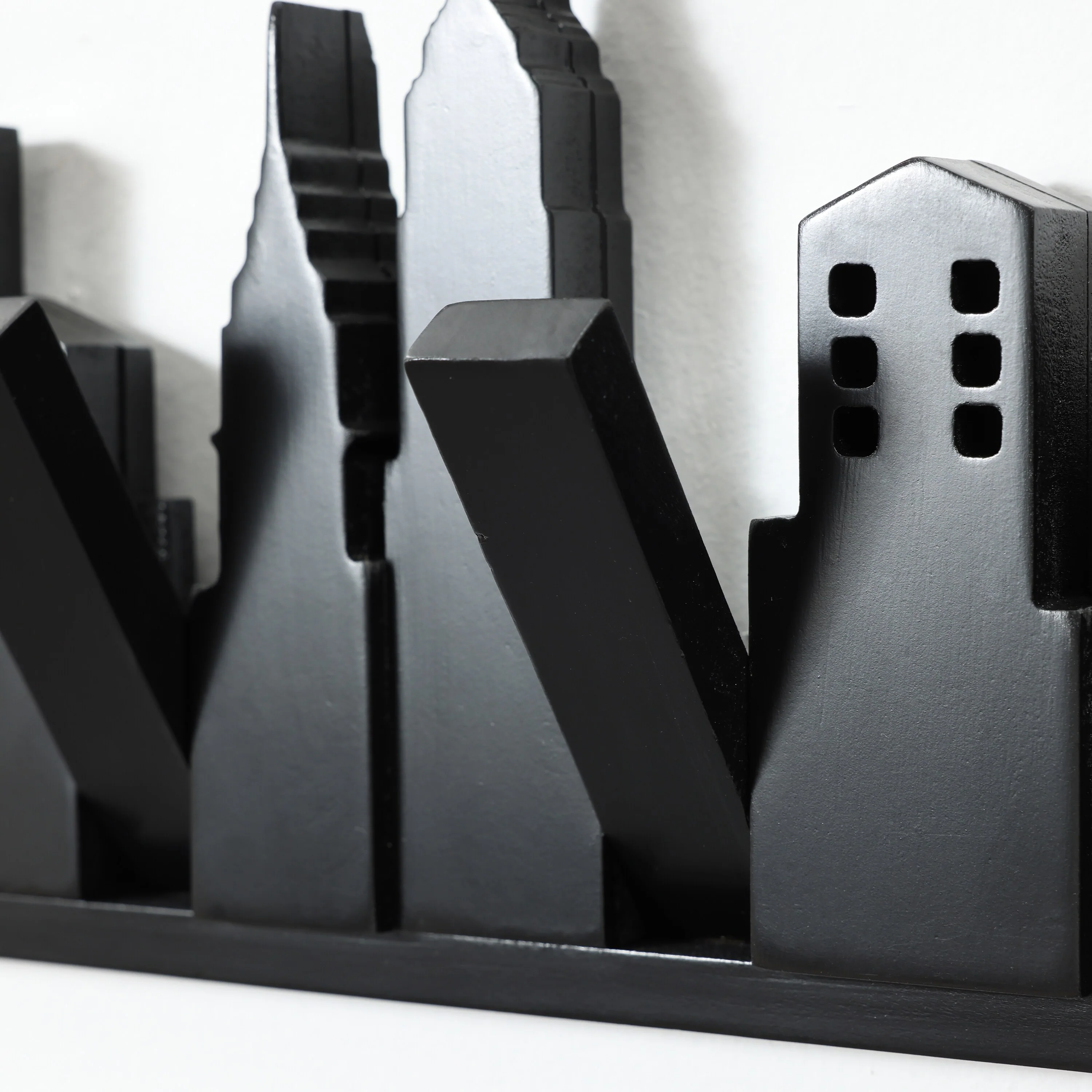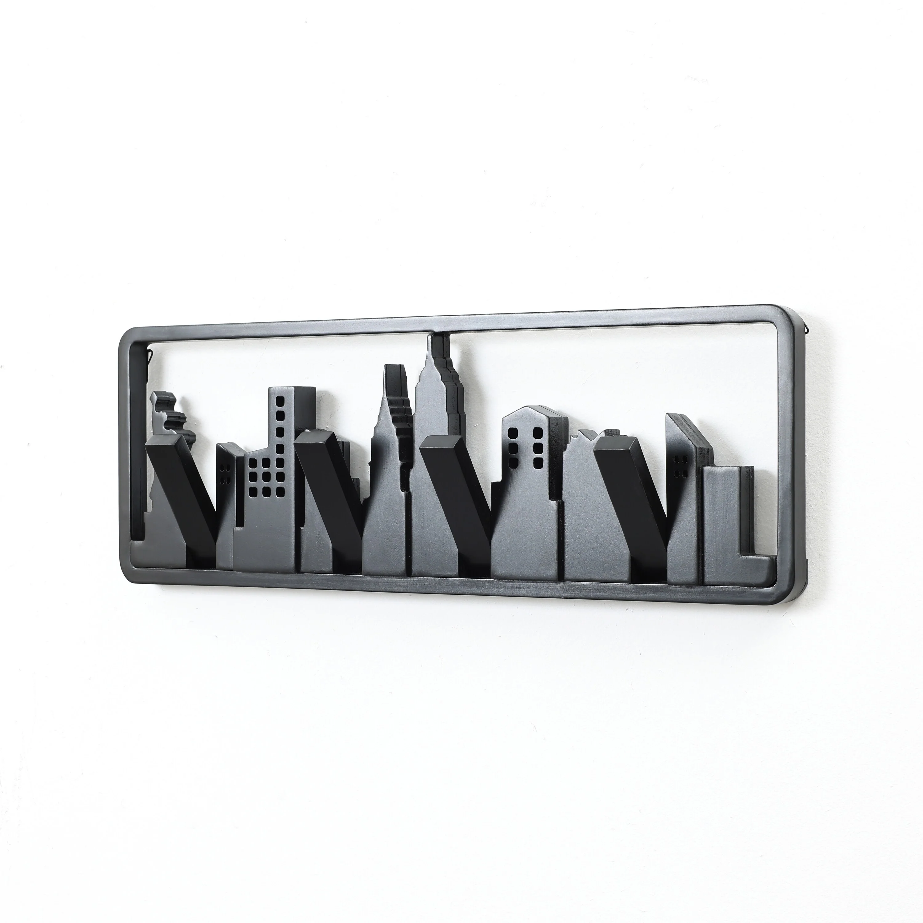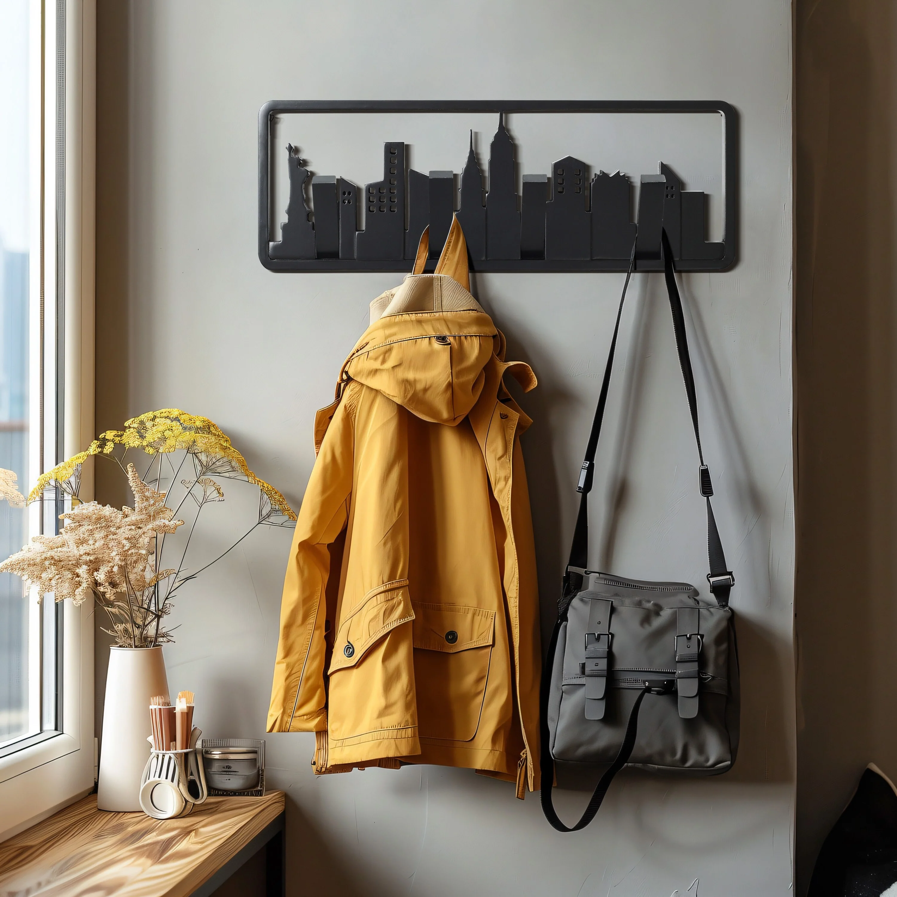 The wall-mounted coat rack is a great addition to any entryway, bathroom, or bedroom. It helps keep the area clean and organized by providing ample hanging space. The coat rack features the Statue of Liberty and tall buildings and is made from a solid fir wood frame. It has four flip-down hooks made from high-quality manufactured wood, which can be flipped up when not in use to serve as a modern wall decoration. It weighs less than 3 pounds and comes with mounting hardware, making it easy to install quickly.