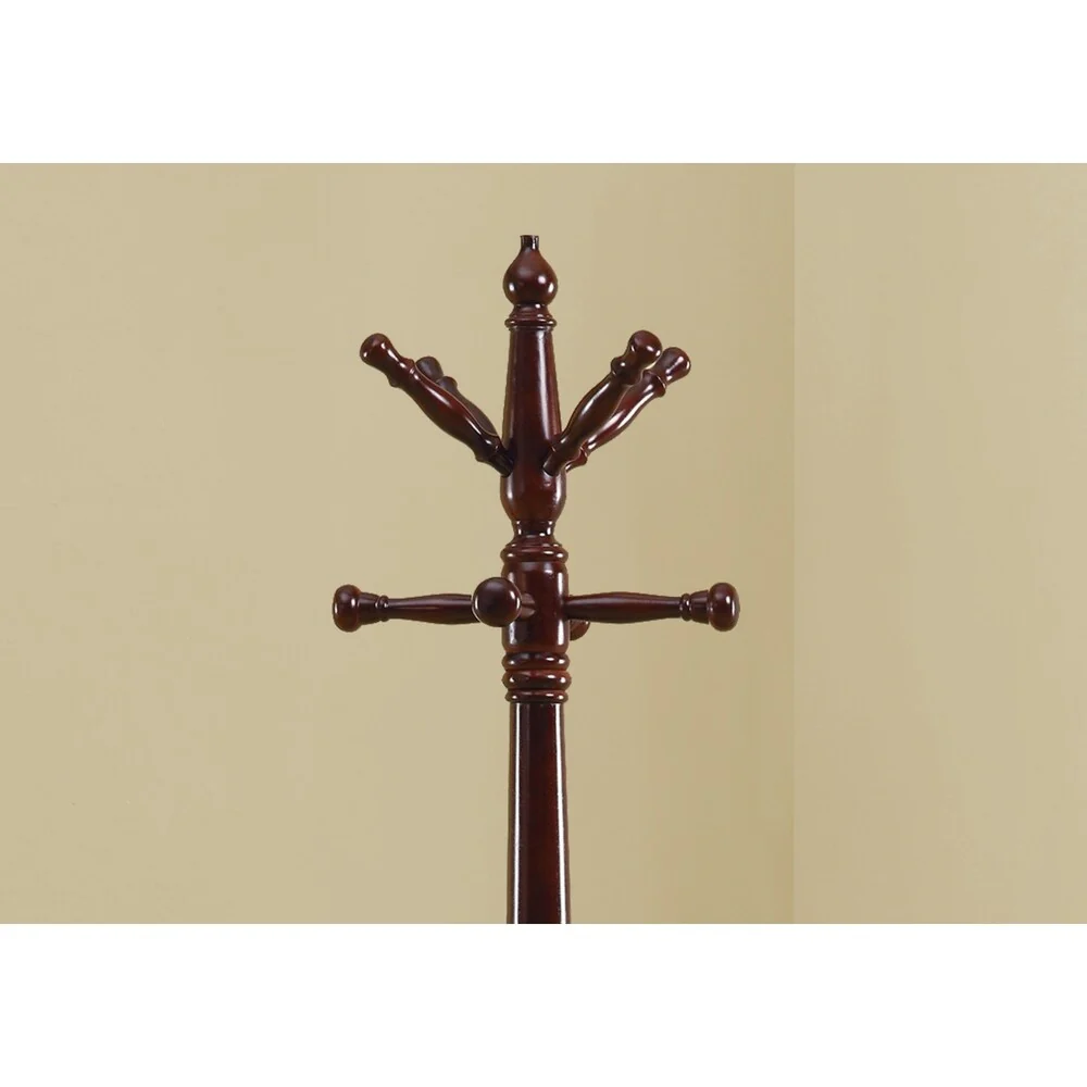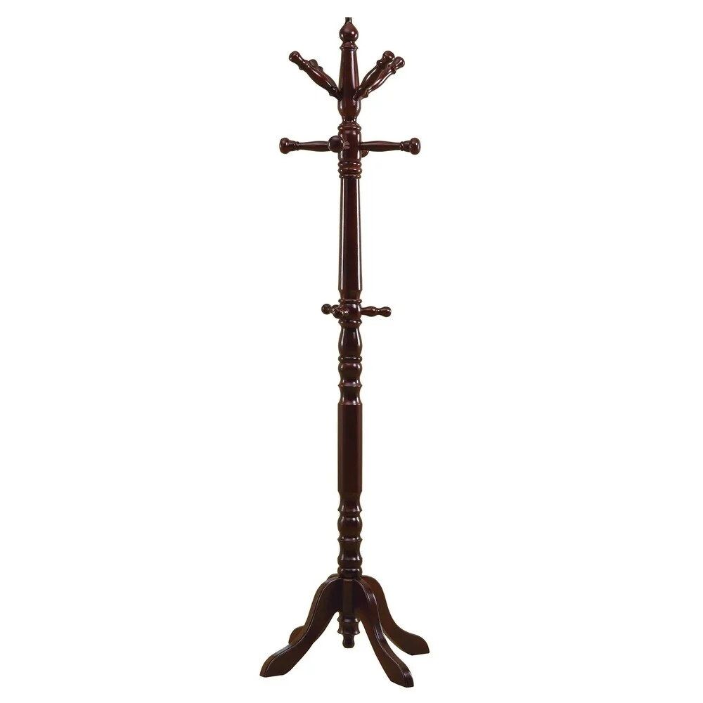Complete the functionality of your home with this traditional style solid wood coat rack. A warm dark cherry finish completes the classic appeal of this triple tiered coat stand with 11 hanging pegs for your coats, hats, scarves, shawls, or sweater. The beautiful turned post anchored with a sturdy pedestal base brings plenty of stylish storage into your living space, making it easy to organize your entryway, hallway, bedroom, or office space.