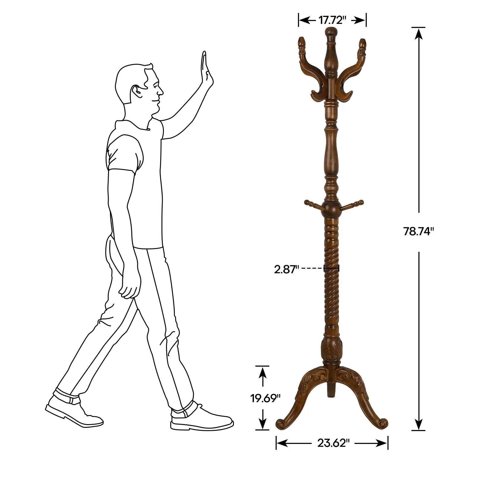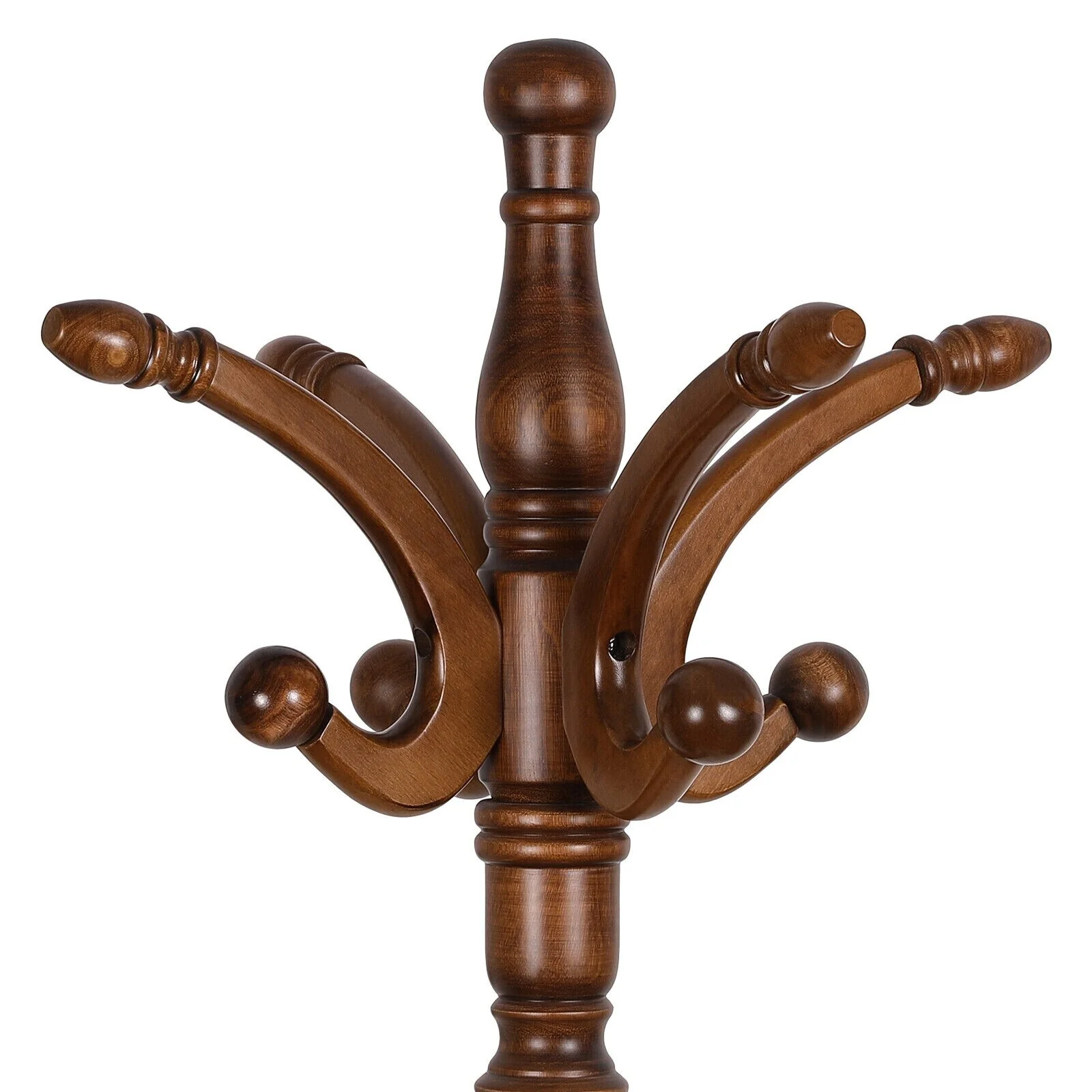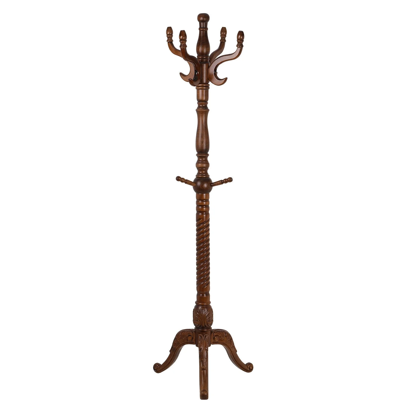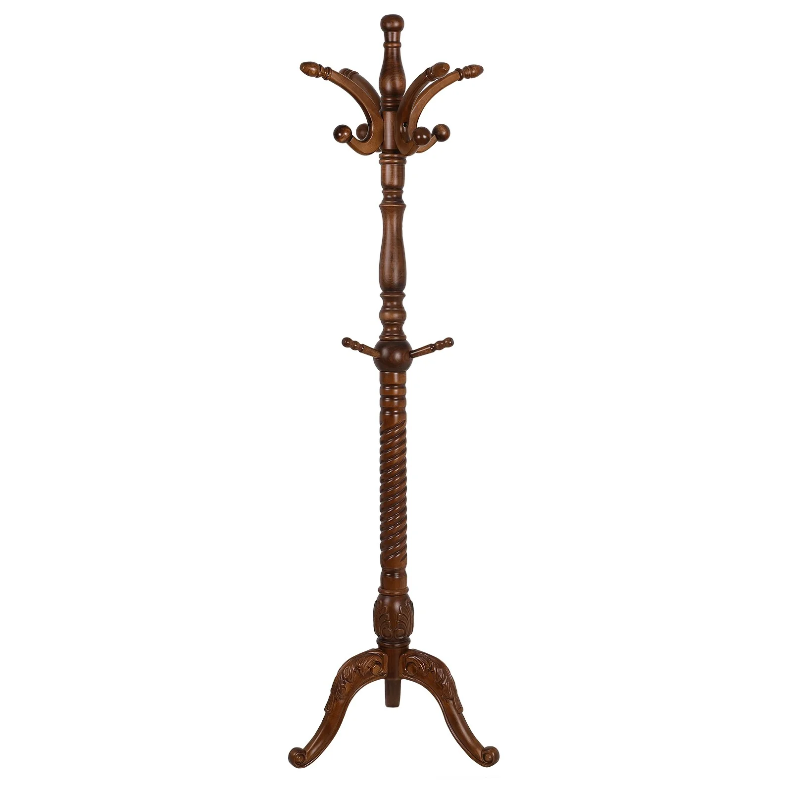 This tall and well-made coat rack, whose main structure is made of natural ash wood, equipped with beech hook and rubberwood base, enjoys charming aesthetic in 3-leg strong base structure with a walnut brown finish, which builds a luxury silhouette with multiple hooks standing to accommodate your coats, hats, scarves, etc. Featuring antique patterns which grace the design, this coat rack is sure to catch the attention of your family and friends!