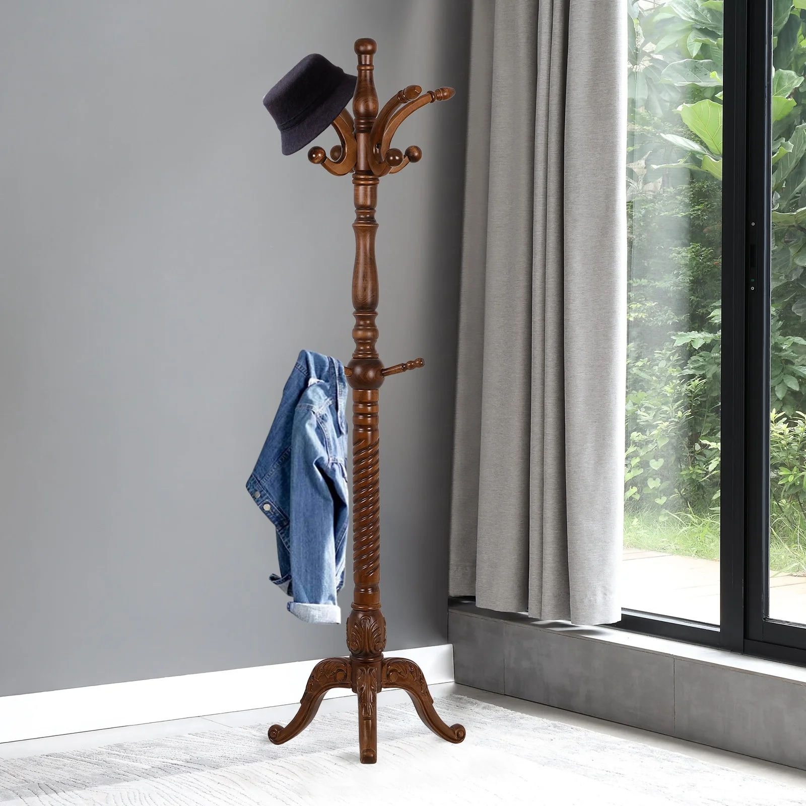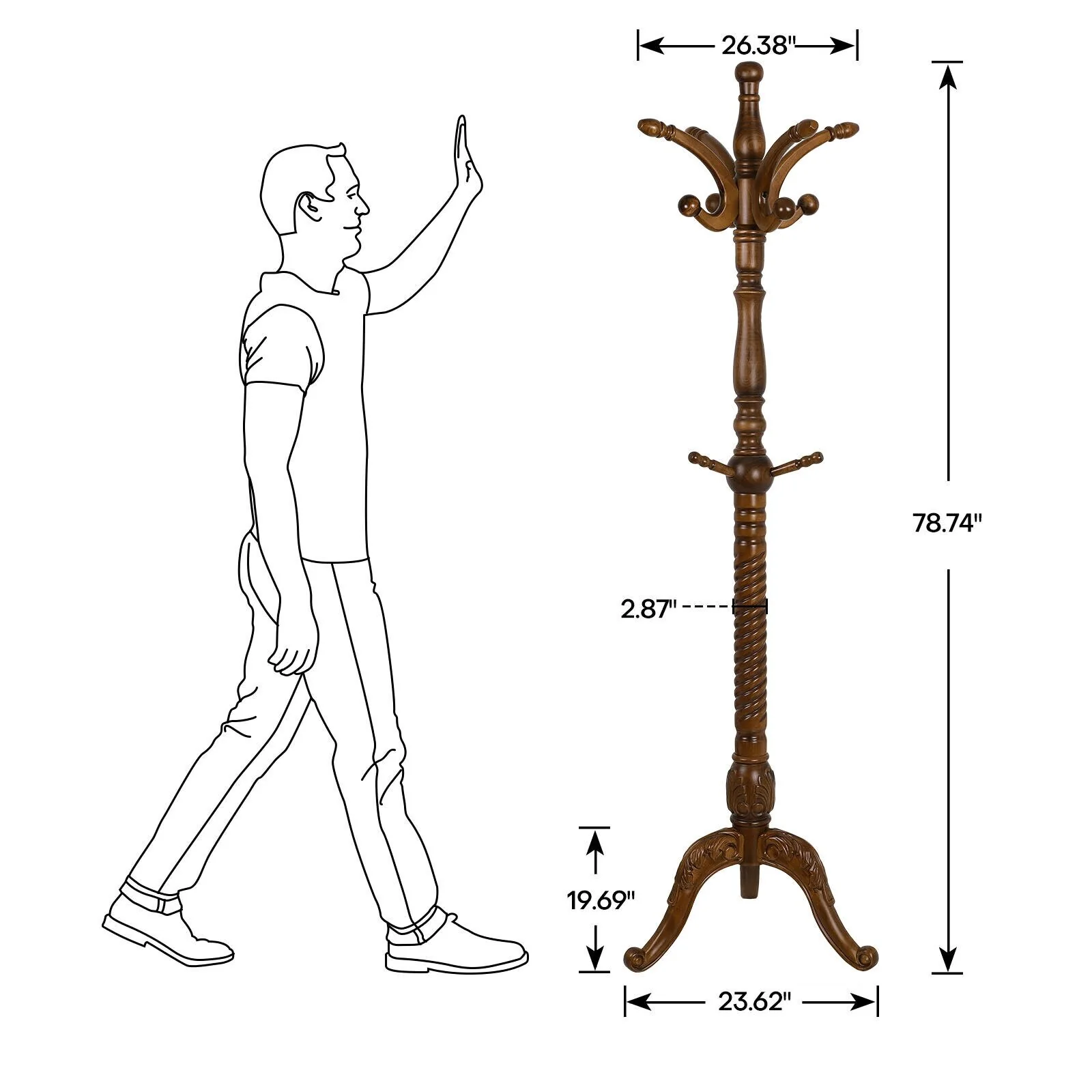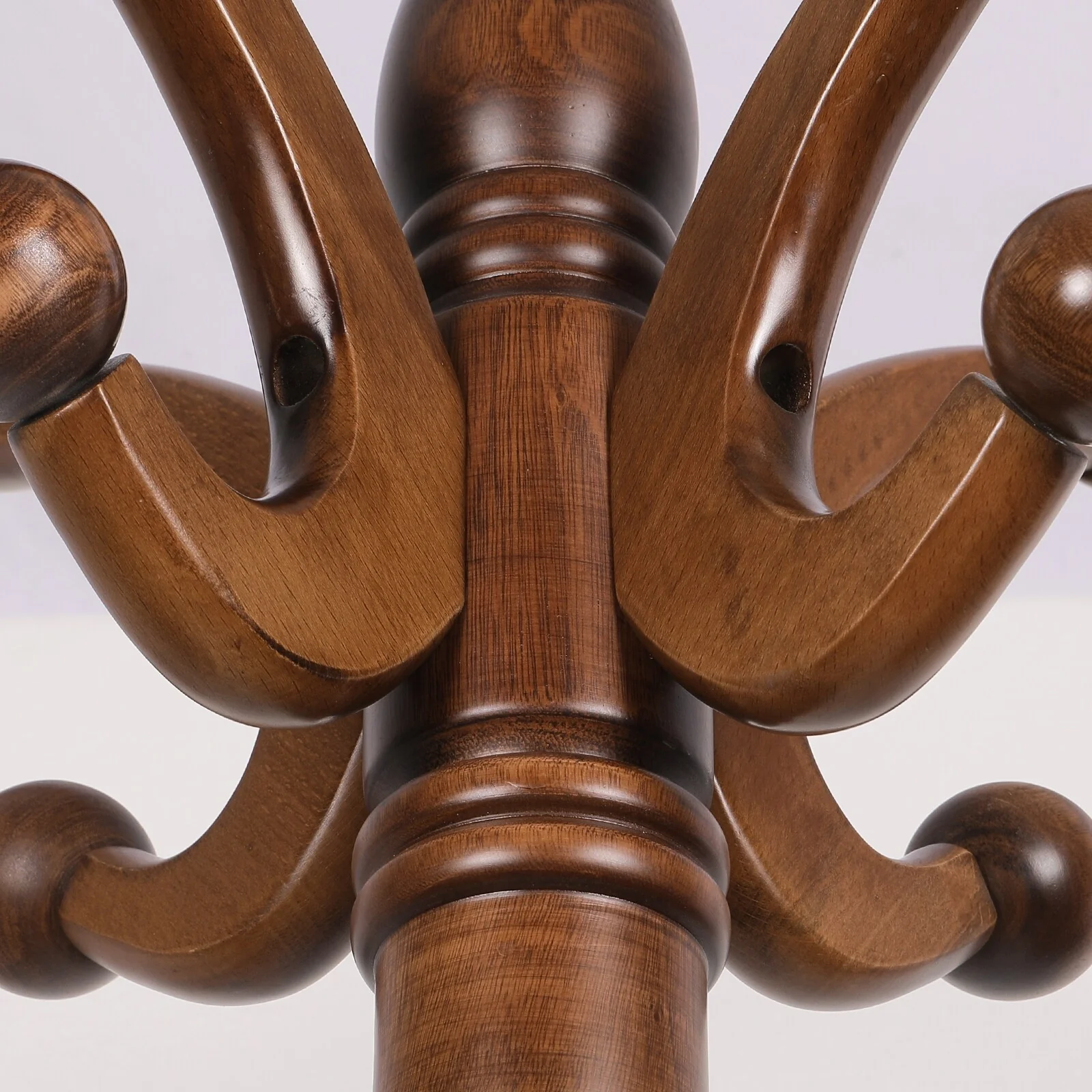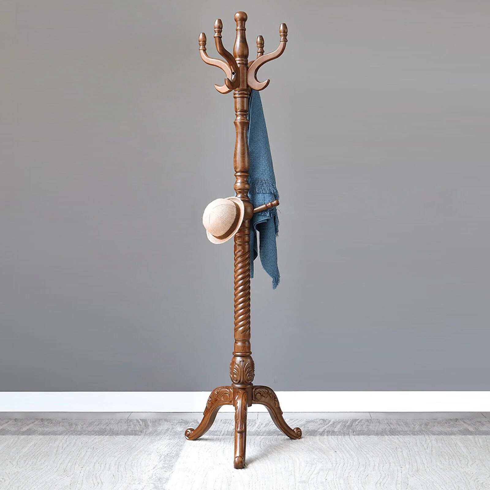 This tall and well-made coat rack, whose main structure is made of natural ash wood, equipped with beech hook and rubberwood base, enjoys charming aesthetic in 3-leg strong base structure with a walnut brown finish, which builds a luxury silhouette with multiple hooks standing to accommodate your coats, hats, scarves, etc. Featuring antique patterns which grace the design, this coat rack is sure to catch the attention of your family and friends!