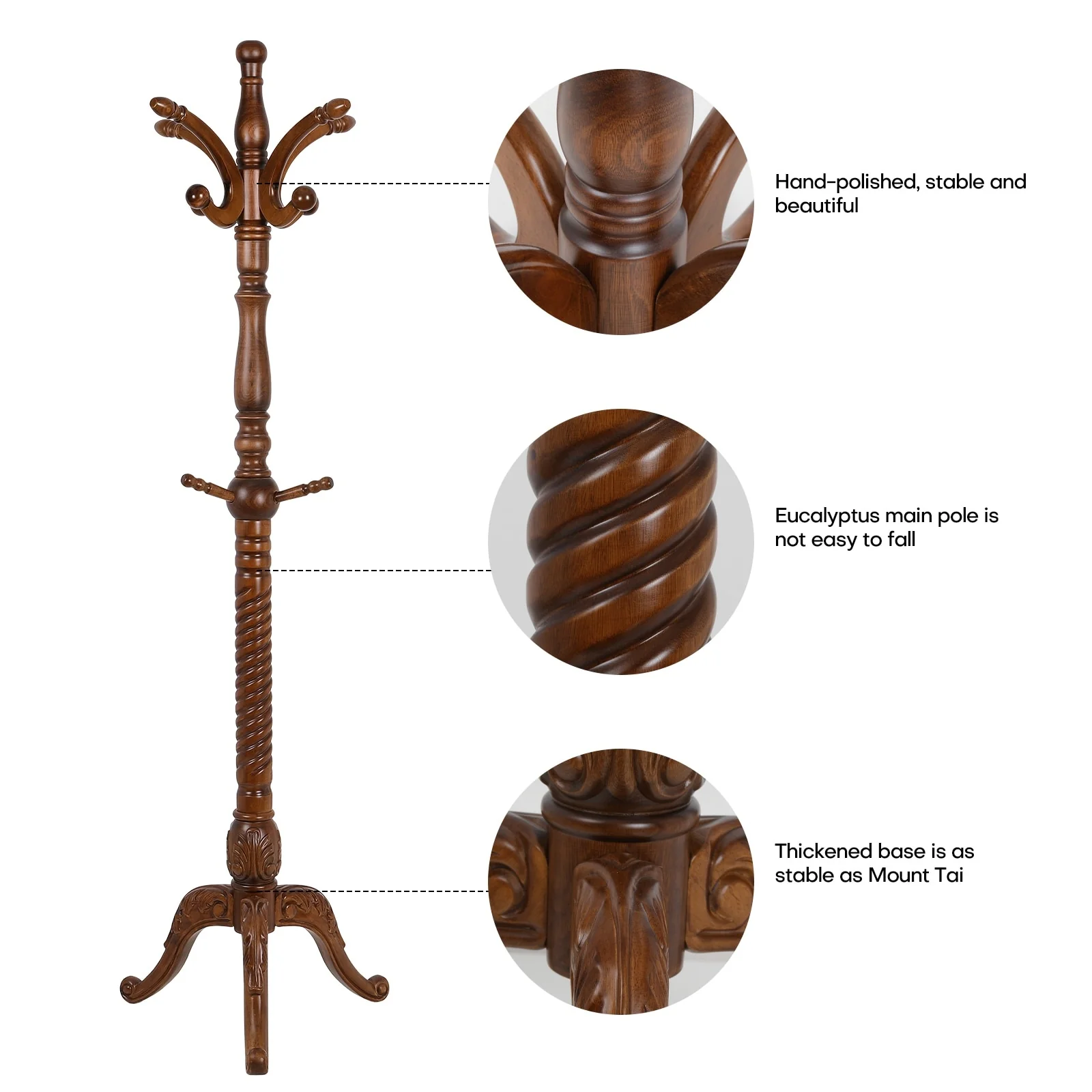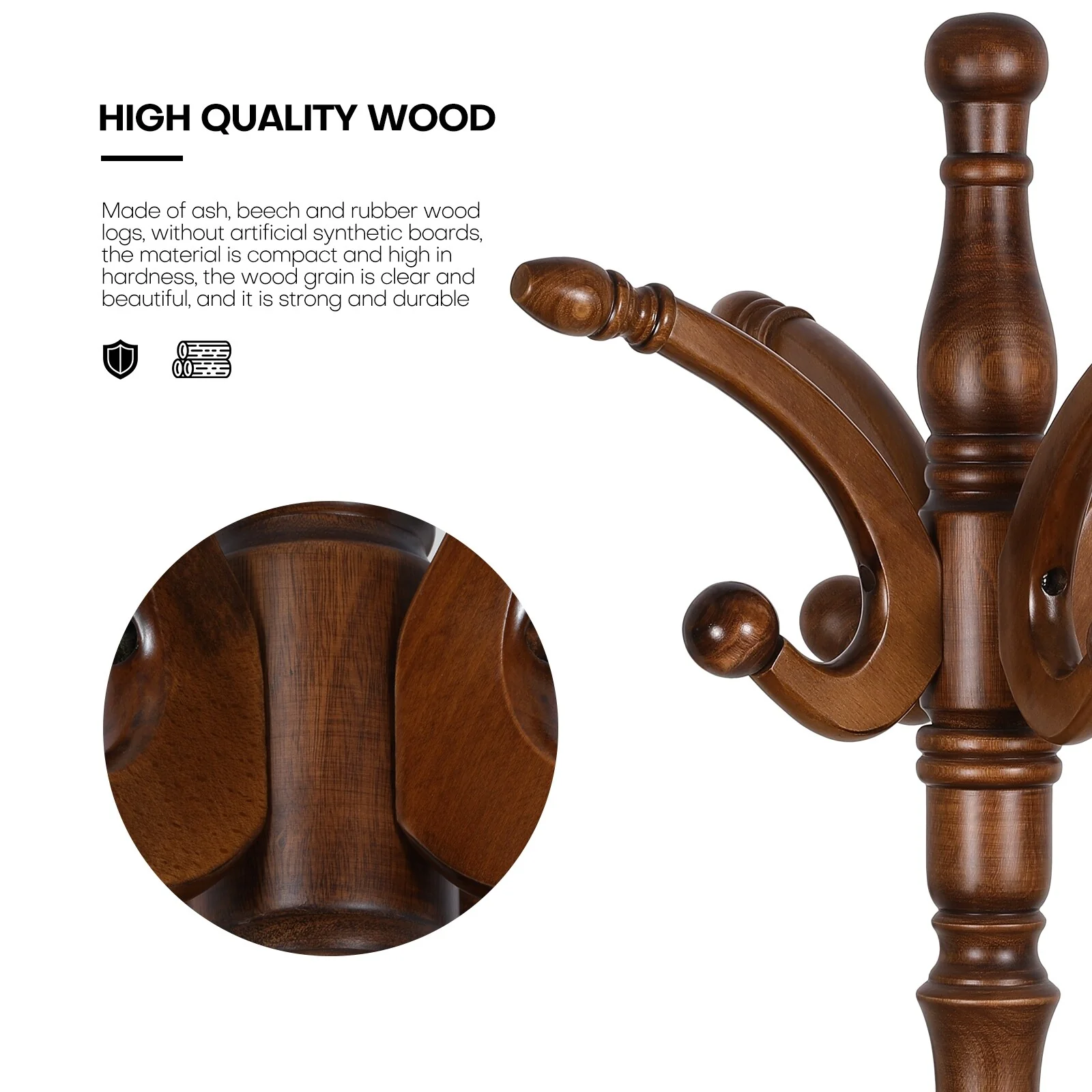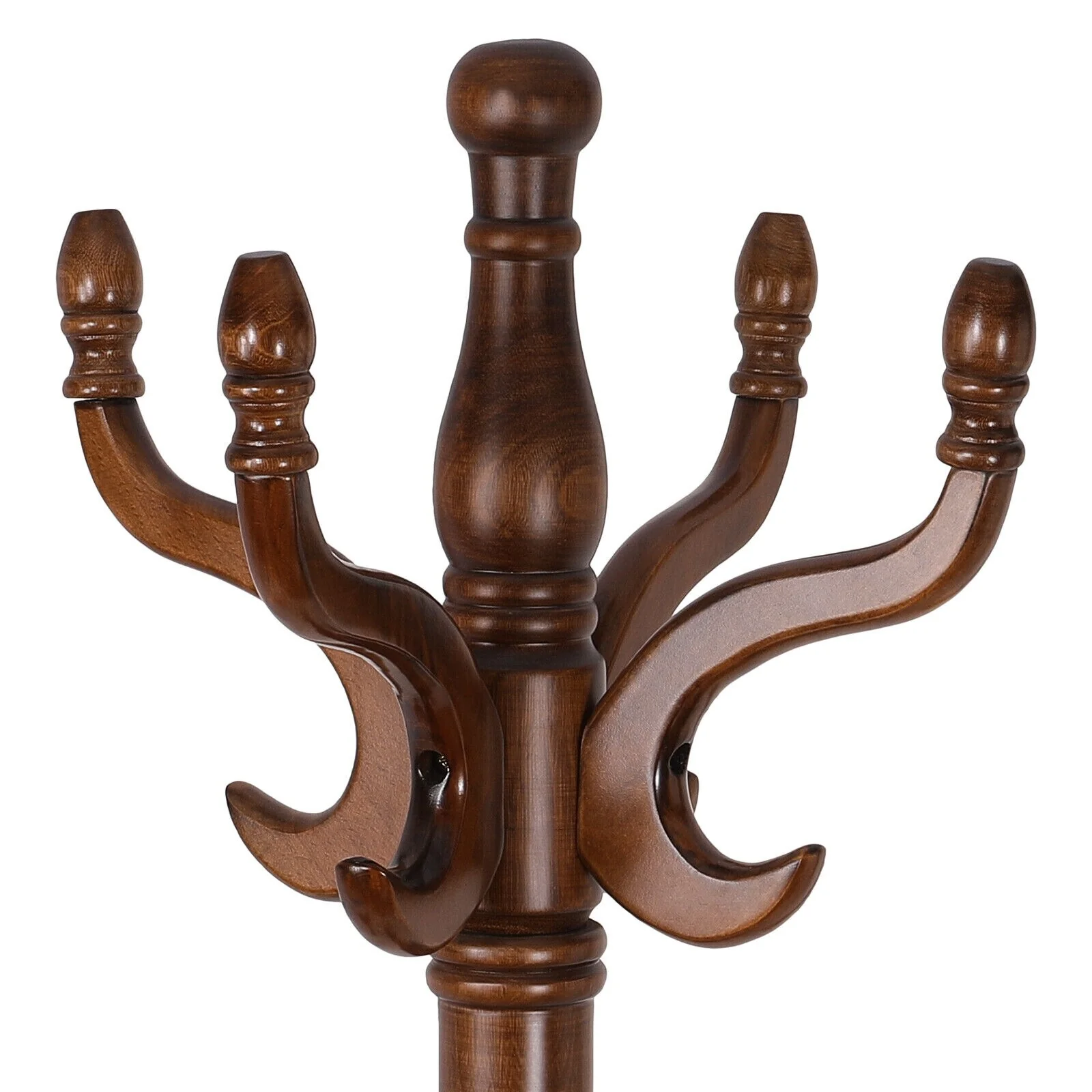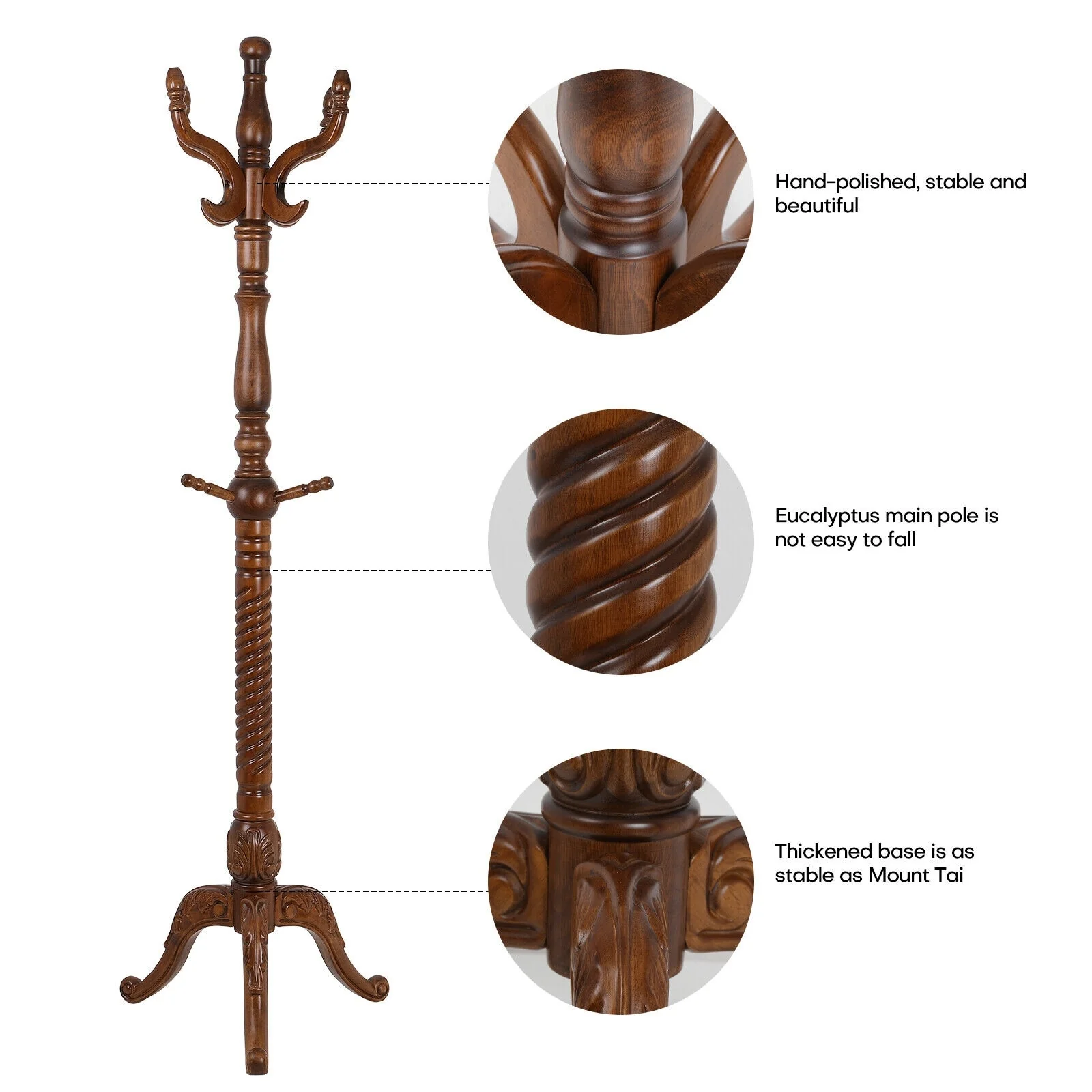 This tall and well-made coat rack, whose main structure is made of natural ash wood, equipped with beech hook and rubberwood base, enjoys charming aesthetic in 3-leg strong base structure with a walnut brown finish, which builds a luxury silhouette with multiple hooks standing to accommodate your coats, hats, scarves, etc. Featuring antique patterns which grace the design, this coat rack is sure to catch the attention of your family and friends!