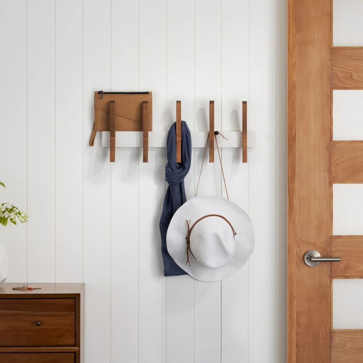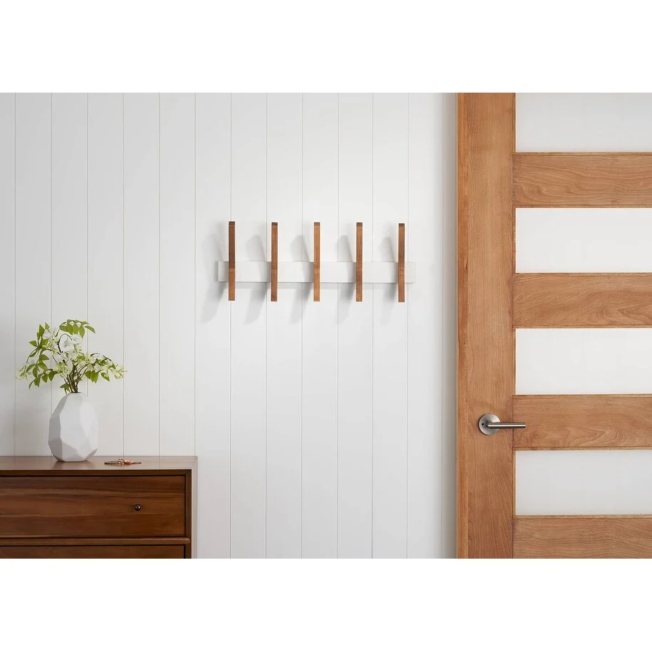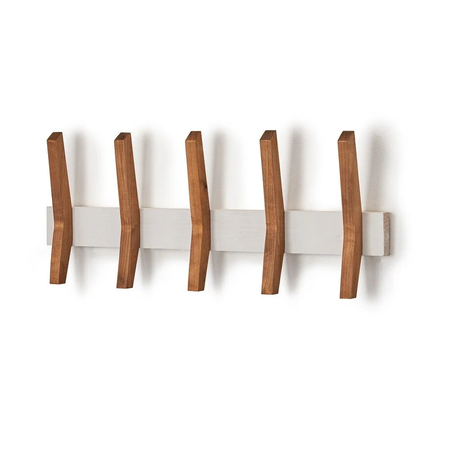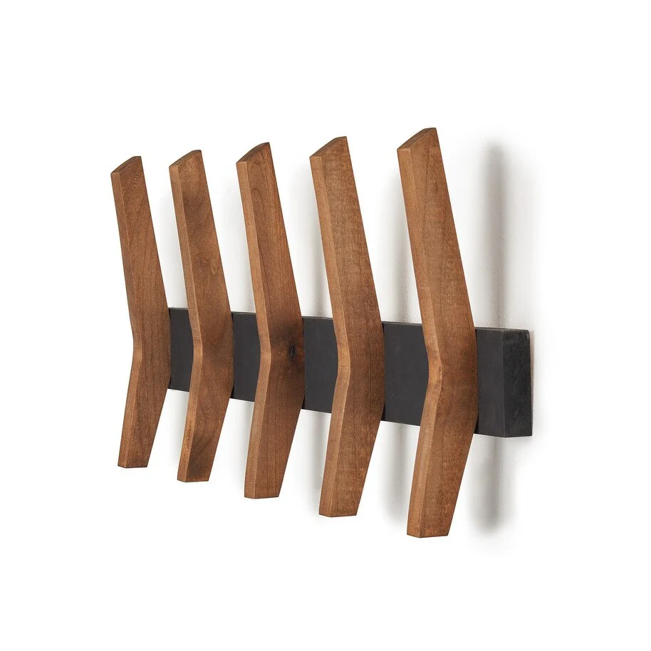 DRAKESTONE mid-century-inspired hook rack made with solid knotty adler wood adds a stylish statement to any entryway, foyer, or bathroom. Organize your hats, coats, and accessories, or use it as a towel rack in your bathroom. The keyhole slots allow easy hanging, a flush wall mount, and sturdy support.