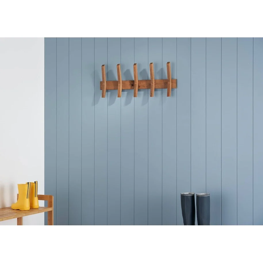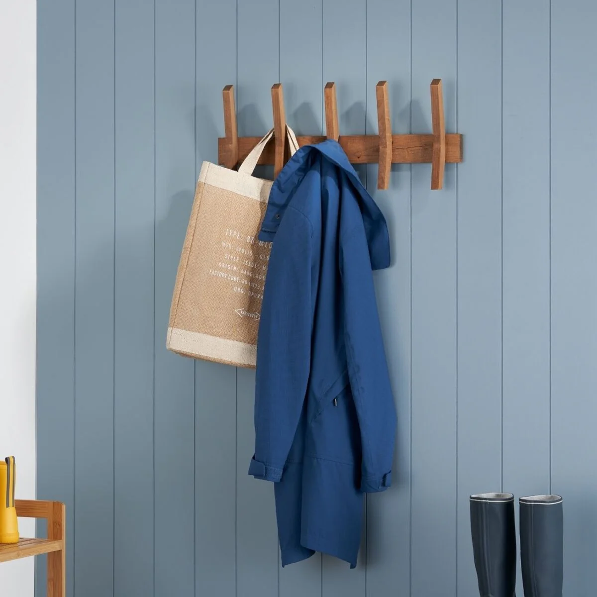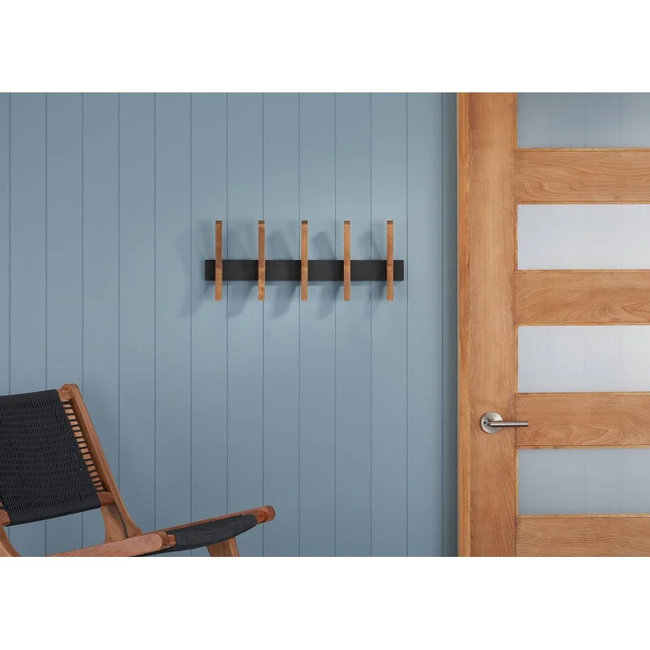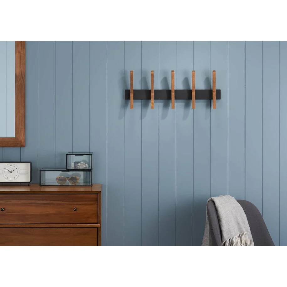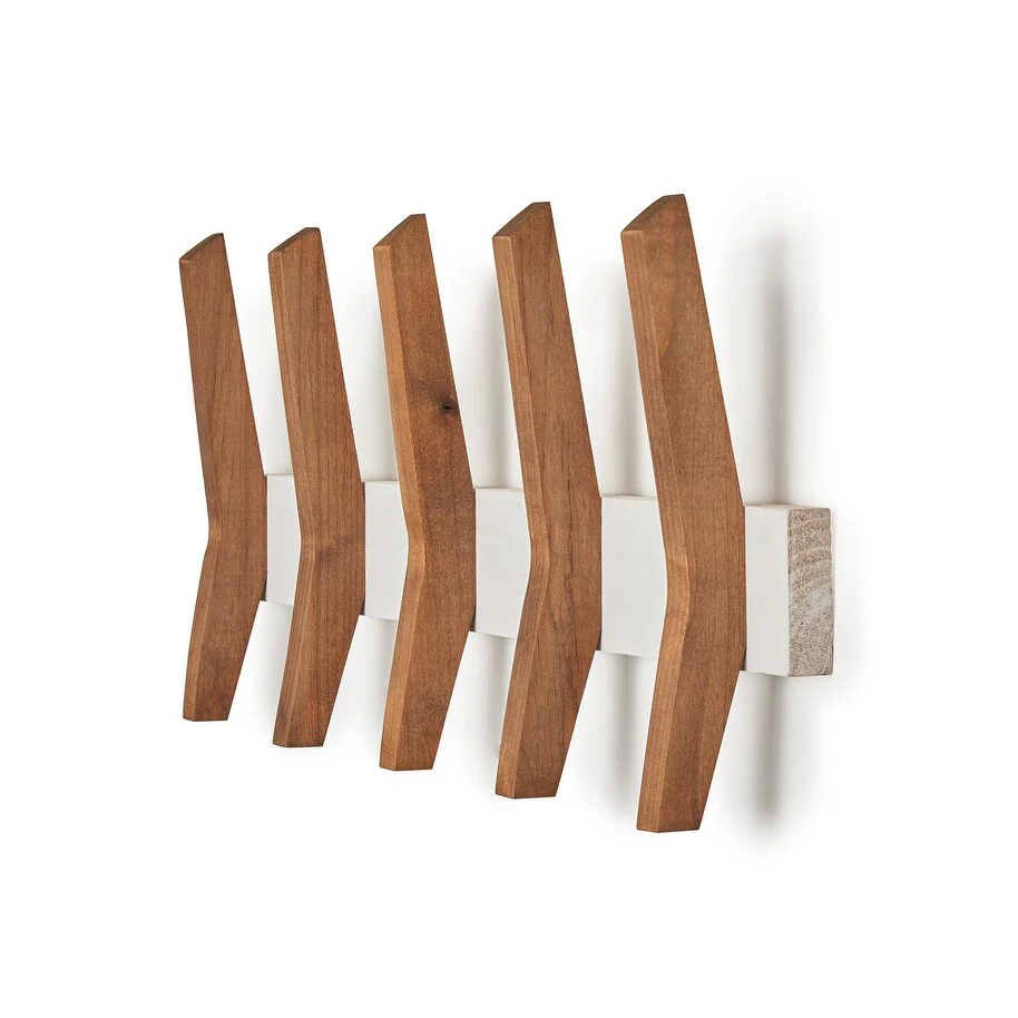 DRAKESTONE mid-century-inspired hook rack made with solid knotty adler wood adds a stylish statement to any entryway, foyer, or bathroom. Organize your hats, coats, and accessories, or use it as a towel rack in your bathroom. The keyhole slots allow easy hanging, a flush wall mount, and sturdy support.