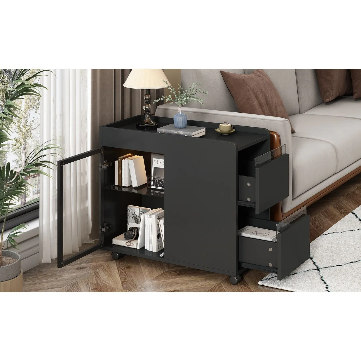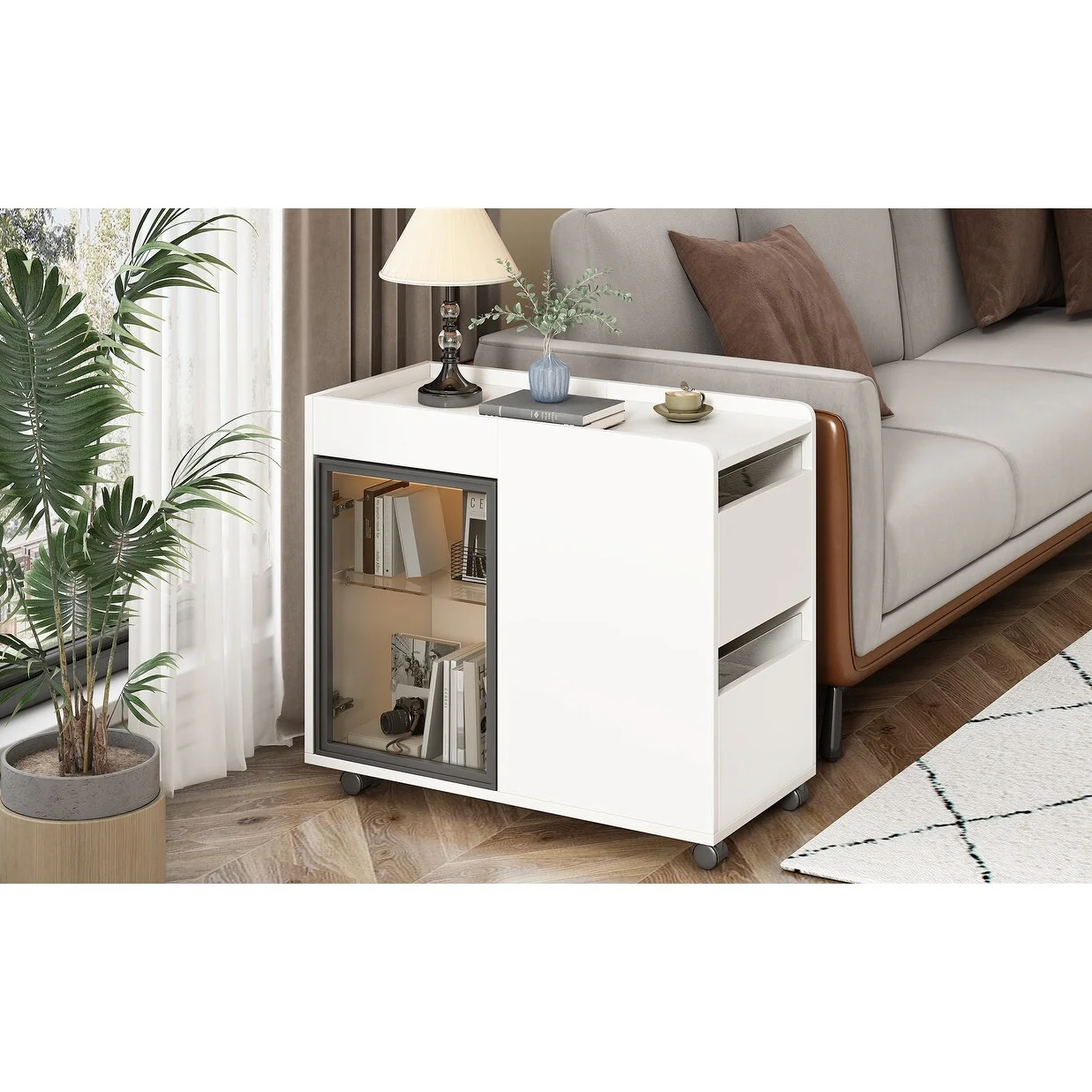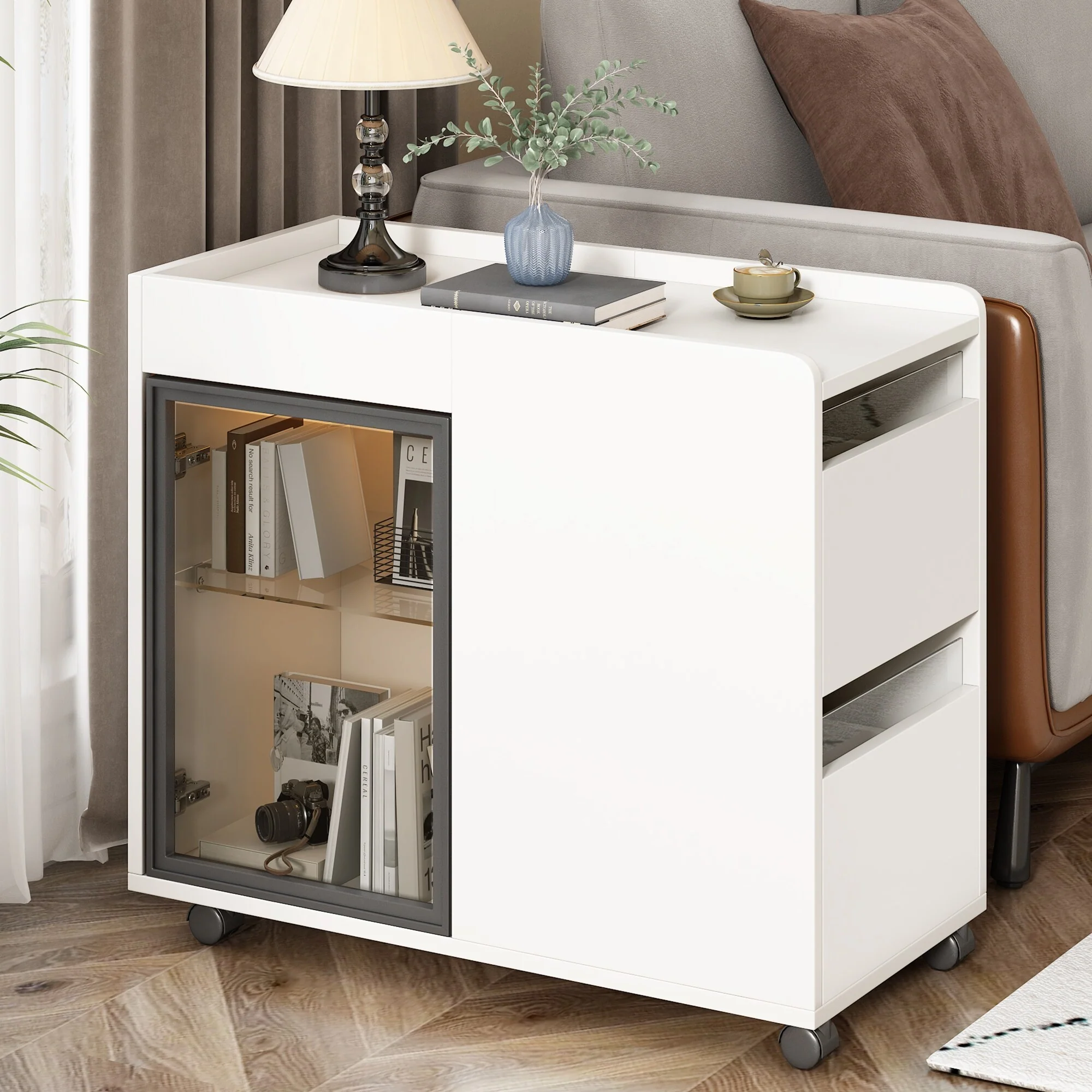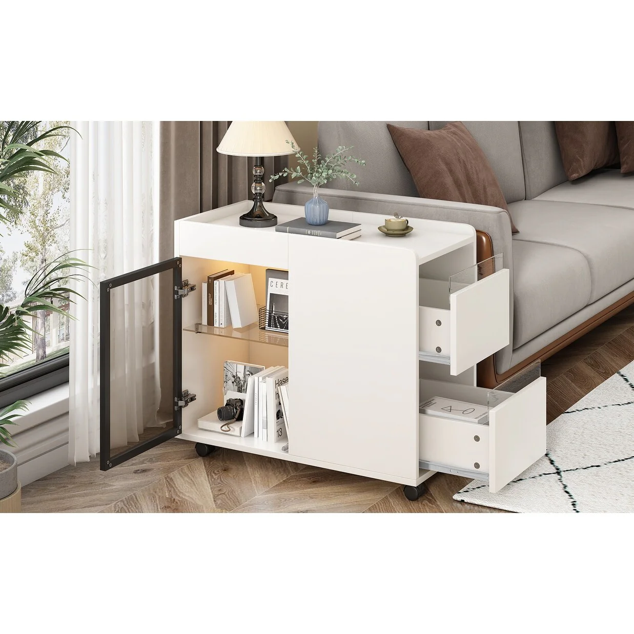 Discover the epitome of contemporary design blended with groundbreaking functionality in our modern LED end table. It promises not only to fulfill your storage and display needs but also to enhance the aesthetics and functionality of your space. With lockable wheels, it can be easily adjusted to suit your mood and moved to anywhere. The end table comes with a built-in shelf, drawers and a spacious apron design top which can provide plenty of storage space.When you're hosting a gathering with friends or enjoying a quiet time alone, this end table brings a touch of modernity and convenience to your living room.