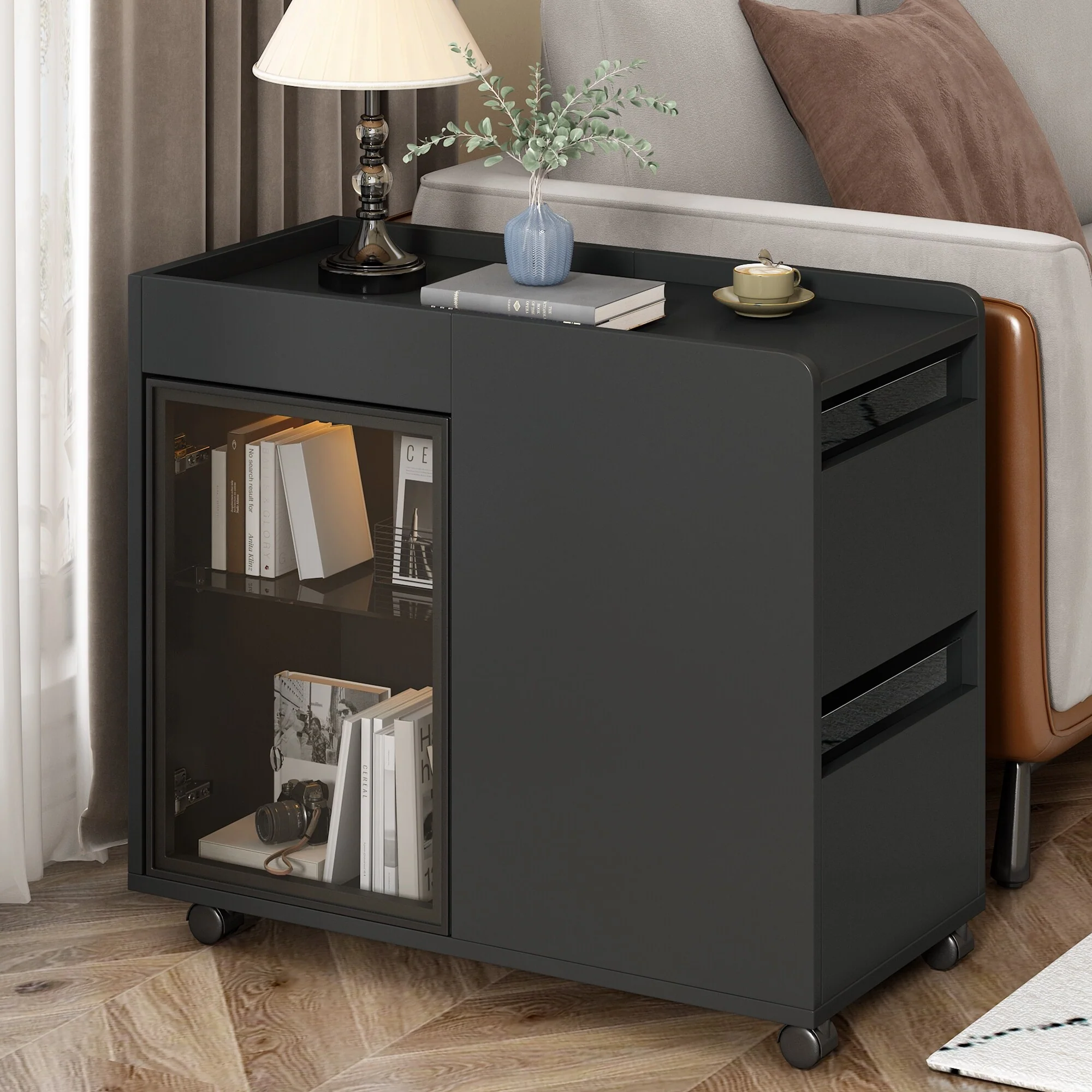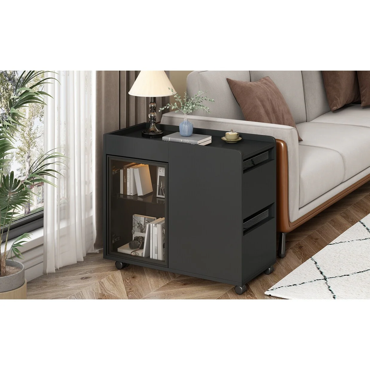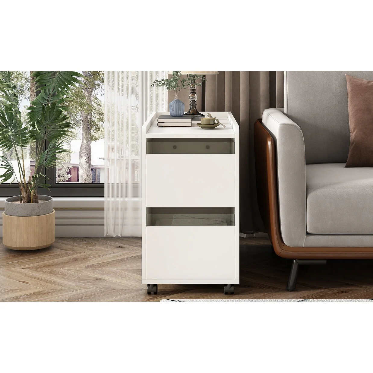 Discover the epitome of contemporary design blended with groundbreaking functionality in our modern LED end table. It promises not only to fulfill your storage and display needs but also to enhance the aesthetics and functionality of your space. With lockable wheels, it can be easily adjusted to suit your mood and moved to anywhere. The end table comes with a built-in shelf, drawers and a spacious apron design top which can provide plenty of storage space.When you're hosting a gathering with friends or enjoying a quiet time alone, this end table brings a touch of modernity and convenience to your living room.
