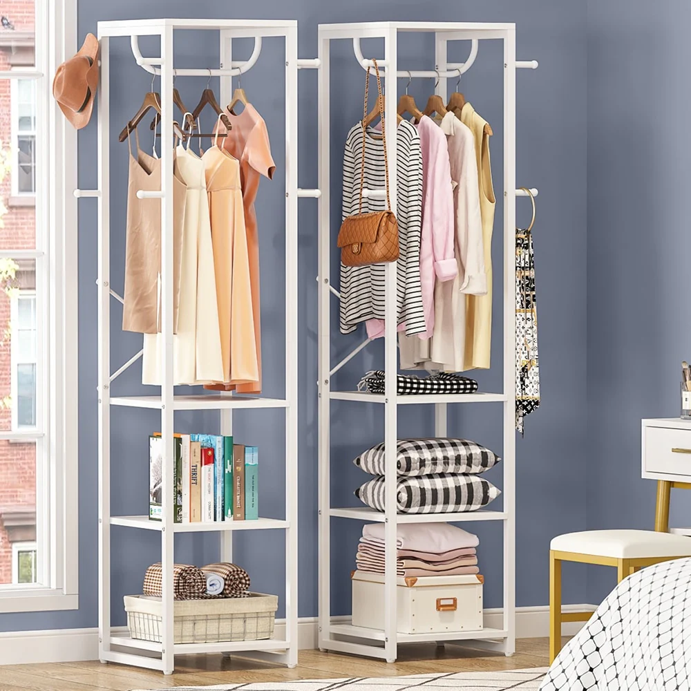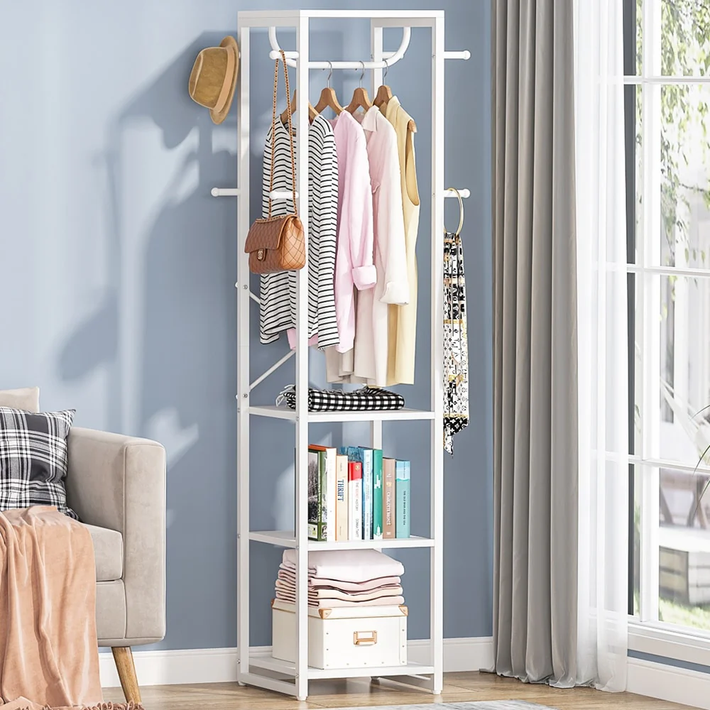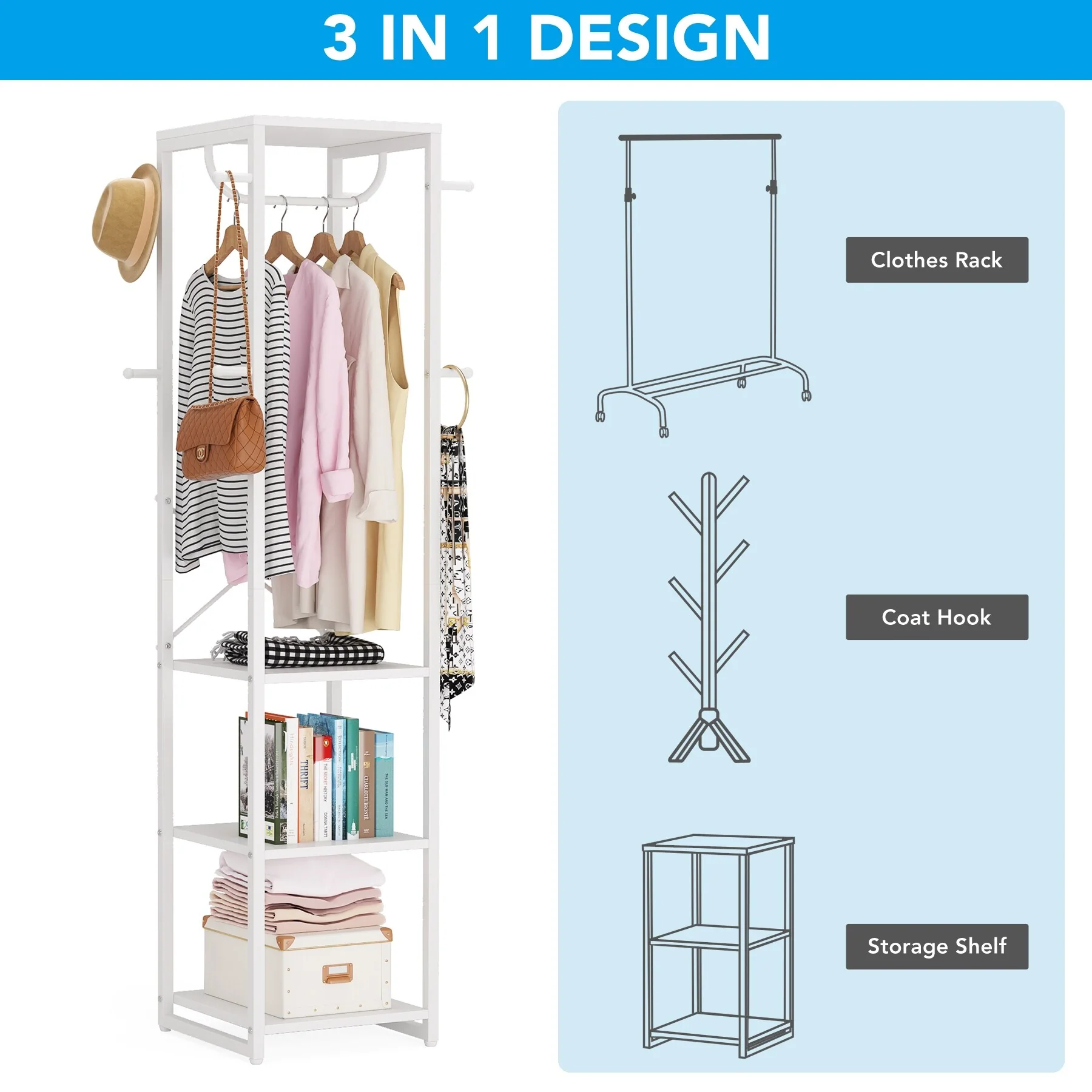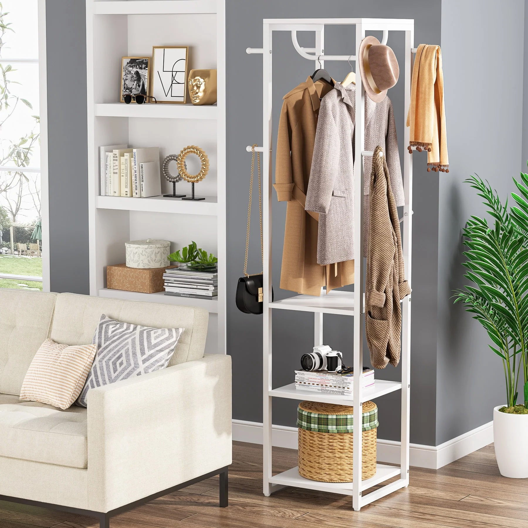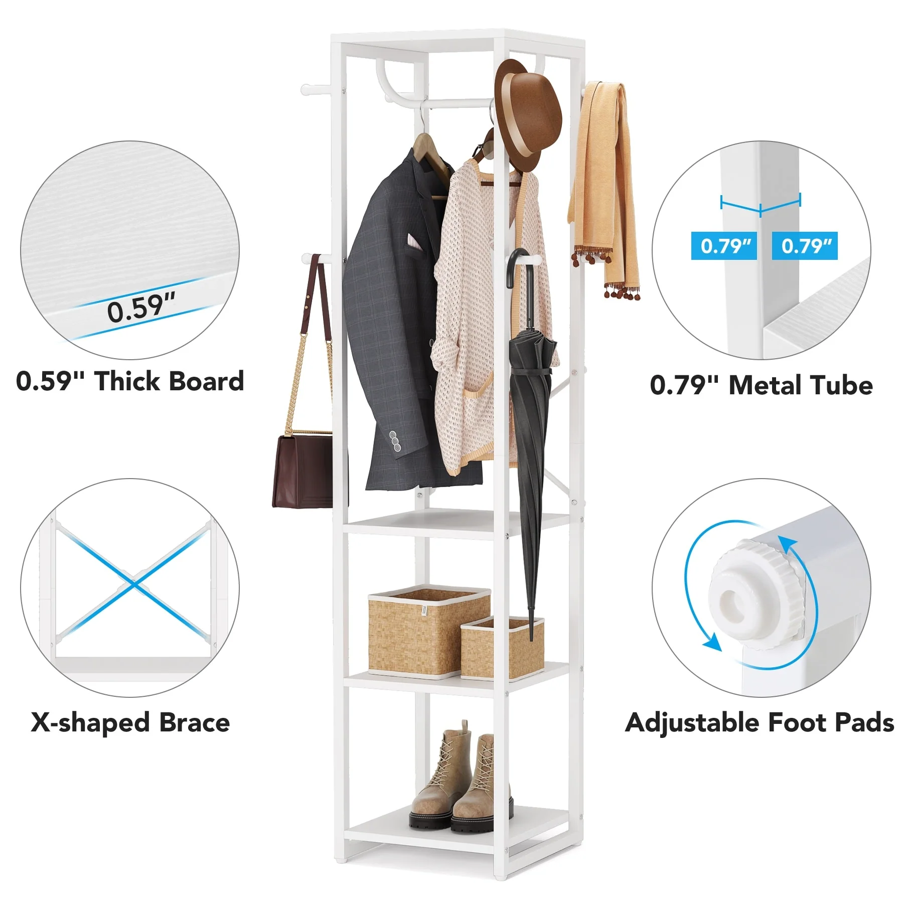 - 4 tier shelves perfect for shoes, bag and daily essentials, while up top, 8 ball-end hooks and a hanging rod provide an extra convenient place to hold your coats, hats, scarf or tote bags neatly