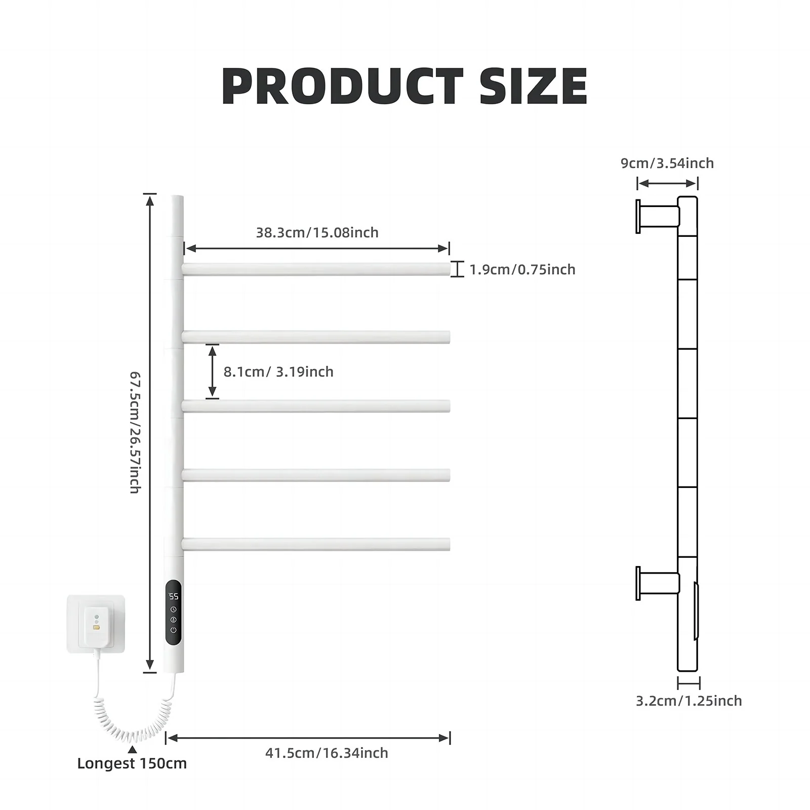 This smart heated towel rack rotates 180 ° Not only can you adjust the temperature, but you can also time it. You can also use a one-touch thermostat for convenience. Flat bar design for a larger heating area. This Smart Heated Towel Rack will not only provide you with warm towels, but also add modernity and convenience to your bathroom. Enhance your showering experience by enjoying warm, soft towels whether it's a cold winter day or a wet one.