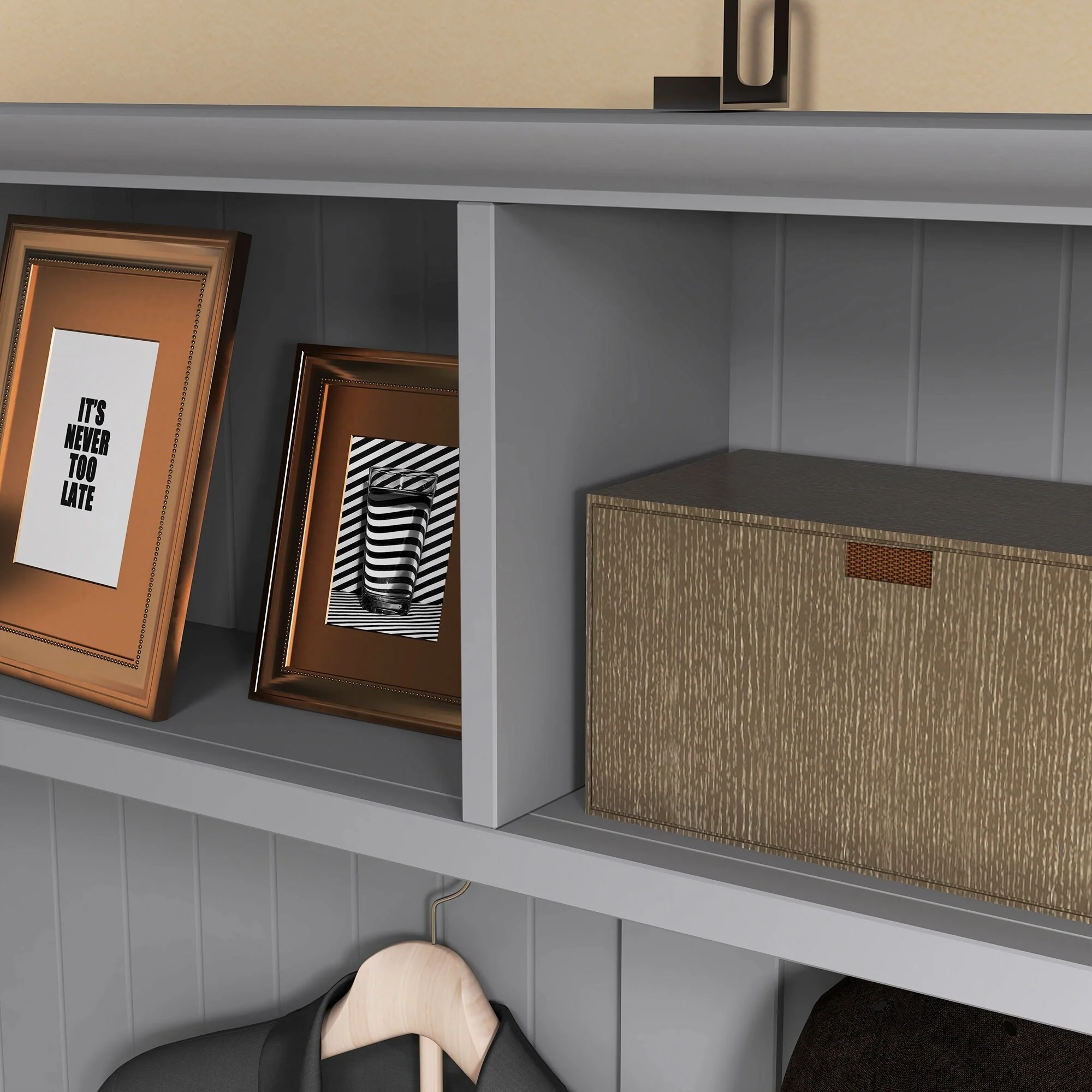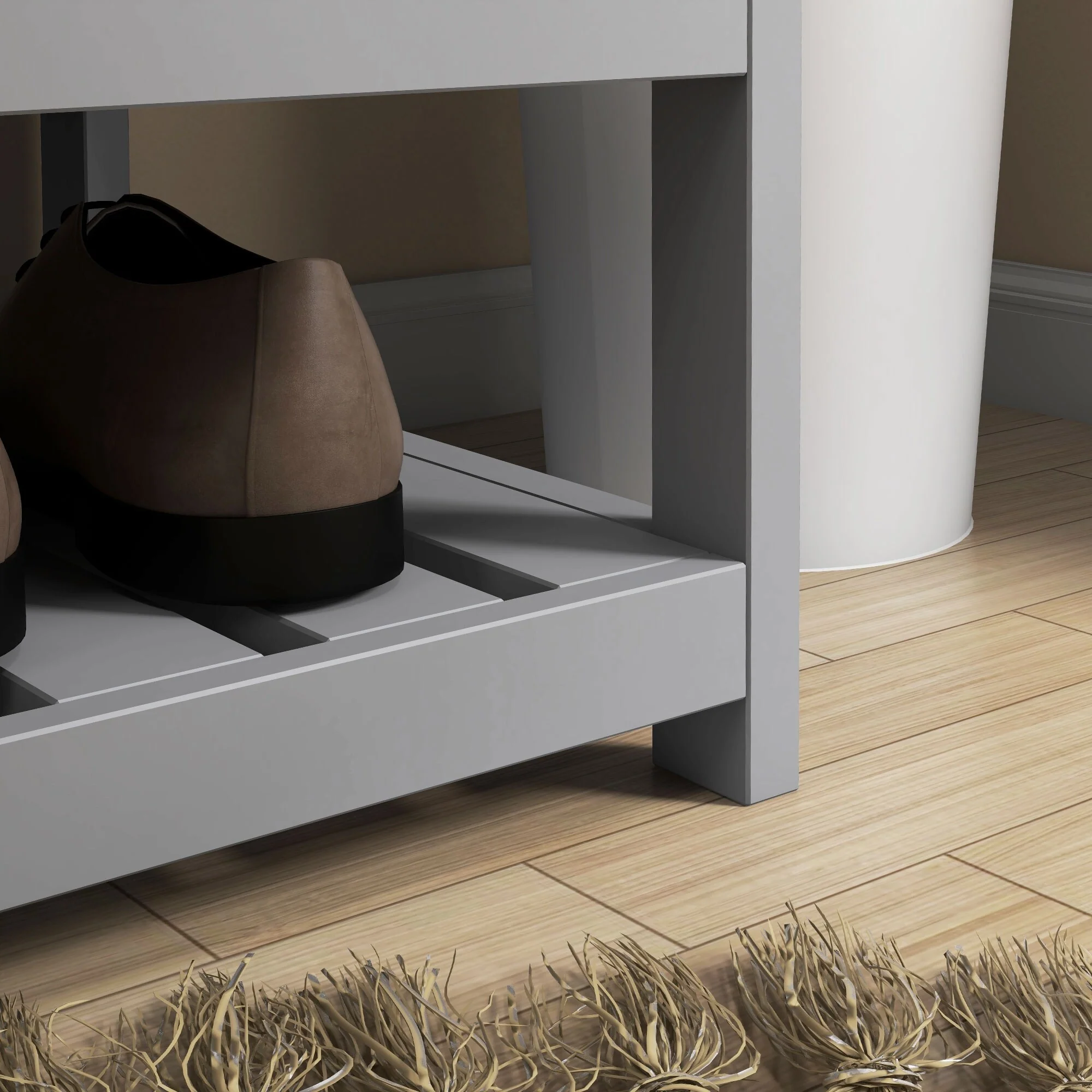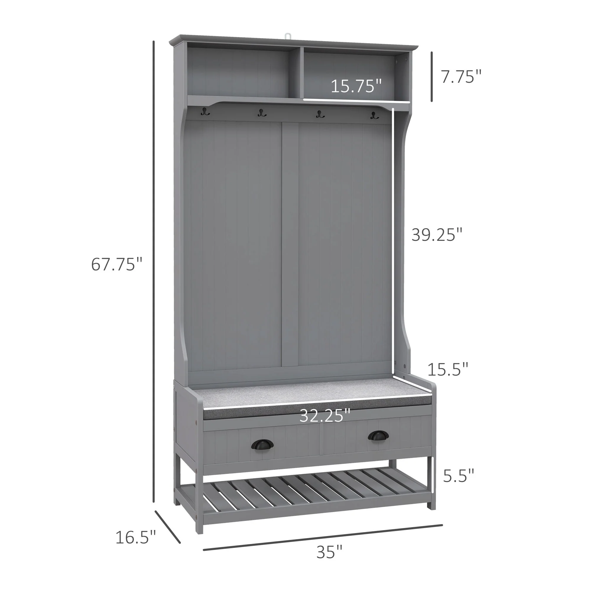 ● Elevated base keep away from damp and allows easy clean-upSpecification:● Color: Gray - Material: MDF - Overall Dimension: 35' L x 16.5' W x 67.75' H - Top Storage Shelf (single): 15.75' W x 5.75' D x 7.75' H - Bench Dimensions: 32.25' W x 15.5' D - Cushion Size: 31.5' W x 15.5' D x 1' T - Drawer Size: 14.5' W x 10.75' D x 2.75' H - Bottom Shelf Size: 32.25' L x 15' W x 5.5' H - Weight Capacity: 286lbs (bench), 11lbs (hook), 11lbs (drawer), 22lbs (bottom shelf) - Assembly Required