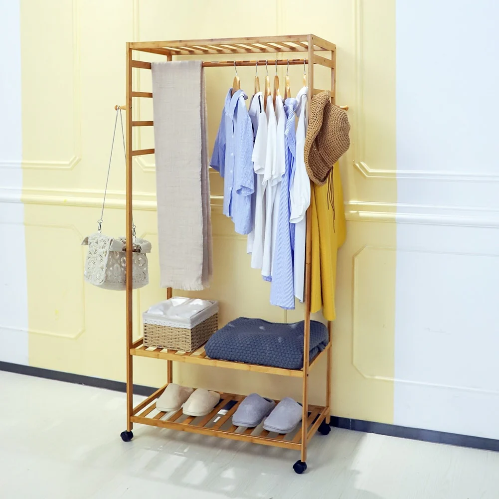 Organize your wardrobe in style with this 3-tier rolling clothes garment rack made of solid natural wood. With a hanging rod, side hanging hooks, and 2 shelves, you can easily store and access all your clothing, shoes, bags, and scarfs. The rack also comes with 4 rolling wheels for easy movement and a lockable wheel to keep it in place. Its heavy-duty construction ensures a clean and tidy organized space that you've always wanted.