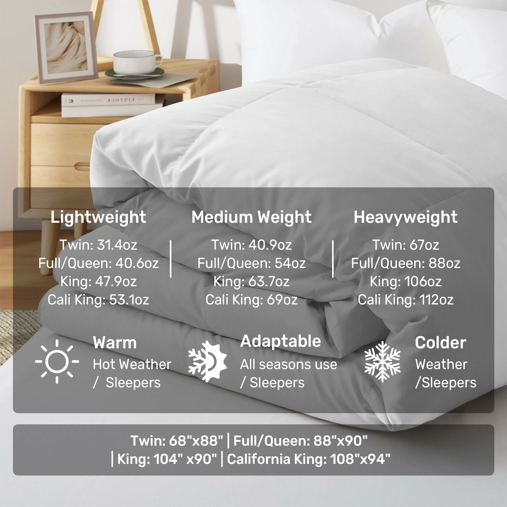 - KING: 104' x 88', fill weight: 47.9 oz