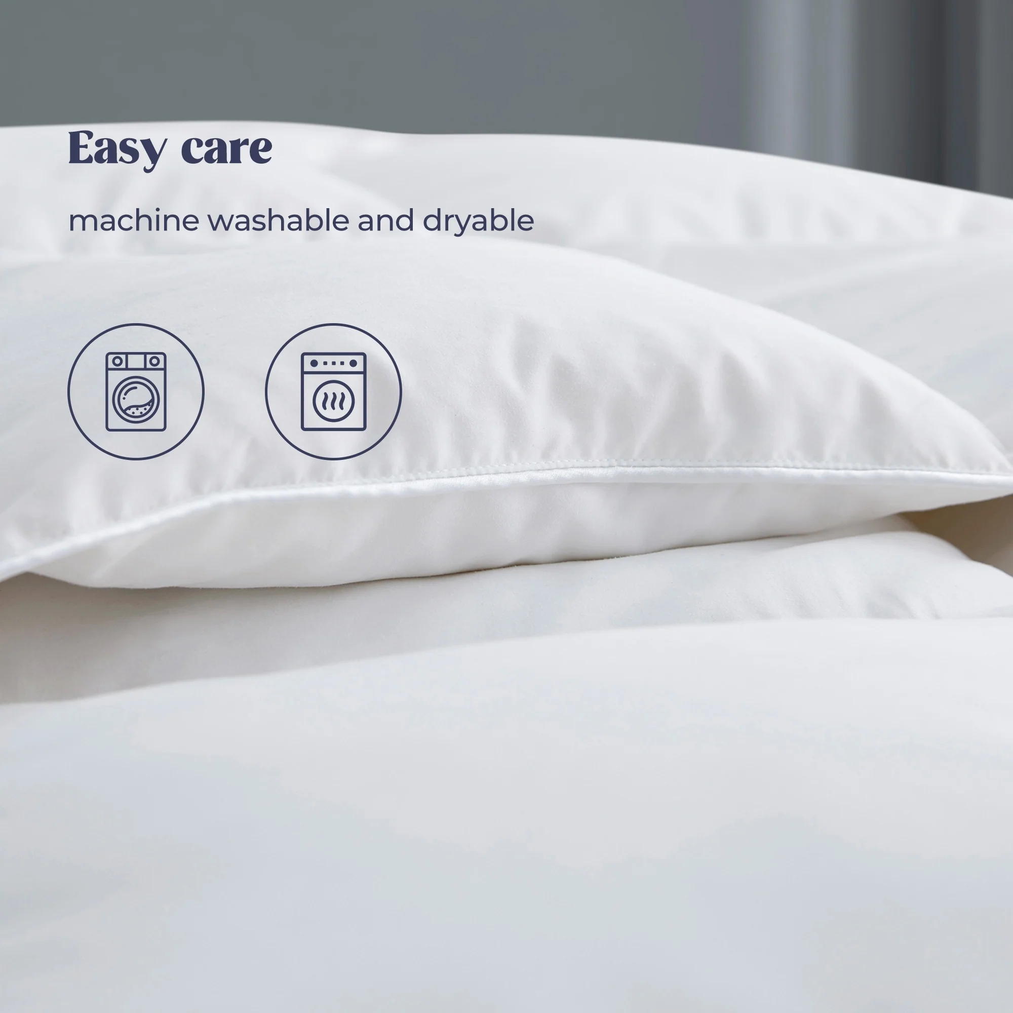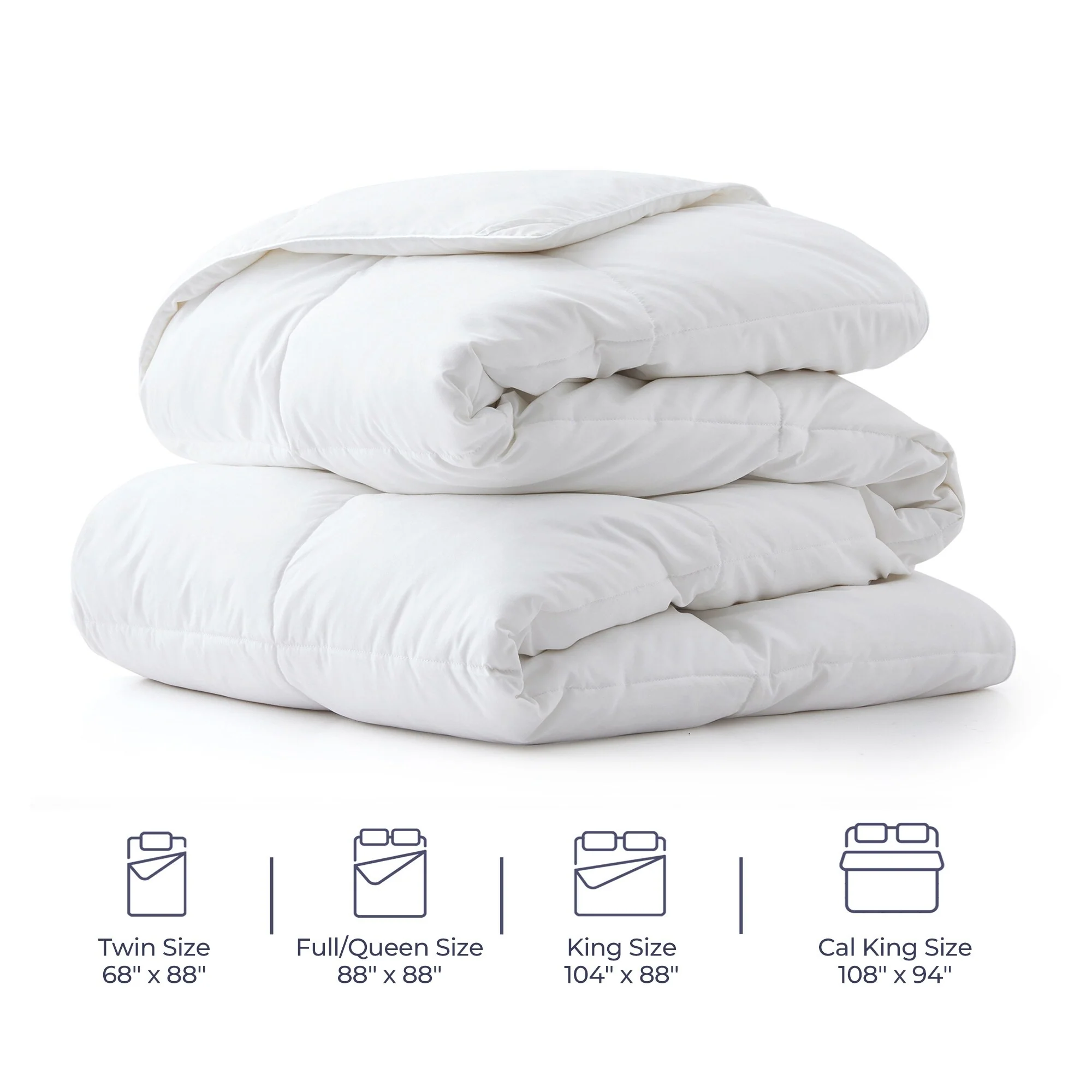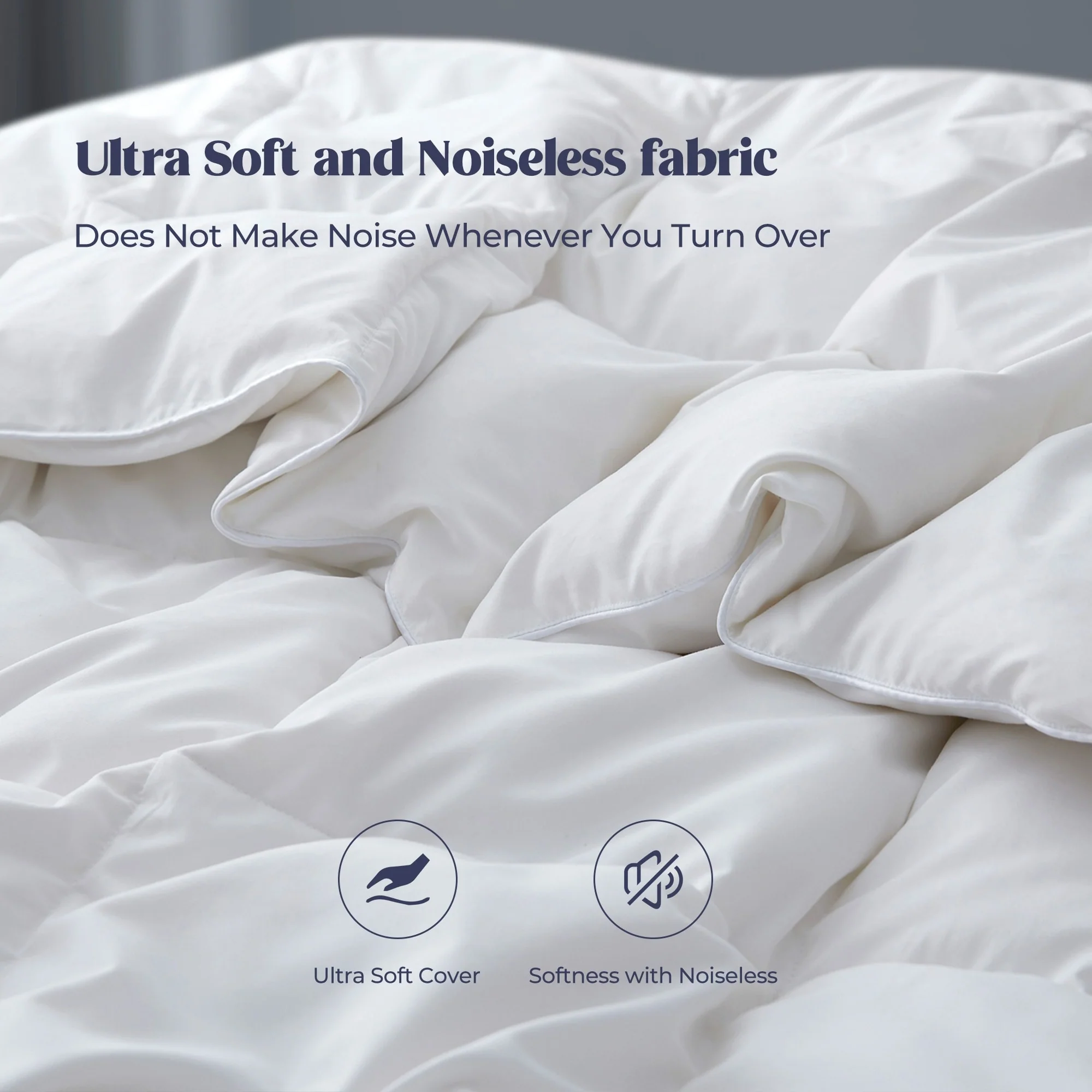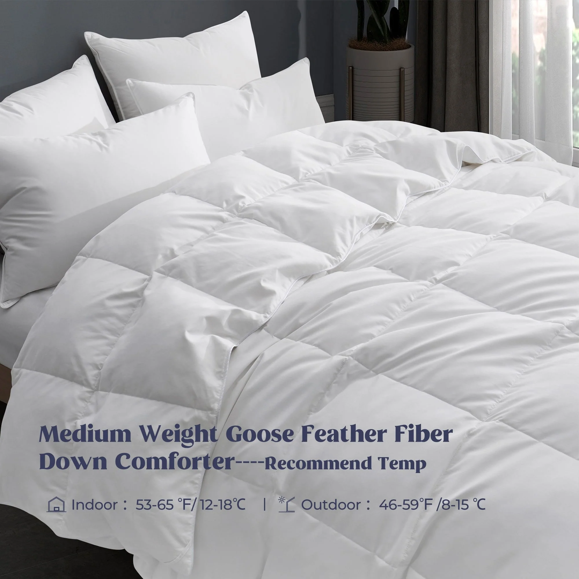 Luxury soft and comfortable comforter, this comforter will keep you cozy and deep sleep during the whole night. Featured with soft and breathable polyester cotton blend cover and premium filling of 5% white goose down and 95% white goose feather make the comforter that is medium weight and provides a consistent temperature year-round. Sewn-through construction prevents the filling from shifting and makes the filling evenly distributed. This all-season white goose feather comforter keeps a fitted warm temperature.