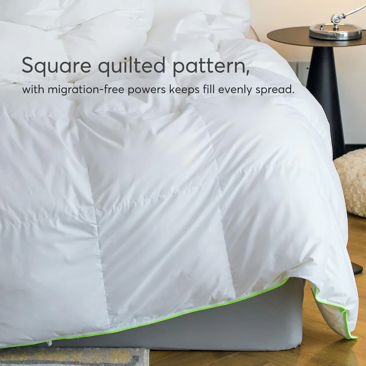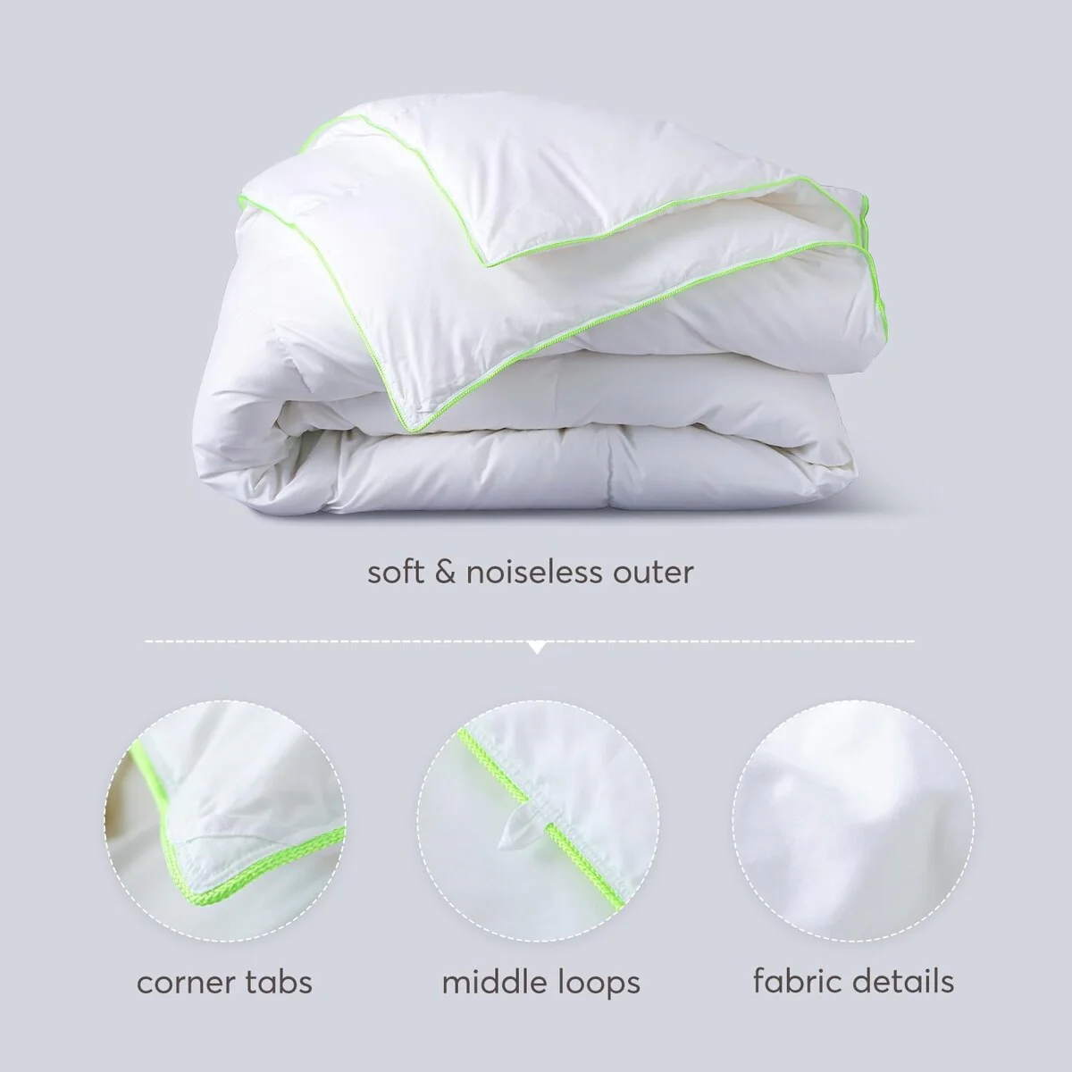 - SOFT COZY COMFORTER - A feather down comforter that is made of an ultra-soft 400 Thread Count poly-cotton breathable fabric. The plush, and silk touch fabric comforter includes 8 corner tabs make it easy to attach to your duvet cover. Plus, the noiseless design means you won't be disturbed during a good night sleep.