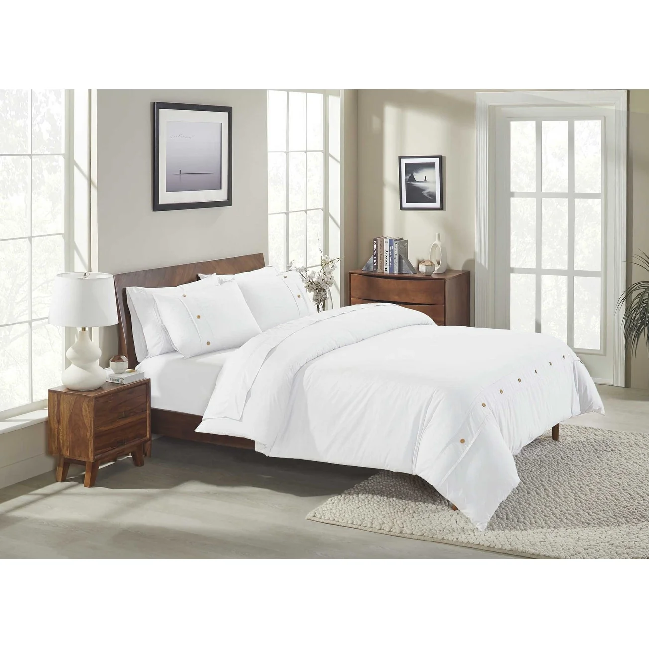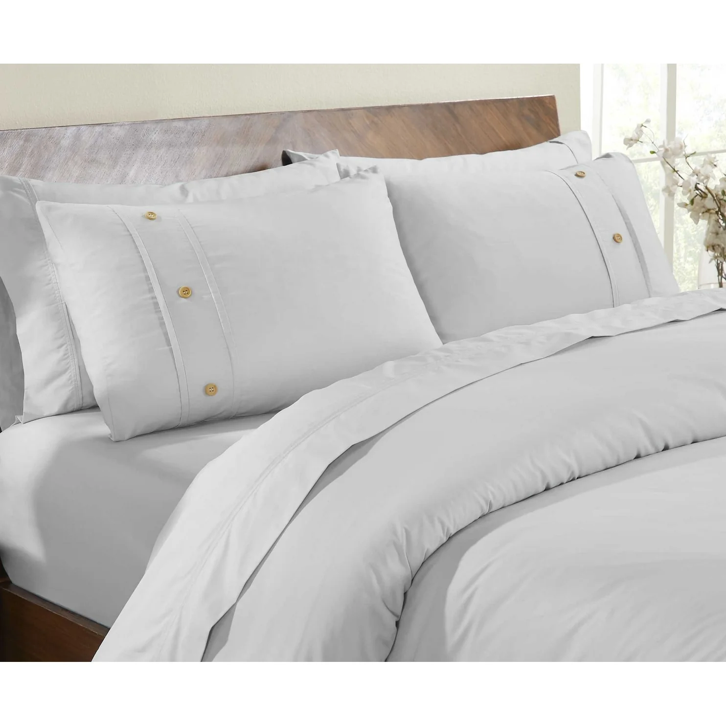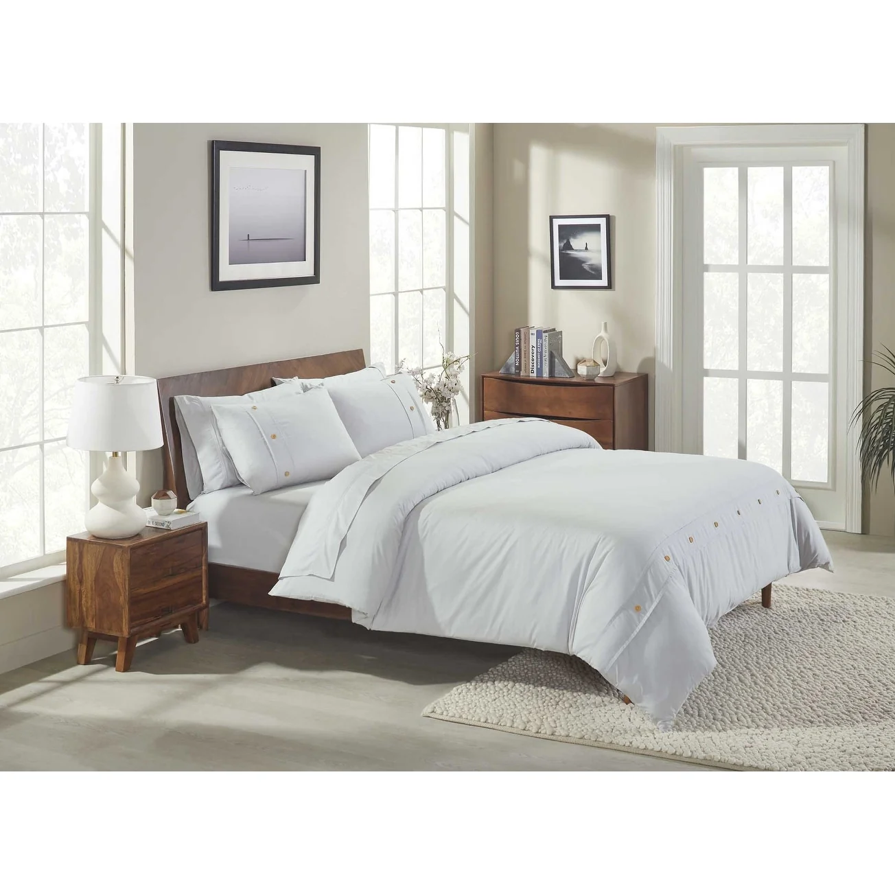 Drift into a peaceful slumber with the Superior Gina Organic Cotton Duvet Cover Set. This duvet cover set is crafted from organic cotton, making it lightweight and breathable to give you a cozy place to relax. Offering a wonderfully soft foundation, this luxurious duvet cover set fastens with hidden buttons to keep your comforter or insert in place. Featuring a percale weave that is crisp and refreshingly cool, this bedding set is the perfect choice for warm sleepers or summer nights. Available in silver and white, you can easily refresh your bedroom style with these soothing color options. This duvet cover displays decorative wooden buttons on the matching pillowcases and the bottom of duvet for an elegant finish to your bed.
