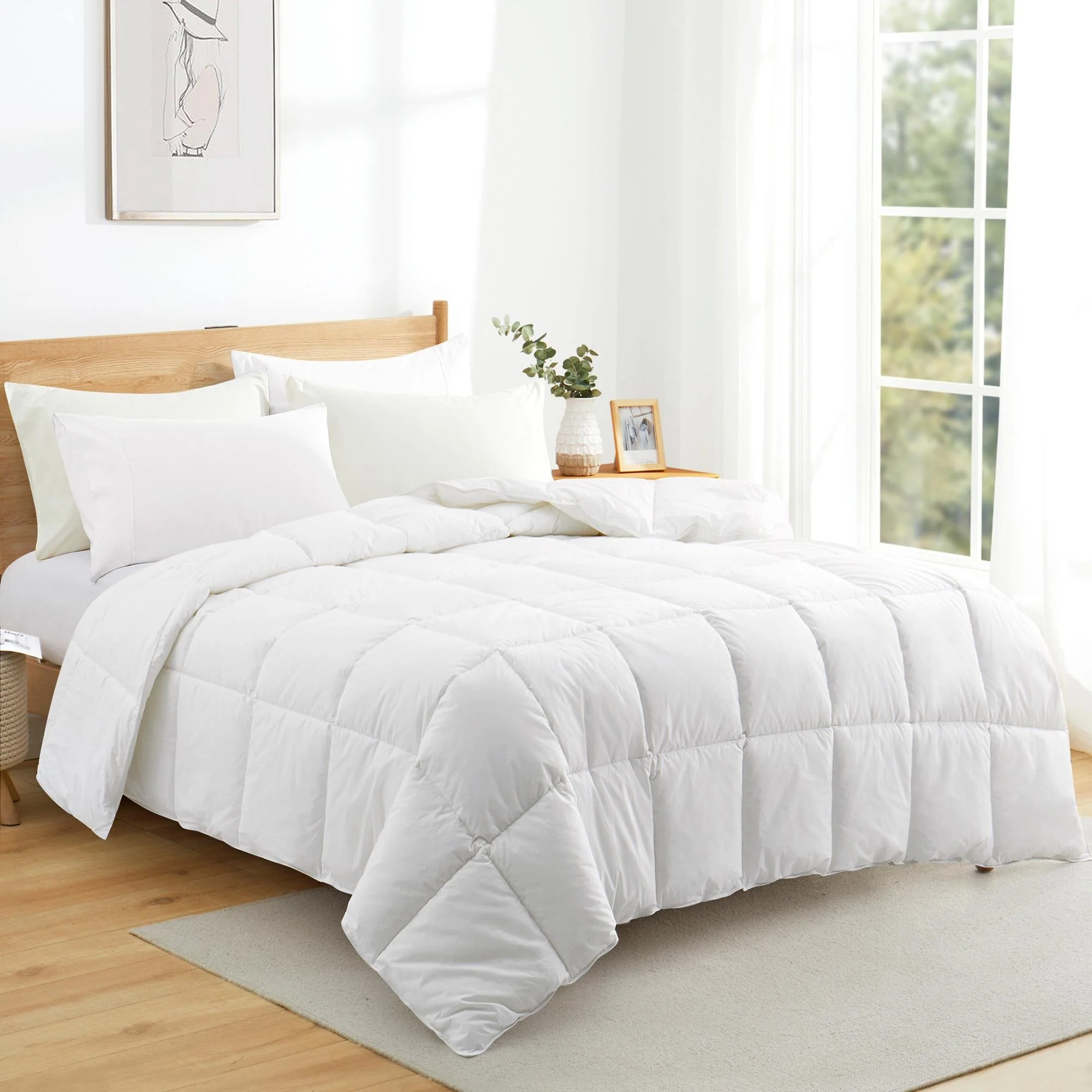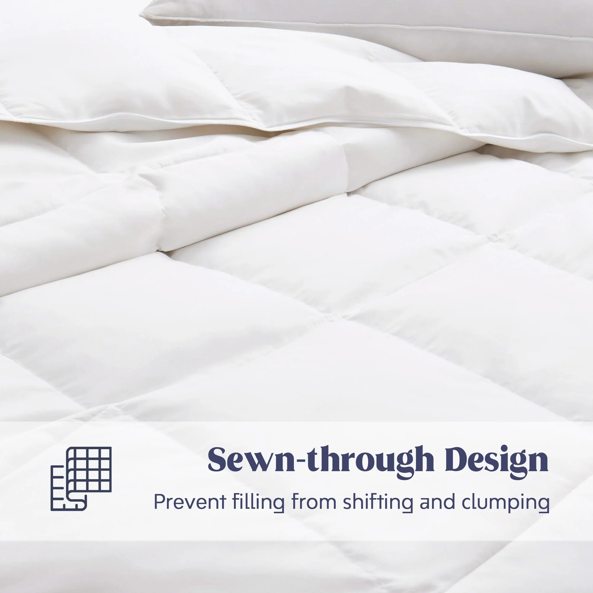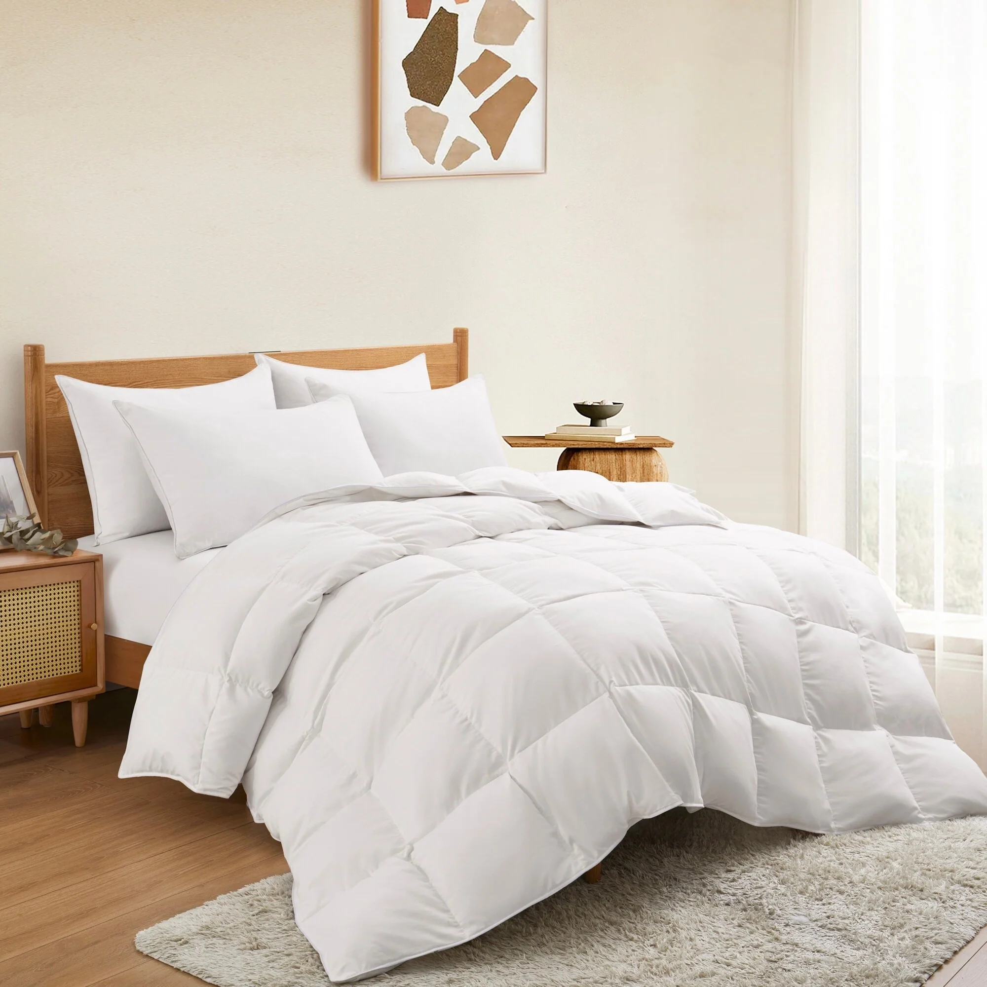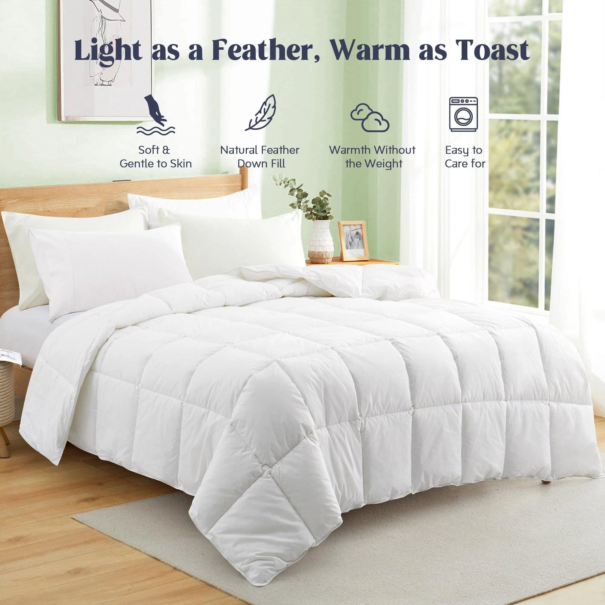 Experience ultimate comfort all year round with our White Feather Fiber Down Comforter. This premium comforter is made with natural white goose feather fiber and white goose down fill, providing a luxurious sleeping experience. The 360 thread count downproof cover ensures durability and softness. The sewn-through box construction allows the filling to expand, while preventing any shifting. Double Needle Stitches provide extra durability, making this comforter a long-lasting addition to your bedding collection. It is also machine washable for easy cleaning, so you can keep it looking like new.