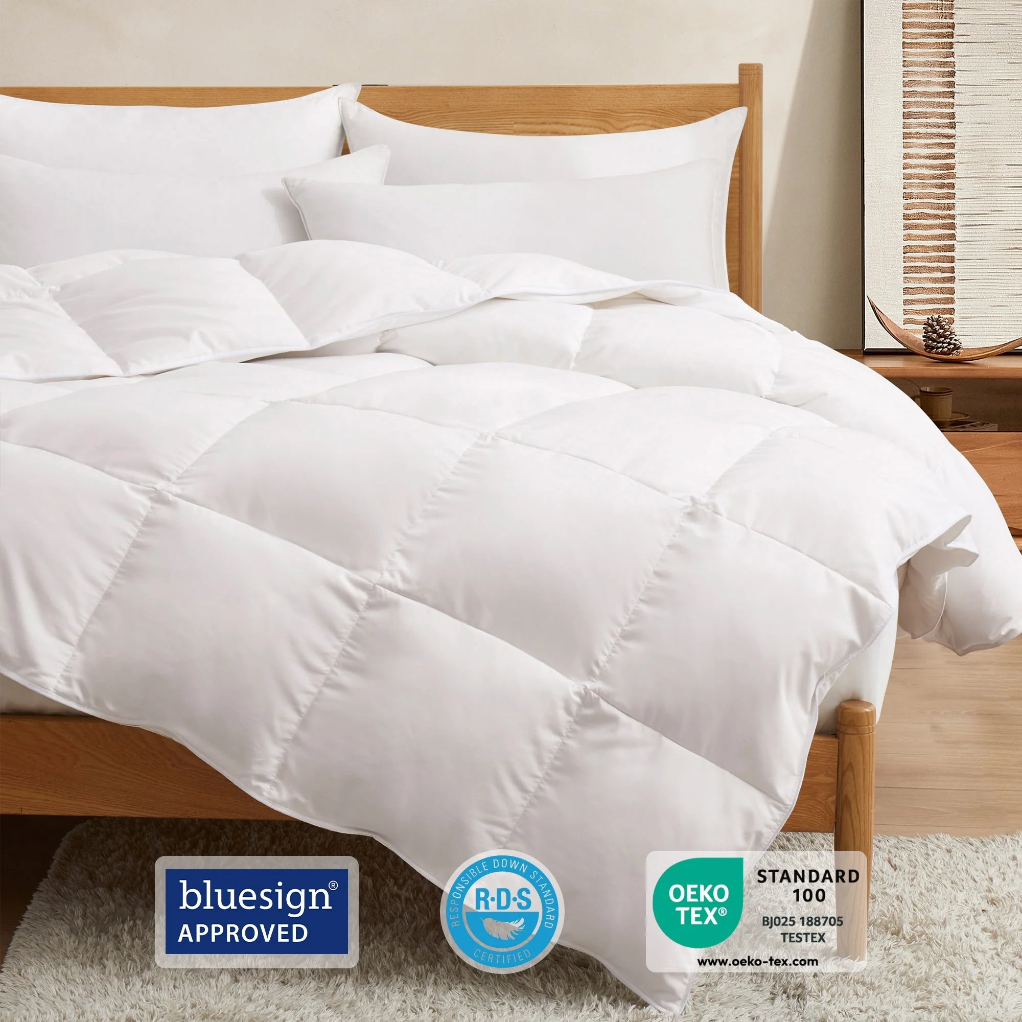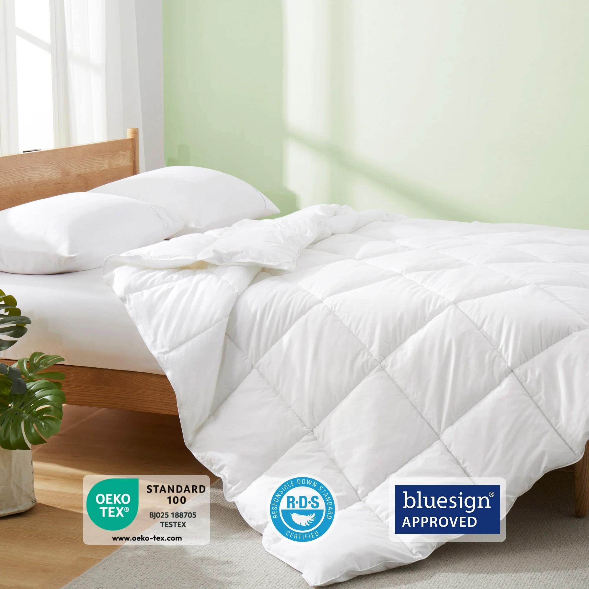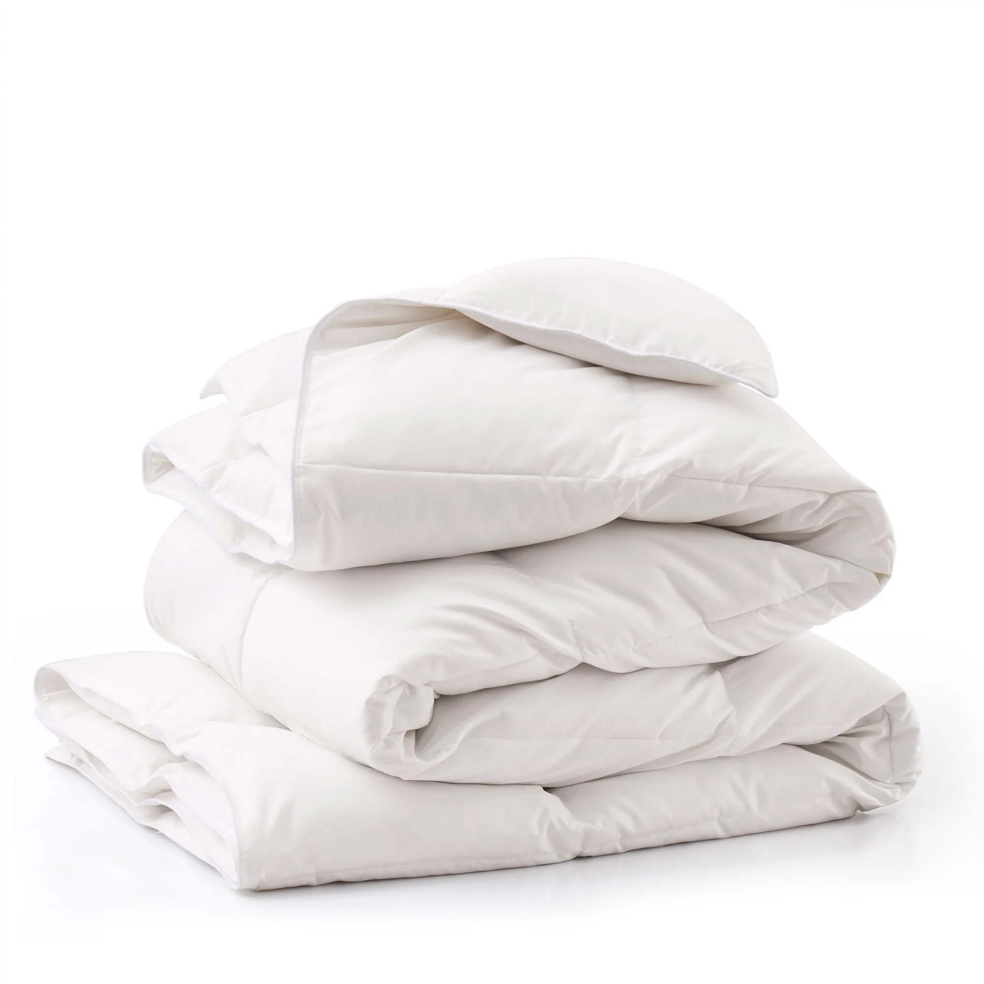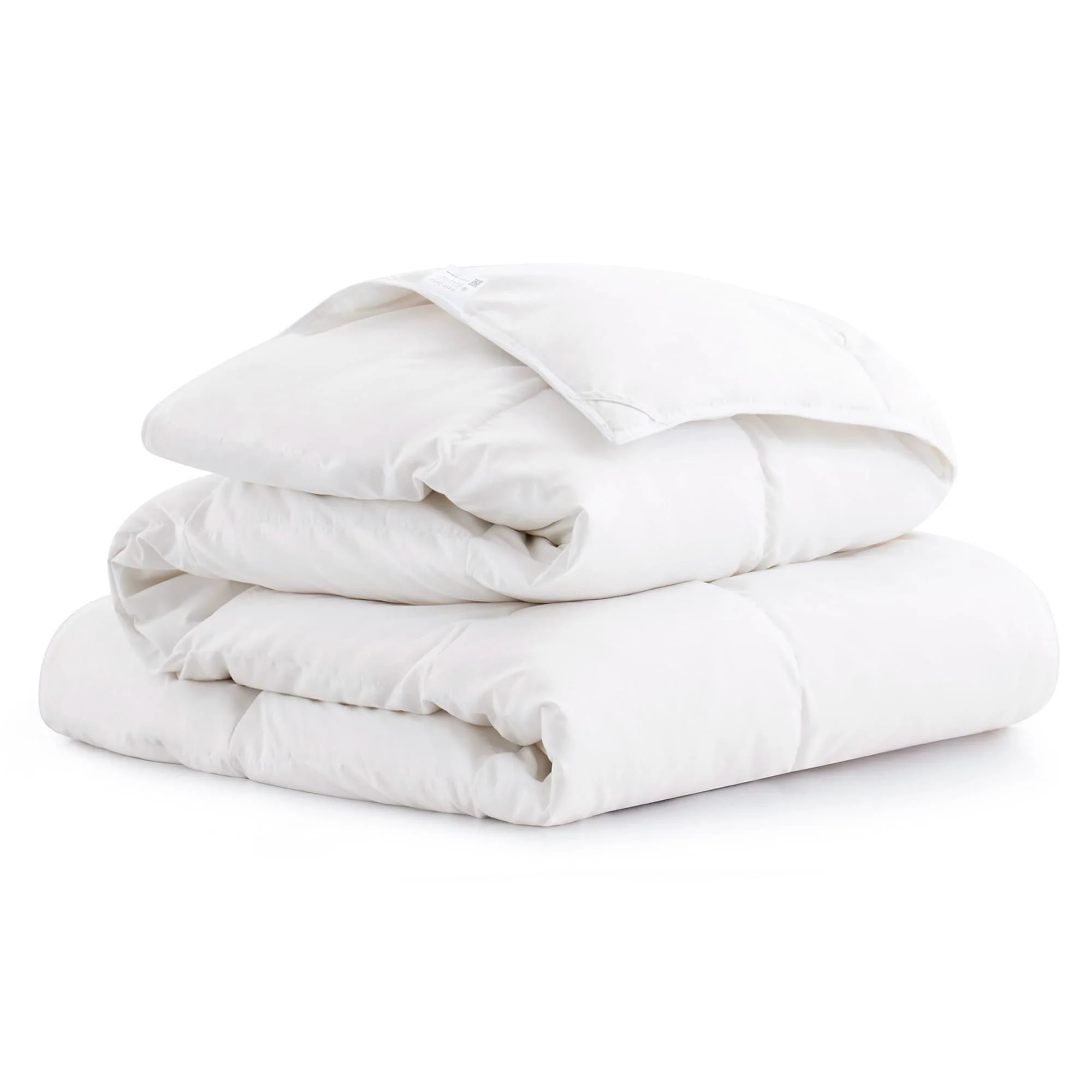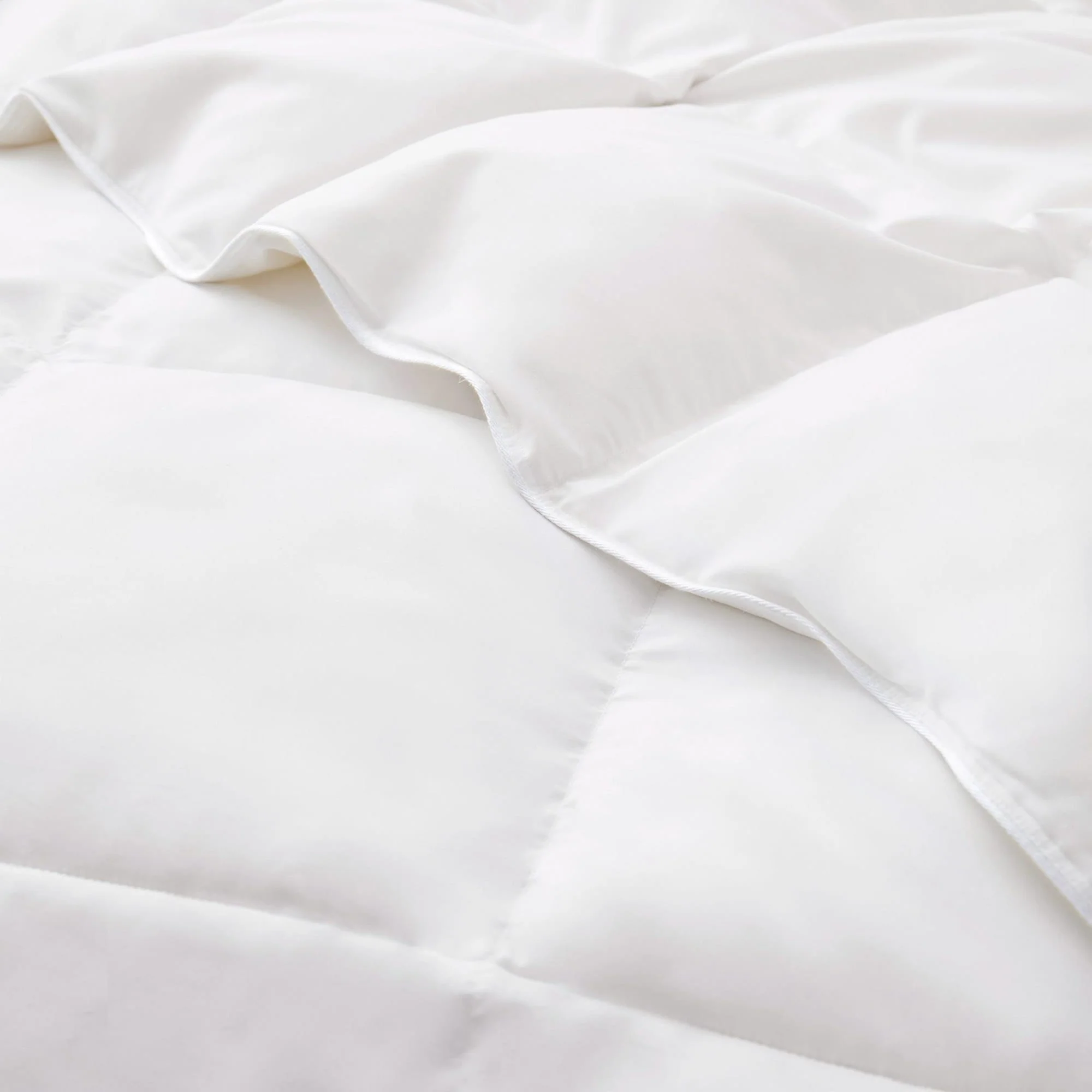 Experience ultimate comfort all year round with our White Feather Fiber Down Comforter. This premium comforter is made with natural white goose feather fiber and white goose down fill, providing a luxurious sleeping experience. The 360 thread count downproof cover ensures durability and softness. The sewn-through box construction allows the filling to expand, while preventing any shifting. Double Needle Stitches provide extra durability, making this comforter a long-lasting addition to your bedding collection. It is also machine washable for easy cleaning, so you can keep it looking like new.