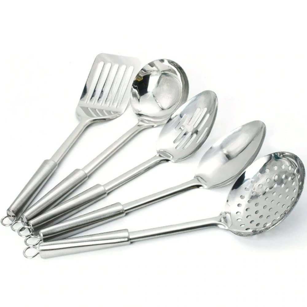 - Versatile Set: The set includes essential utensils for various cooking needs, including a slotted spoon, slotted spatula, soup spoon, regular spoon, and another slotted spoon. This ensures you have the right tool for every cooking task.