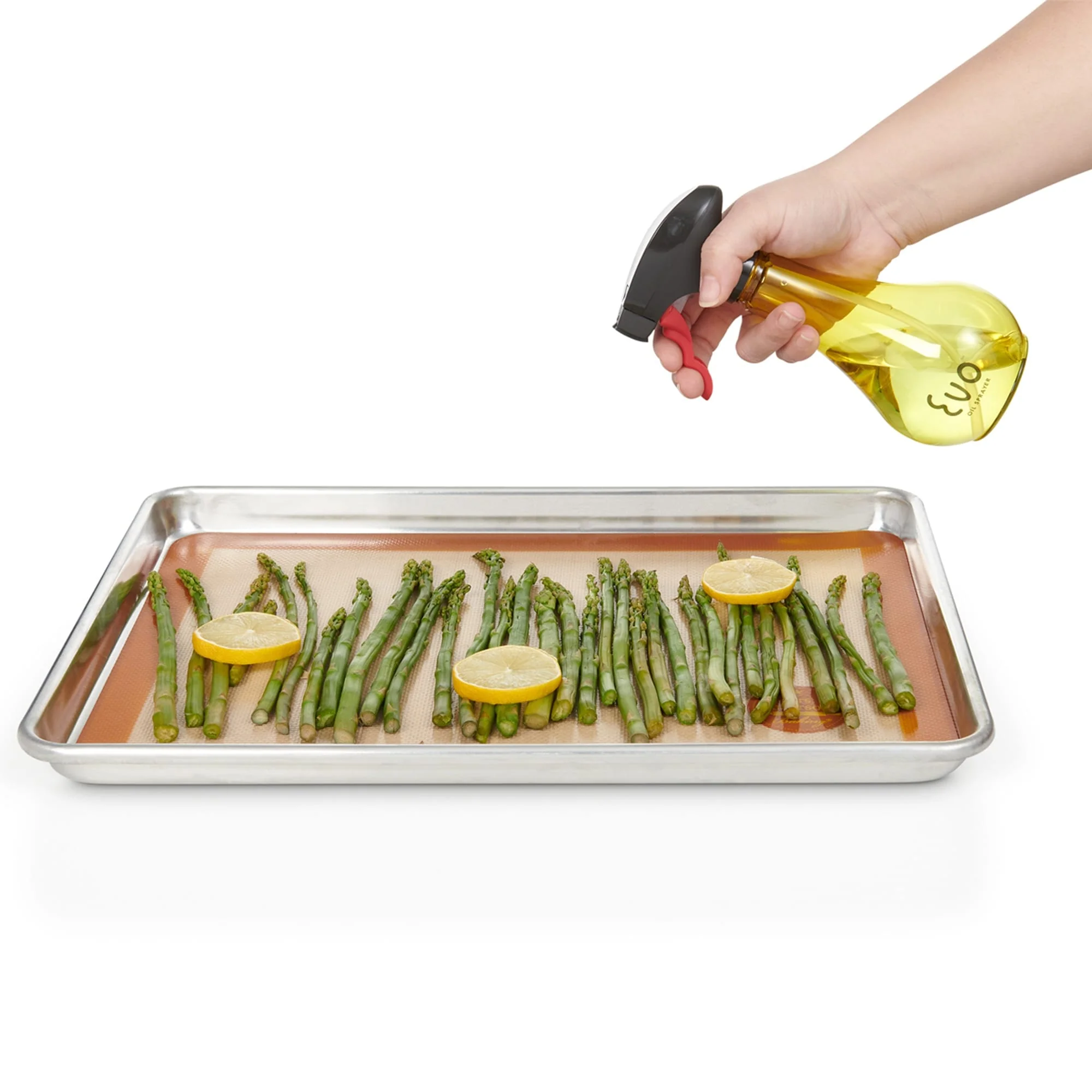 - Evo's Non-Aerosol Oil Sprayer Bottle sprays without harmful propellants or chemicals, require no pumping or priming, and won't get clogged