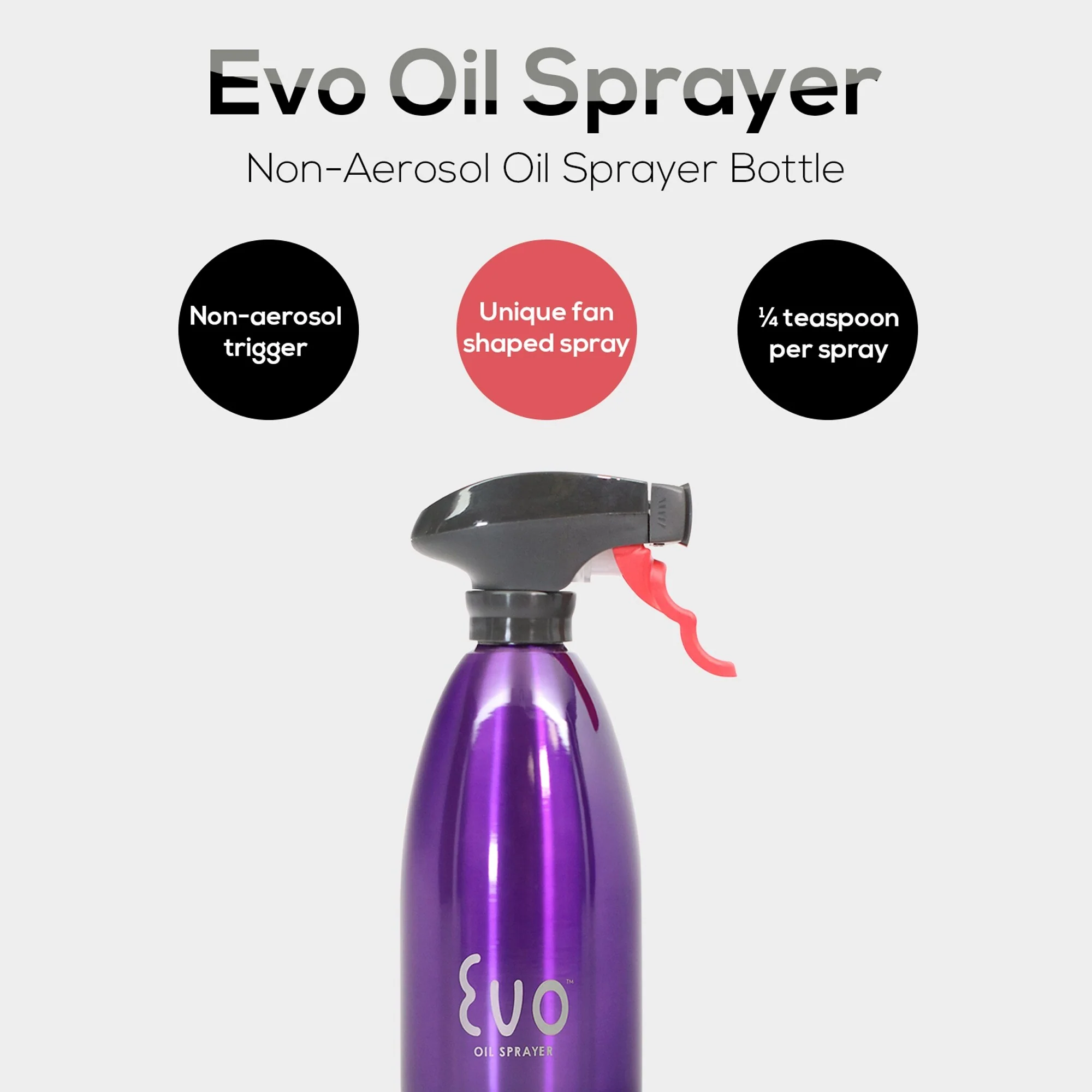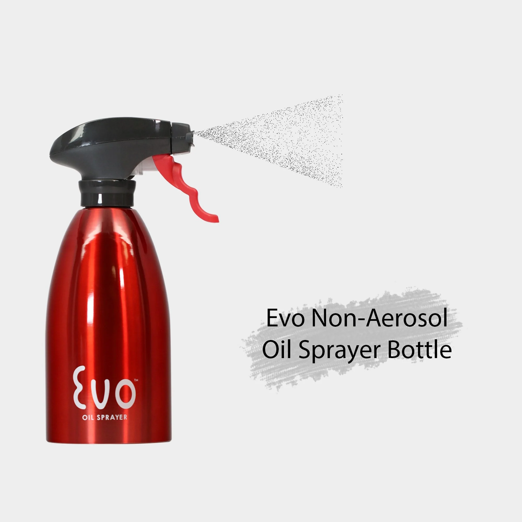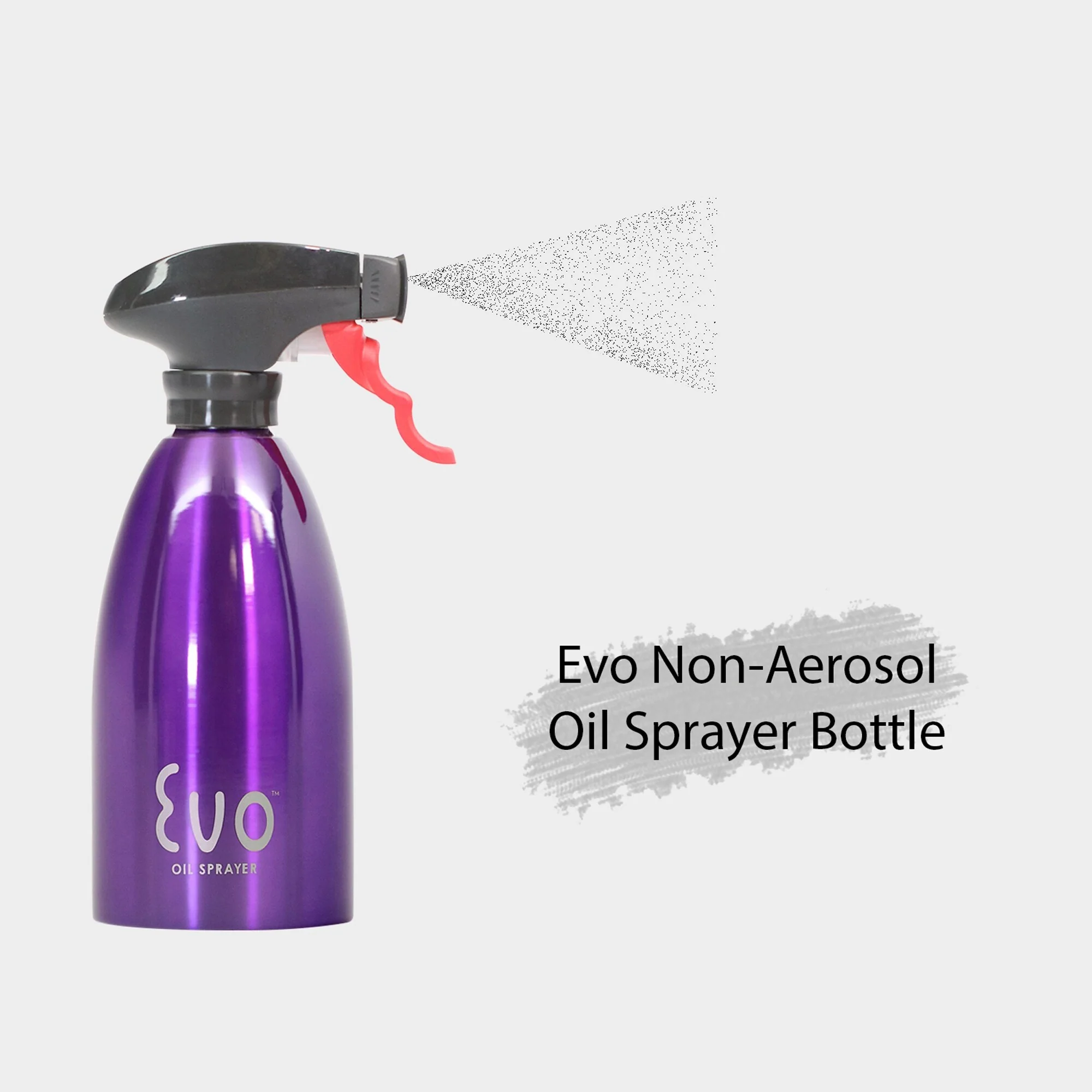 - Evo's Stainless Steel Non-Aerosol Oil Sprayer Bottle sprays without harmful propellants or chemicals, requires no pumping or priming, and won't clog