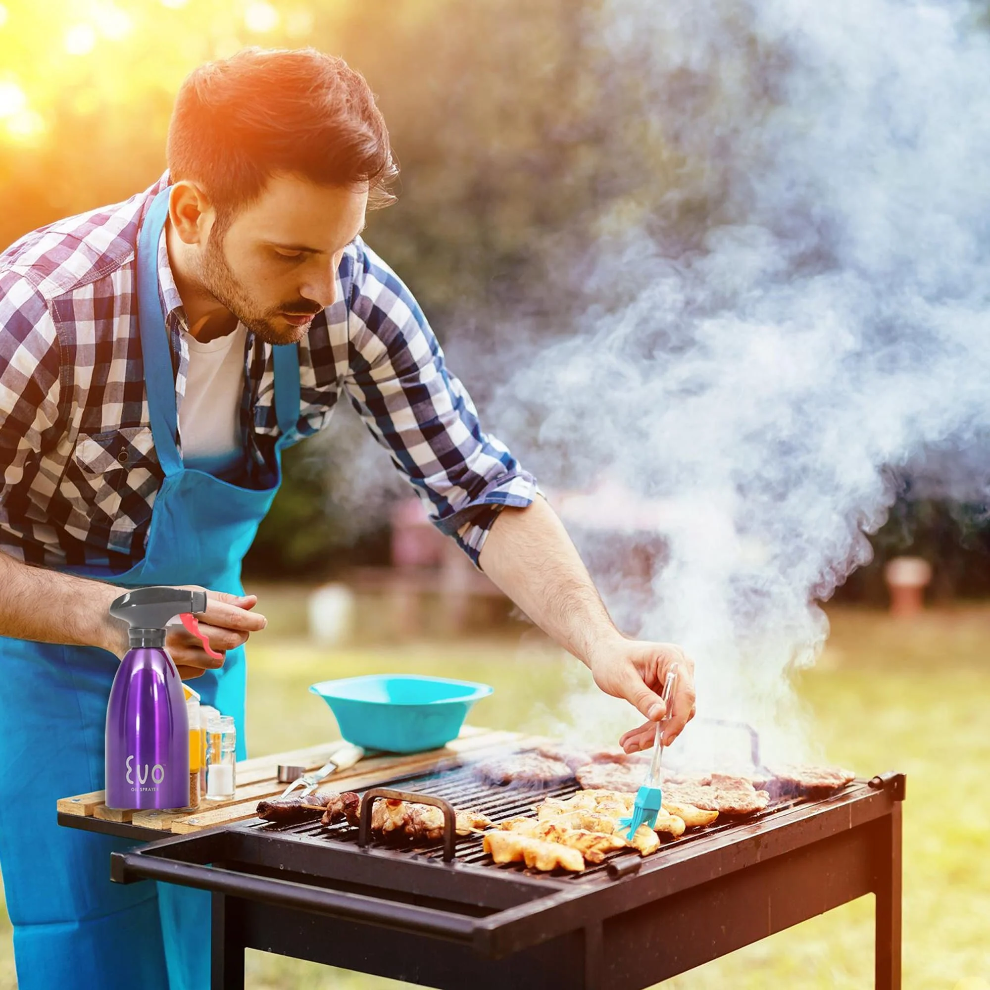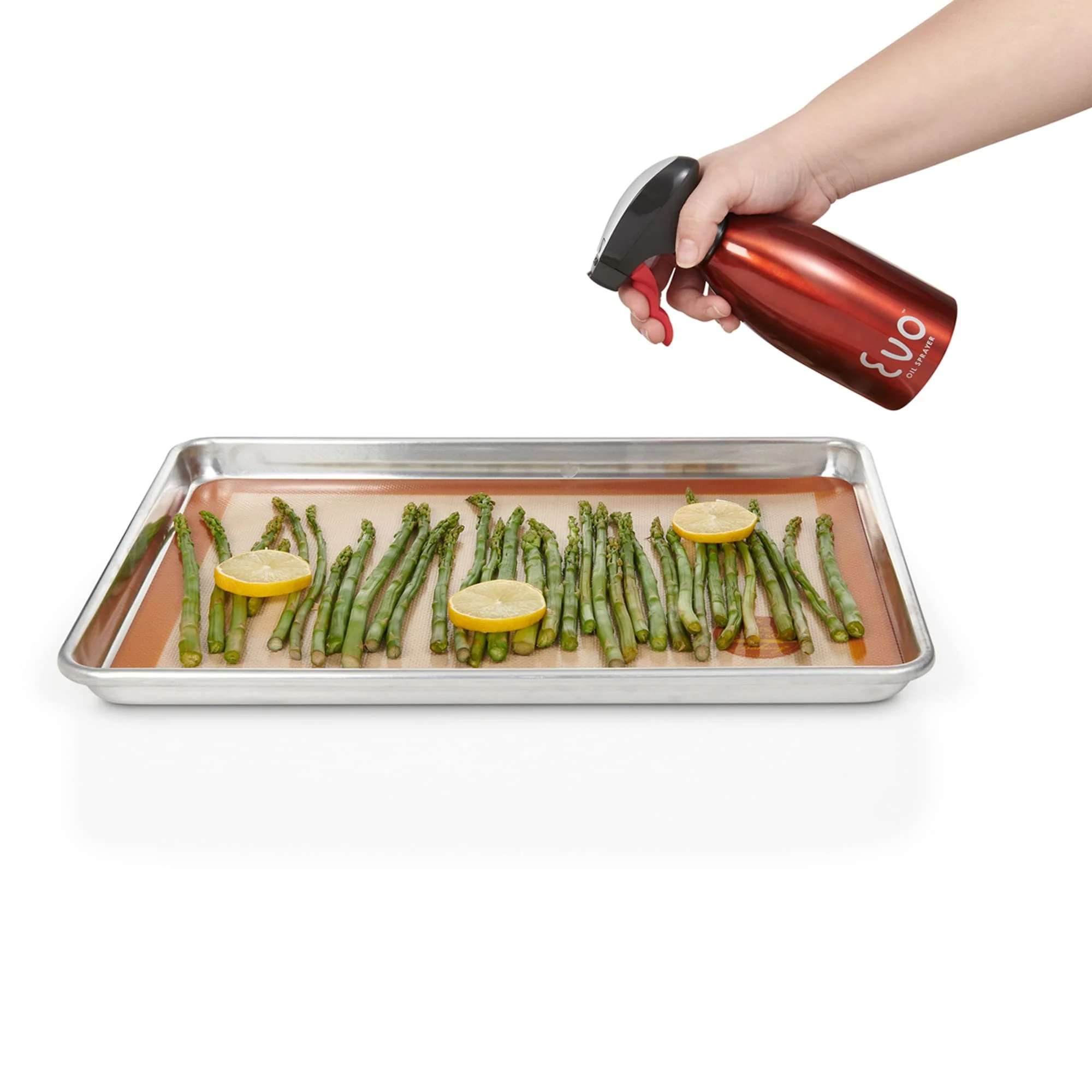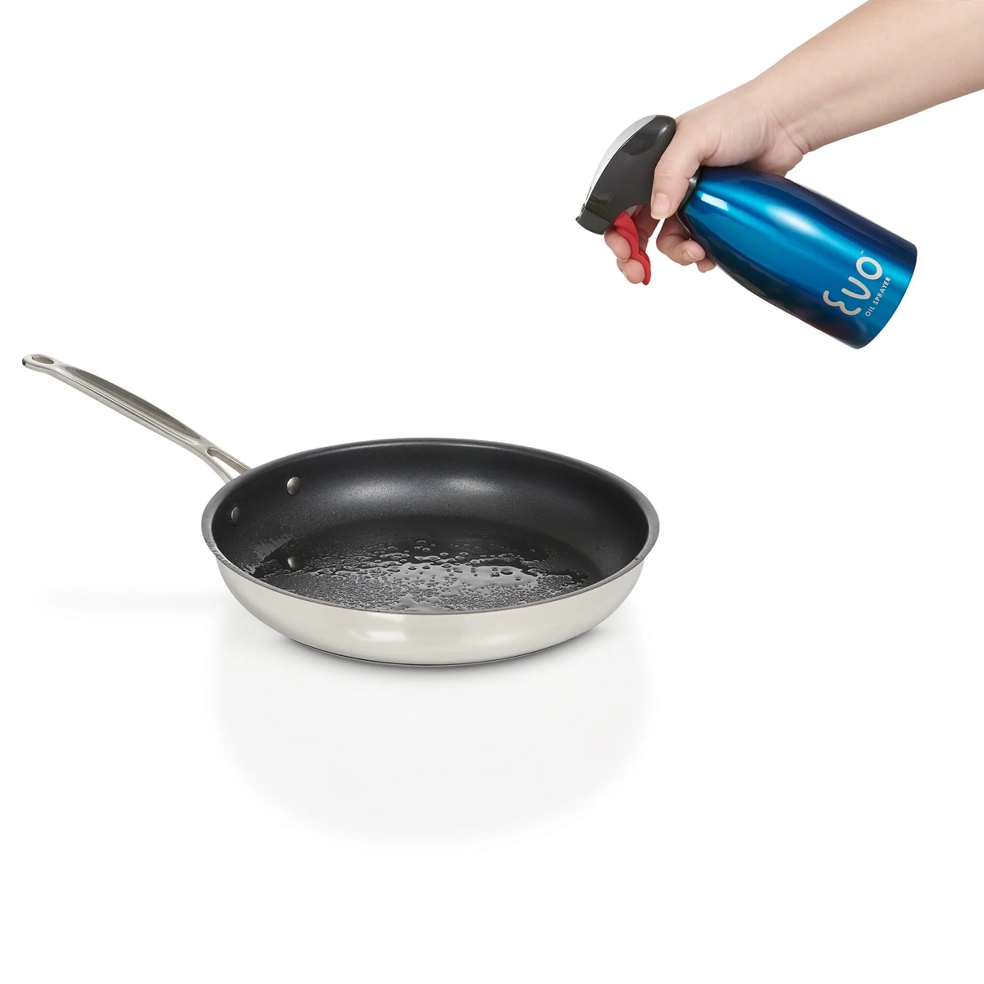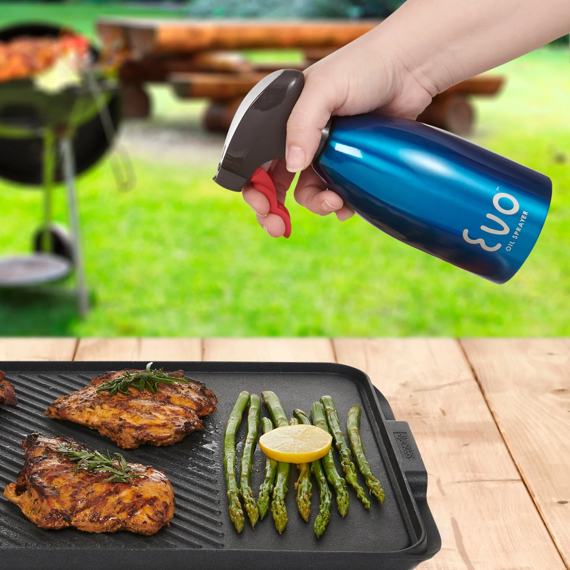 - Evo's Stainless Steel Non-Aerosol Oil Sprayer Bottle sprays without harmful propellants or chemicals, requires no pumping or priming, and won't clog