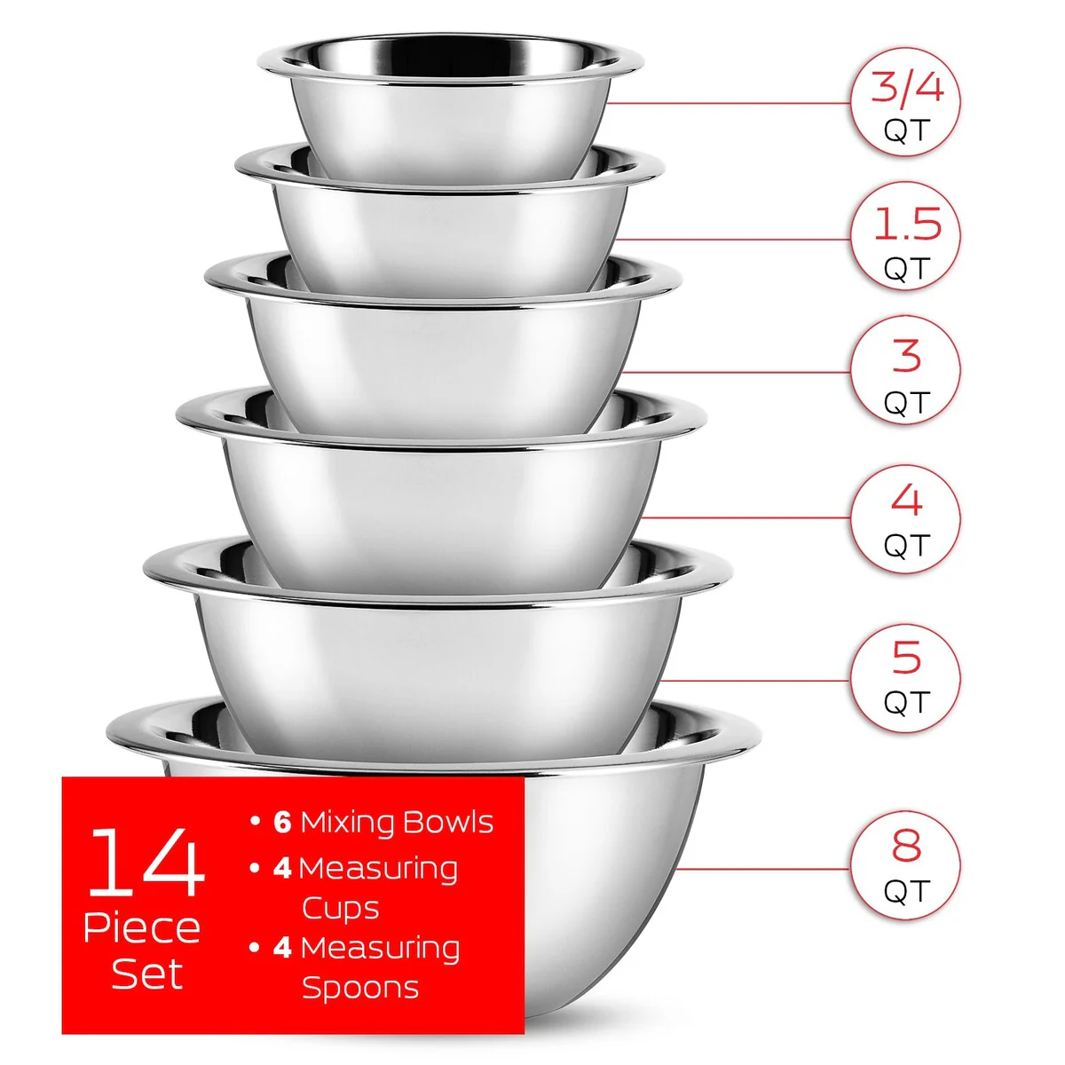 Great for prepping ingredients in advance, our metal mixing bowls are refrigerator- and freezer-safe, saving you time and hassle! Chop up fruits and vegetables, prepare and mix ingredients, or chill cookie dough using these mixing bowl sets for the kitchen. This useful mixing and measuring set is packaged in a beautiful gift box, making it the perfect housewarming gift, Mother's day gift, Father's day gift, birthday gift, anniversary gift, or wedding gift!