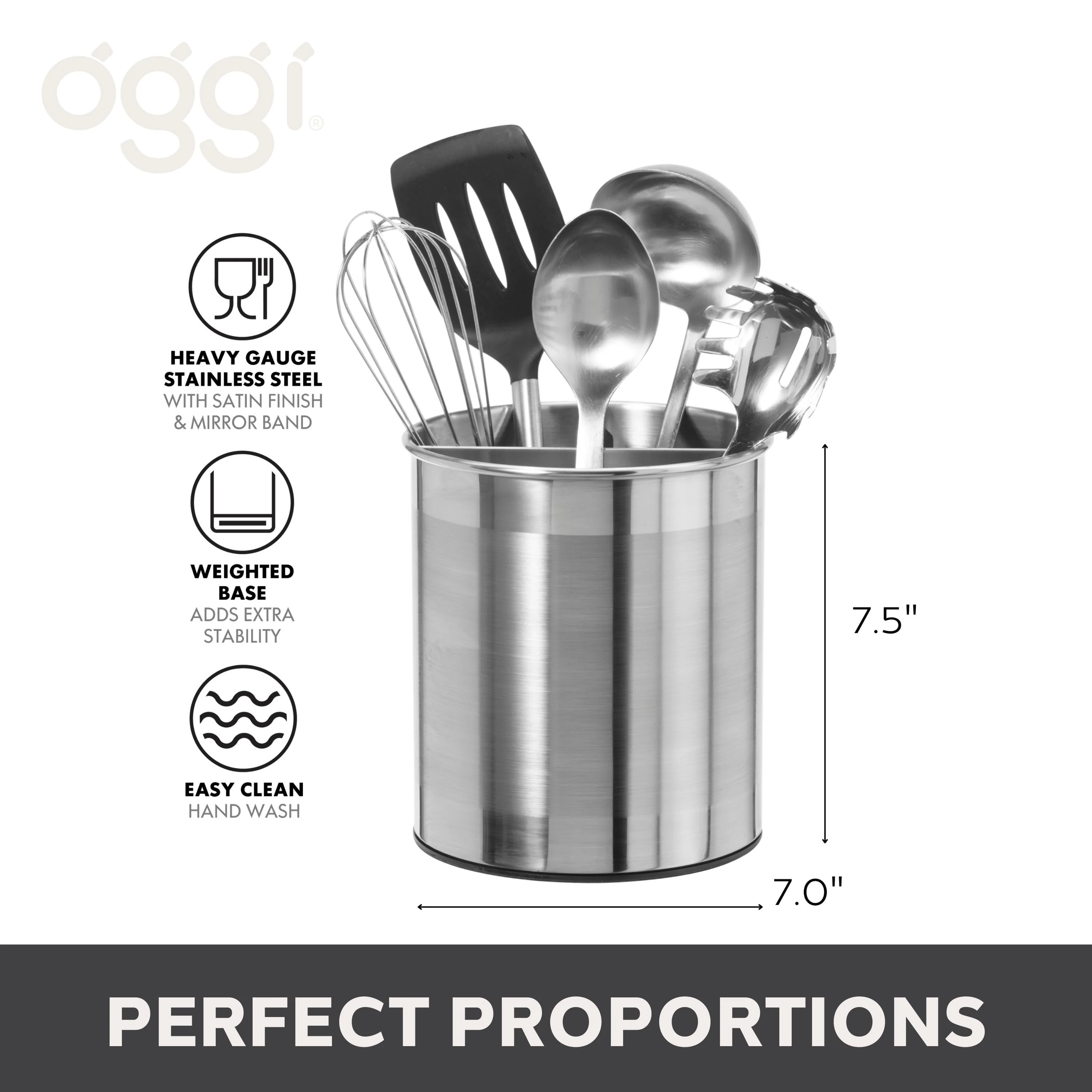 The functional styling of OGGI's Jumbo Rotating Stainless Steel Utensil Holder with removable partition enhances the countertop of any kitchen. With it's extra generous 7-inch opening, this stainless steel holder can house a multitude of cooking tools both large and small, keeping them close at hand for an quick grab. The beautiful satin finish is trimmed with mirror bands working well in any kitchen decor. ORGANIZE KITCHEN & SAVE SPACE: Clear drawer space without forgoing an organized kitchen. The rotating kitchen utensil caddy is large enough to store kitchen utensils, like silverware, spatulas, ladles, spoons, tongs, whisks, chopsticks and more on the countertop. GENEROUS CAPACITY & EASY ACCESS: Accommodates utensils of all sizes. The utensil holder rotates easily and smoothly, allowing easy access to all kitchen utensils while cooking, serving, or grilling. Utensil holder has stable base to prevent toppling over. VERSATILE ORGANIZATION: Sturdy removable partition sections the utensil holder, enabling different utensils to be kept in different compartments. When removed allows holder to fit more utensils. STEADY GRIP: The utensil holder is set on a sturdy plastic base with a steady grip. Will sit firmly on countertop even as rotated. Won't slip, slide, or wobble. Requires minimal care and cleaning. Handwashing recommended. GREAT VALUE: Utensil holder is 7' in diameter with a height of 7.5'. BPA-free, non toxic, chemical and lead-free. High quality modern satin stainless steel, trimmed with mirror bands, complements any kitchen design.