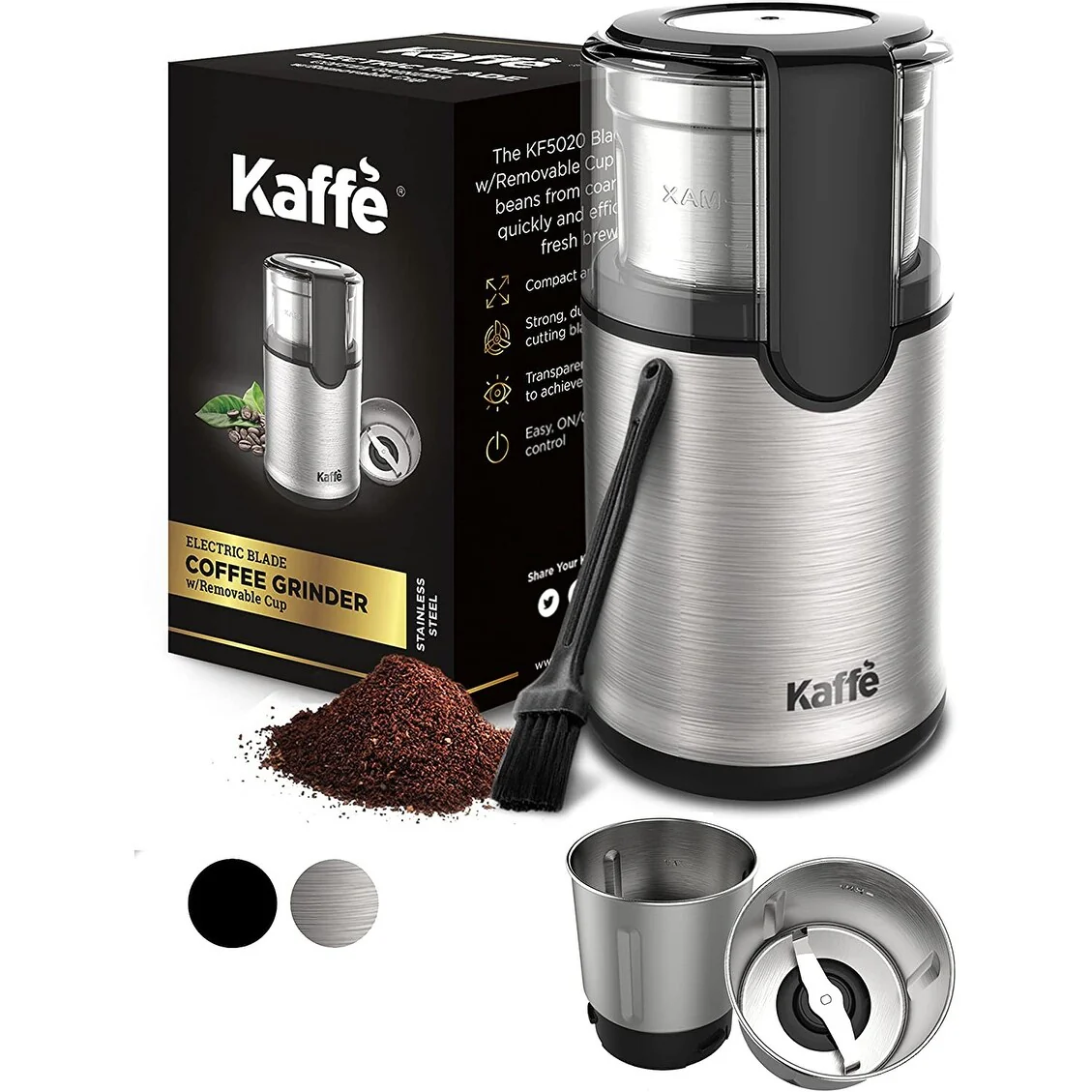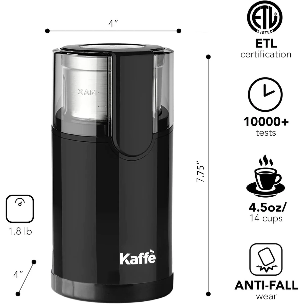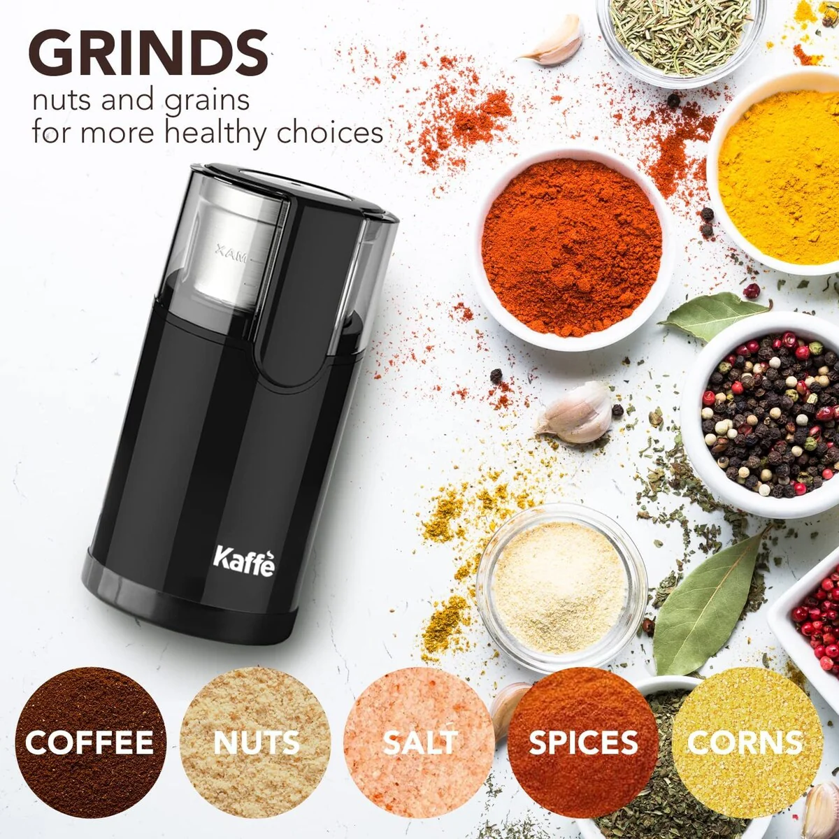 The KF5010 Kaffe line of electric coffee grinders provides a quick and efficient way to grind coffee beans or spices down to your desired preference for use with a ��french press coffee maker or coffee dripper set. Grinding coffee beans immediately before use releases fragrant essential oils at the right moment to ensure maximum freshness, rich aroma for a full-bodied flavor, and complex, ��satisfying coffee with the most delicious taste from the comfort of your own kitchen. If you choose to grind beans to store, this is one of the best coffee grinders for doing so due to its quiet operation you will never wake anyone up while grinding beans! We recommend grinding just enough beans for each use though, as this makes for the freshest coffee. This coffee bean and spice grinder have a capacity of up to 3 ounces of coffee beans (70g) at a ��time, delivering the correct amount of coffee grounds to use for home or travel coffee dripper sets, you surely don��t have to worry about waking anyone up to make a cup of your favorite coffee. With its stainless steel blades, this electric grinder delivers coffee grounds to your preferred level of coarseness or fineness at the touch of an ON/OFF button. Thanks to a transparent lid, you can see the grinder at work and monitor your ground consistency. This compact appliance is easy to clean: Simply wipe parts with a damp, soapy sponge. Use the included cleaning brush to clean the inside of the grinder and leave no mess! The dishwasher-safe lid can be washed on the top shelf of your dishwasher. An attractive black finish adds elegance to your kitchen. The perfect gift for him/her or any coffee lover as a wonderful kitchen accessory for those who love convenience at their fingertips.�