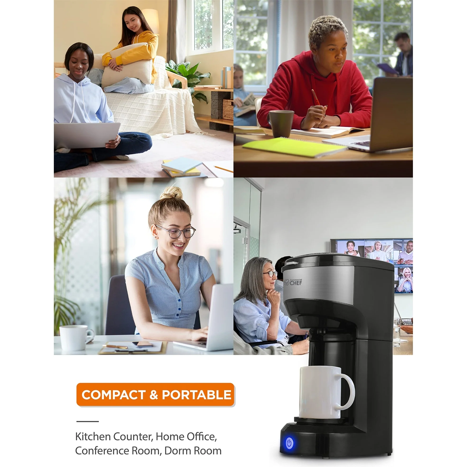 Delicious Coffee: With this COMMERCIAL CHEF single serve portable coffee maker, you can brew your favorite beans time and time again. Load your coffee cup or travel mug up and you're ready for the day.13 Ounces: Load up your new drip coffee maker (2.33 lbs.) with 13 ounces of filtered water for your next great cup of hot coffee. This is a must-have when it comes to necessary kitchen appliances!One Touch Button: With one touch of a button, hot water instantly combines with ground coffee to create a delicious cup of joe. You can't beat the convenience of small coffee makers.Grab & Go: Whether you're headed out the door for work or needing a second cup for breakfast, this drop coffee maker (6.46' x 5.35' x 10.91') is perfect for busy mornings and even busier people.Quality Assurance: With this single coffee maker single serve, you have total quality assurance for each and every customer, which is the COMMERCIAL CHEF guarantee.