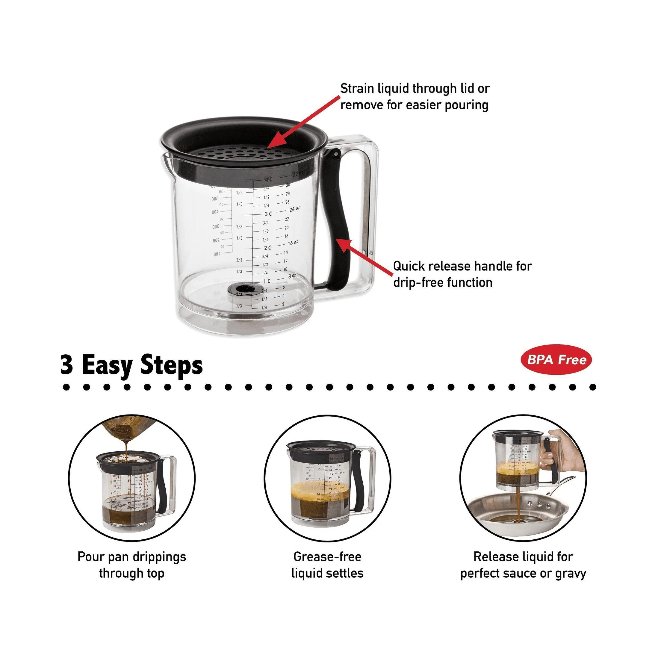 The Swing-A-Way 4 Cup Easy Release Fat/Gravy Separator is designed to retain delicious gravy sauce without the unwanted extra run-off fat. Easy to use cup is labeled with clear size amounts for easy measuring. Standard size amounts; 1/4, 1/2 cup, 3/4 cup and 2 oz increments. When a dish is fully cooked, pour the pan slightly over the separator and carefully pour the excess liquid into the separator. The separator will slowly filter and strain the fat from the regular sauce through the new deeper removable lid and it will start settling. Once the liquid fully settles, you can use the smartly engineered soft grip quick-release handle and pour the fat-reduced gravy over the food or dish. Spring loaded bottom opening allows for easy release of the grease-free liquids. When not using the quick release, the cup is completely drip-free. Can store up to 32 oz or 4 cups so you never have the fear of running out of room while straining large amounts. Dishwasher safe on the top rack.