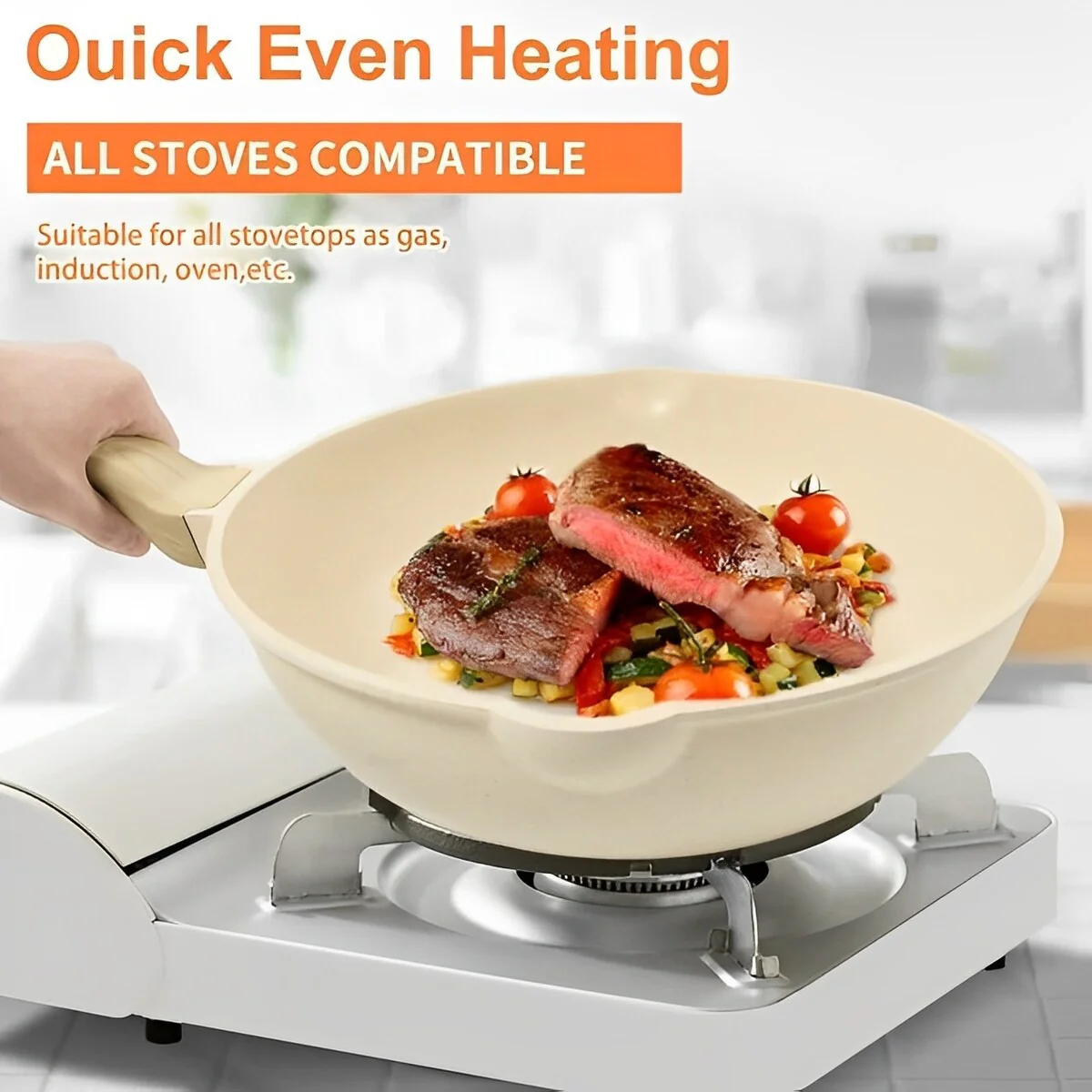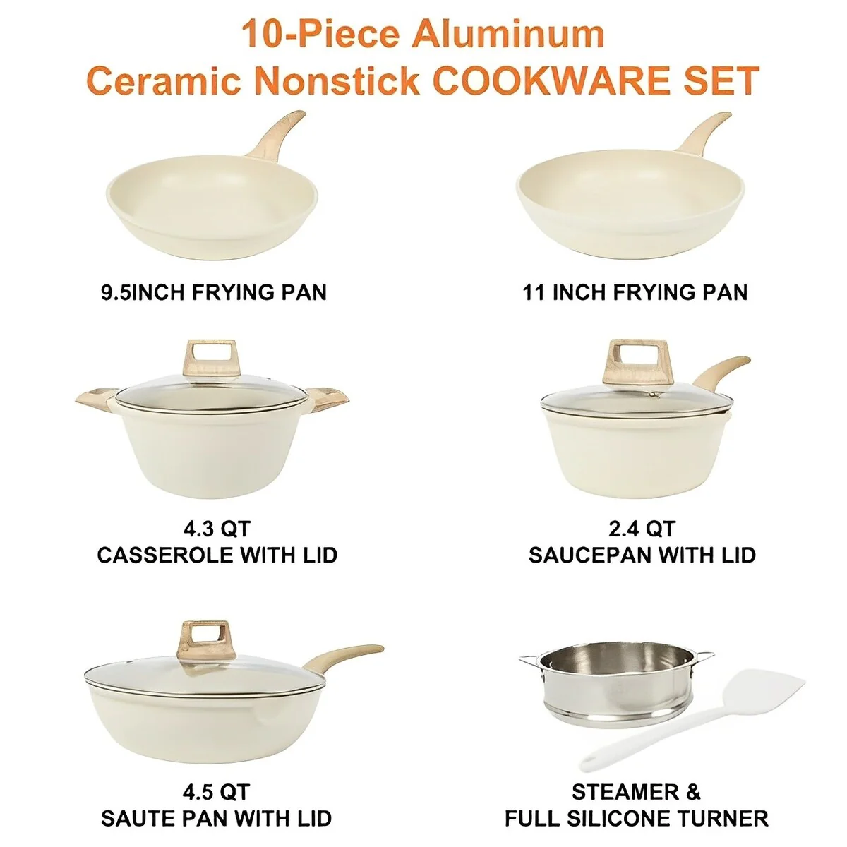 - Complete Culinary Arsenal: This all-inclusive set comprises 9.5-inch and 11-inch frying pans, a 2.3-quart saucepan with lid, a 4.3-quart casserole with lid, a 4.5-quart sauté pan with lid, a white silicone spatula, and a stainless steel steamer. Your kitchen will lack nothing.