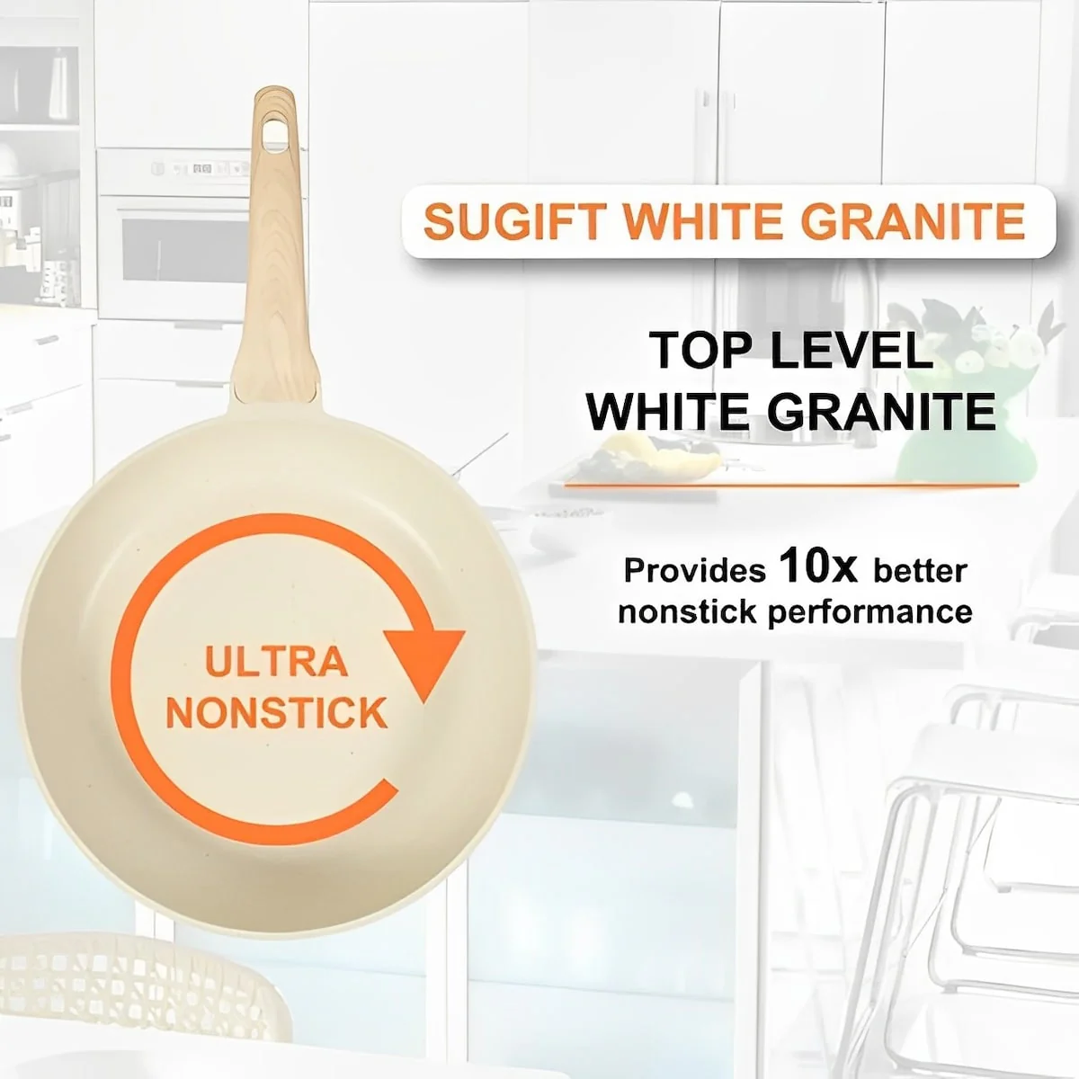 Discover a new realm of culinary possibilities with the SUGIFT 10-Piece Nonstick Cookware Set. Crafted with an eco-friendly White Granite surface, this cookware set offers unparalleled non-stick performance for healthier and more convenient cooking. From sizzling skillets to versatile saucepans, this comprehensive collection has you covered for any culinary adventure. Featuring an extended bottom design, the set is compatible with all stove types—including induction cooktops. Say goodbye to laborious cleaning; a simple wipe or rinse is all you need.
