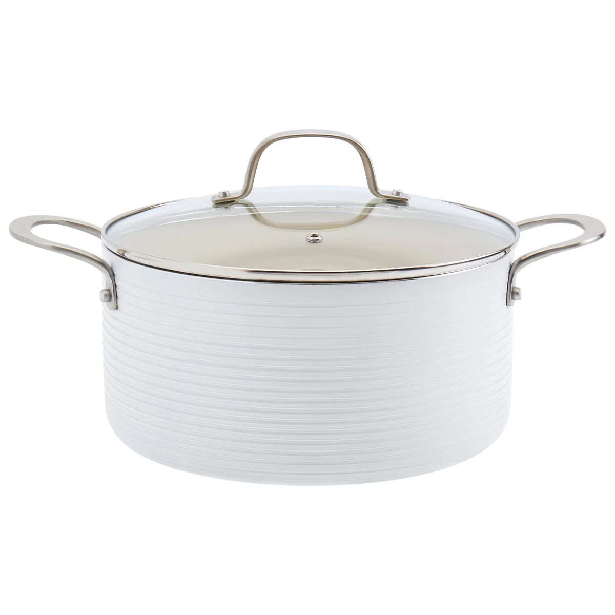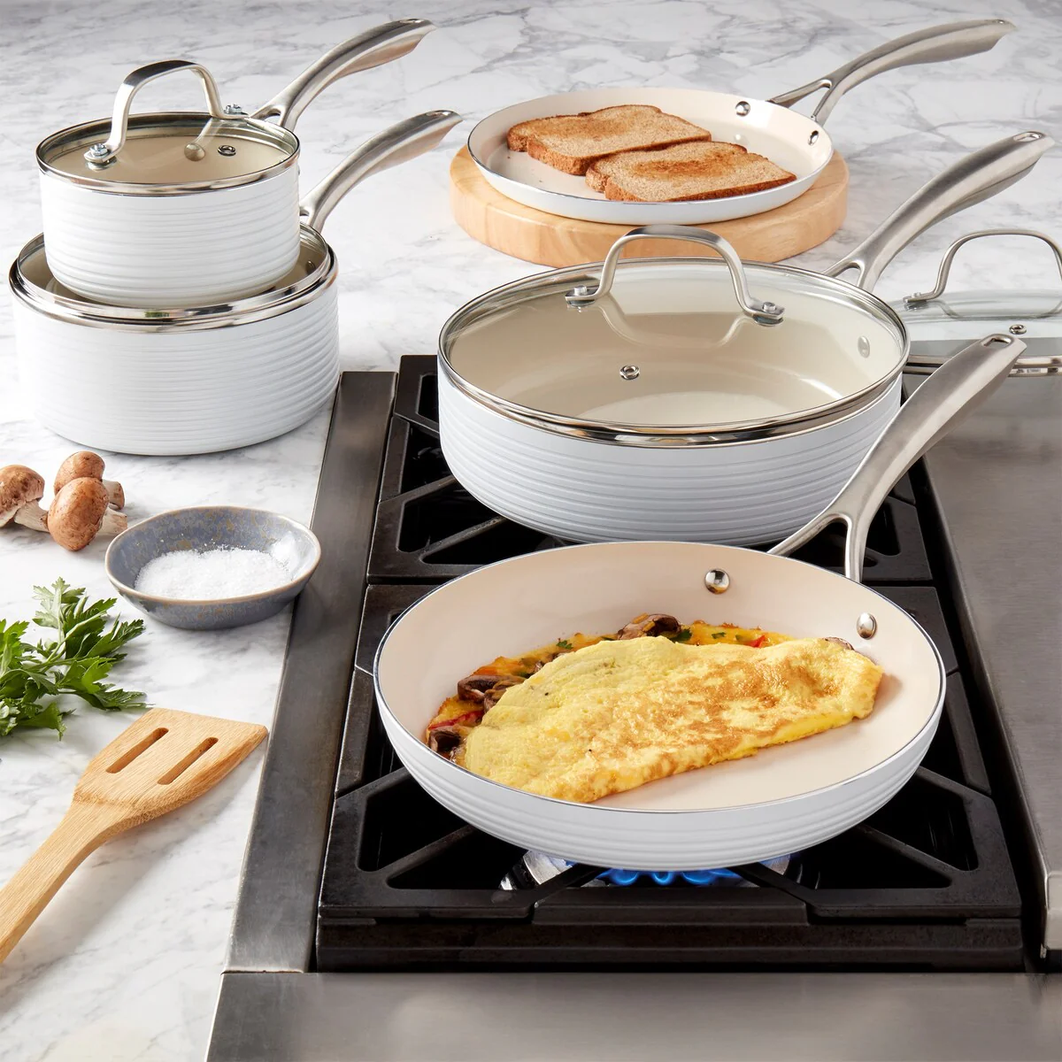 - Includes 2 saucepans with lids, 1 frying pan, 1 sauté pan with lid, 1 griddle pan, and 1 Dutch oven with lid
