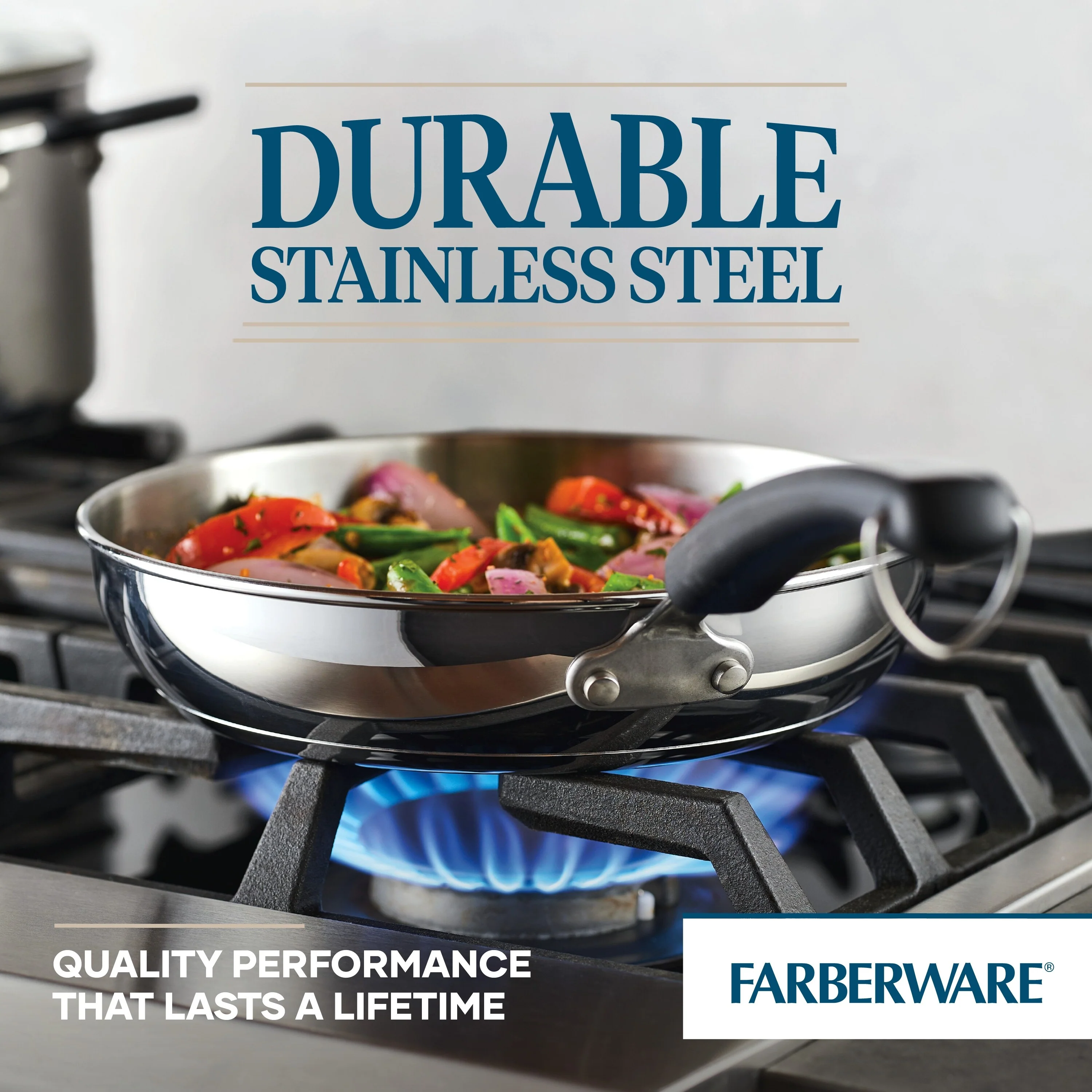 Your culinary future is bright with Farberware Brilliance, quality stainless steel cookware designed for versatile, everyday cooking and constructed for long-lasting performance. The durable stainless steel pots and pans in this 10-piece cookware set feature an edge-to-edge, fully encapsulated base that promotes even heating and is also suitable for all stovetops, including induction. This sealed-base design adds strength and structural integrity, which makes the pots and pans truly dishwasher safe, and helps them withstand wear and tear. The cookware includes practical features, like stay-cool handles and rolled rims, for everyday convenience. With its distinctive polished sheen, Farberware Brilliance shines in any kitchen.