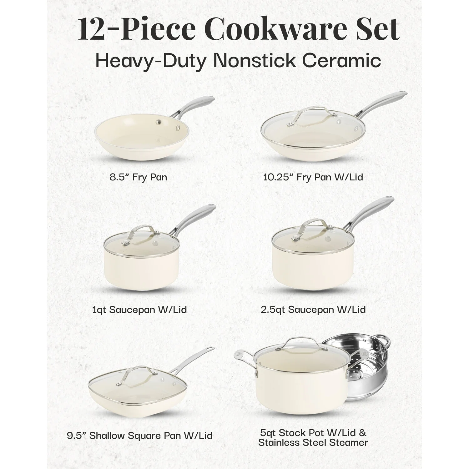 Upgrade your kitchen with the Gotham Steel 12-Piece Nonstick Ceramic Cookware Set in elegant Cream. Featuring a triple-coated ceramic-titanium surface with diamond reinforcement, it ensures effortless food release, durability, and scratch resistance. Toxin-free and dishwasher safe, this set offers even heat distribution for all stovetops and is oven safe up to 500°F. Includes frying pans, skillets, saucepans, and a stockpot. Stylish and efficient, perfect for health-conscious cooking.