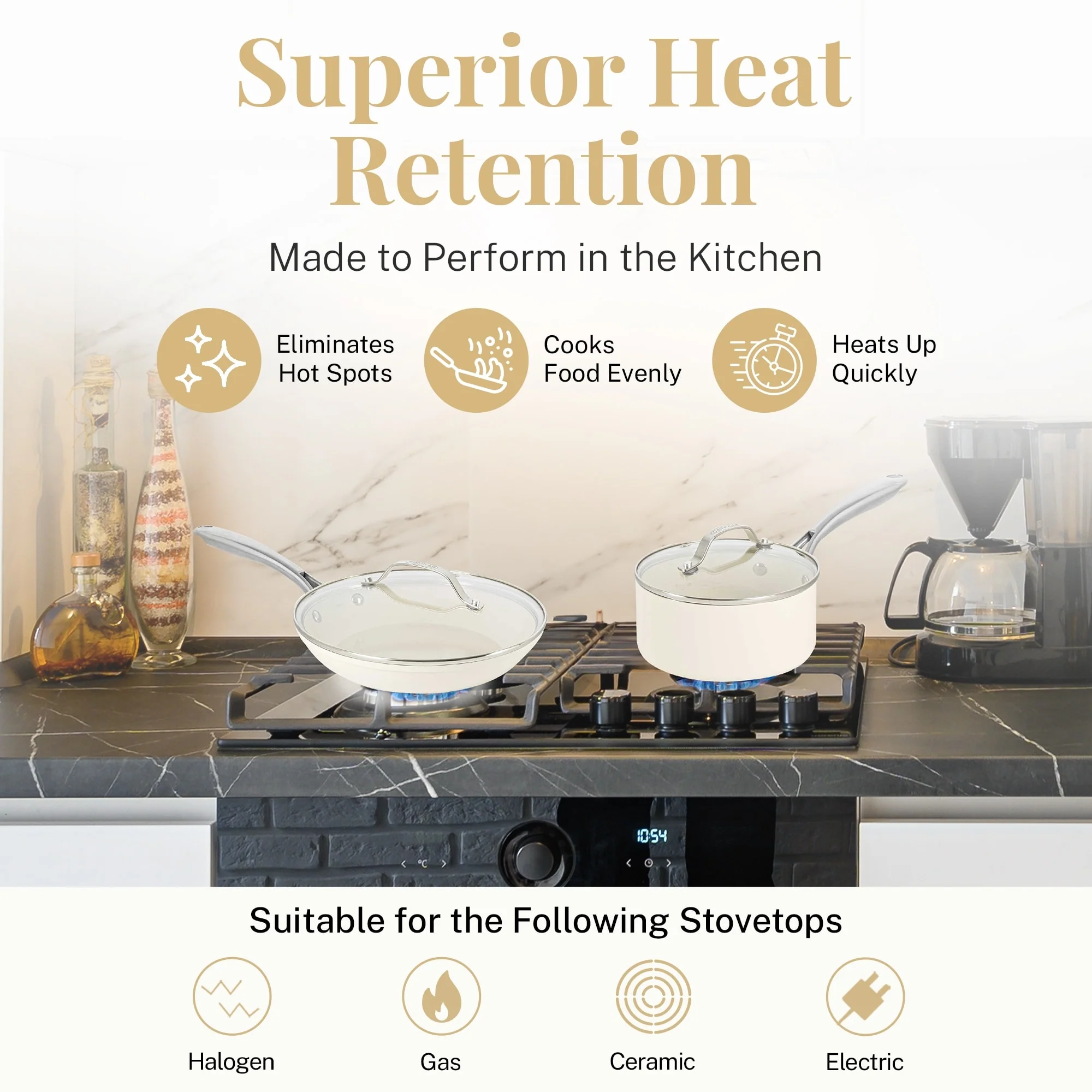 - Stylish and Durable Design: Featuring a chic cream color, stainless steel stay-cool handles, and tempered glass lids, this cookware is lightweight and durable, perfect for modern kitchens with a touch of elegance.