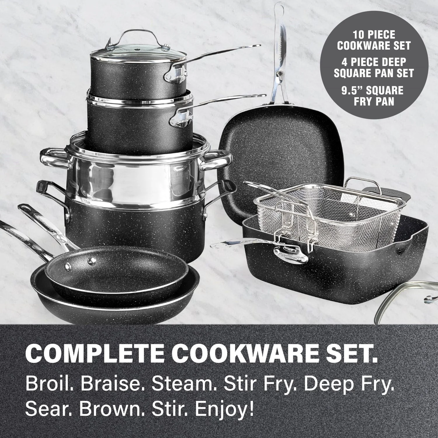 - Complete 20 Piece Kitchen Set: Includes 8.5” skillet, 10.25” fry pan with lid, 9.5” square pan, 1.5 qt and 2.5 qt sauce pots with lids, 5 qt pot with lid and stainless steel steamer, 9.5” deep pan with lid, steamer insert, fry basket, muffin tray, square bake pan, cookie tray, round bake pan, and loaf pan