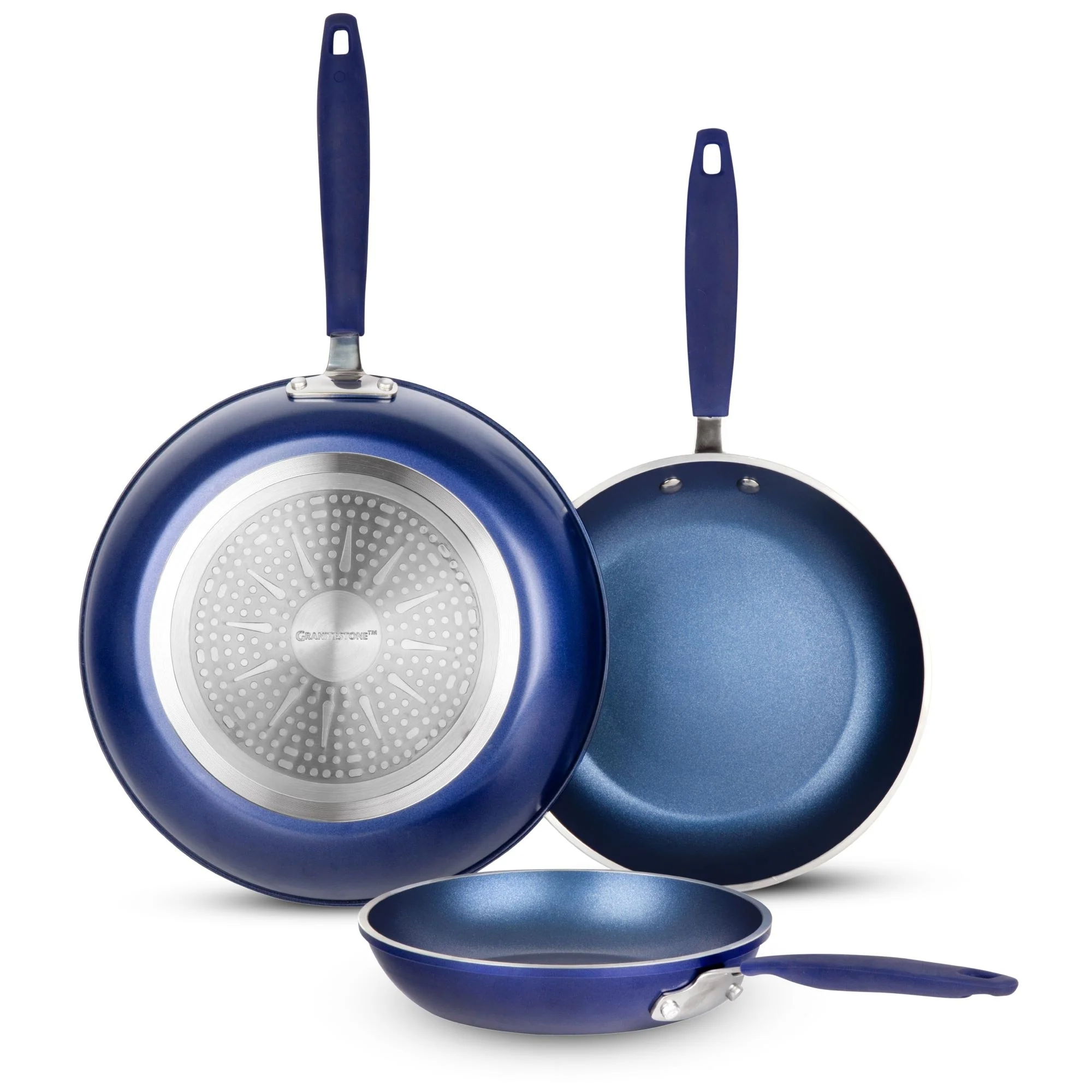 - Cool Touch Rubber Grip Handles: Designed for comfort and safety, the cool-touch rubber grip handles on all three fry pans ensure a secure, slip-resistant hold.