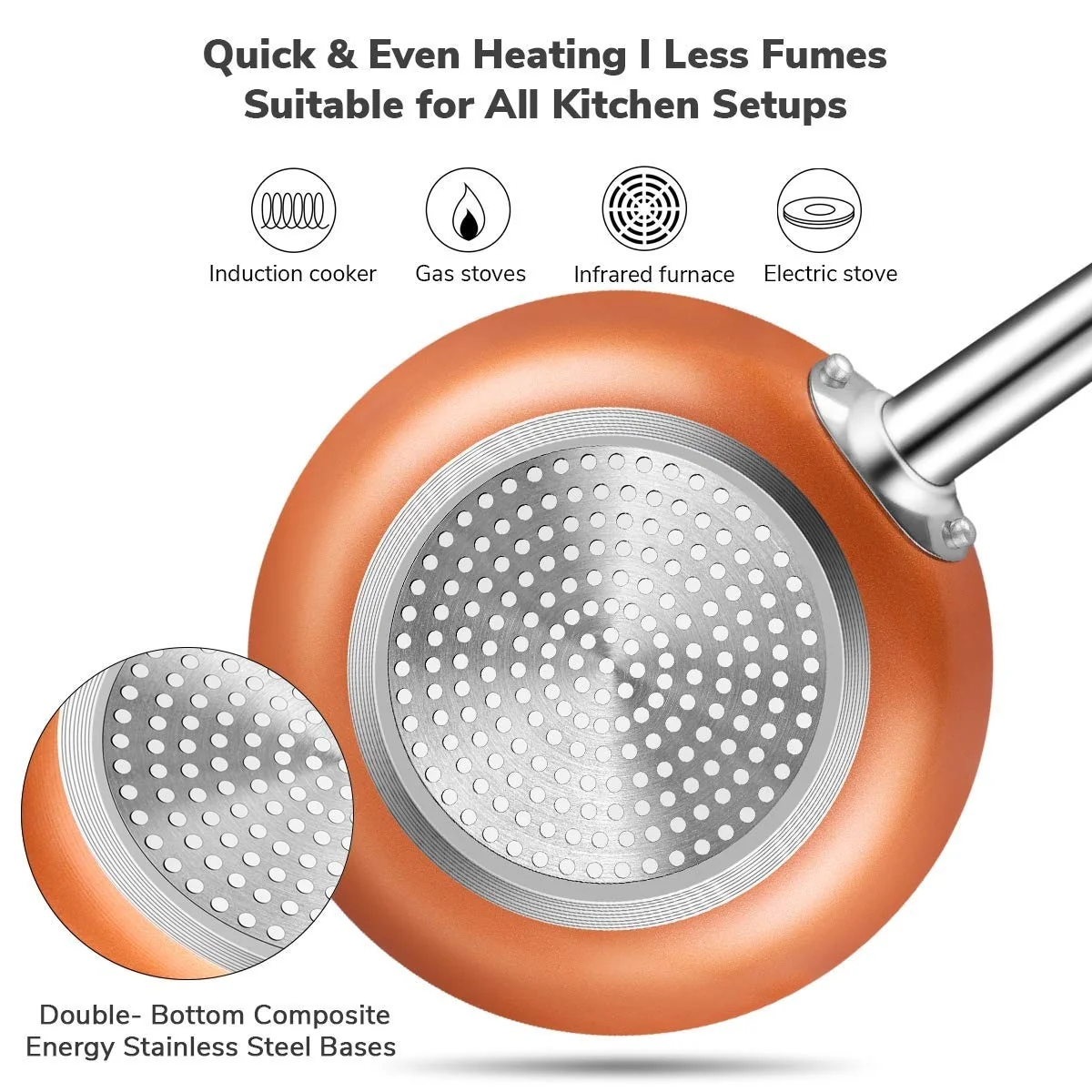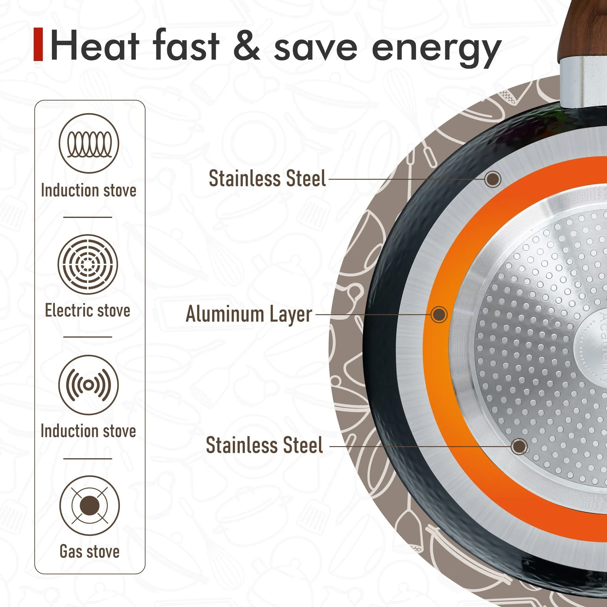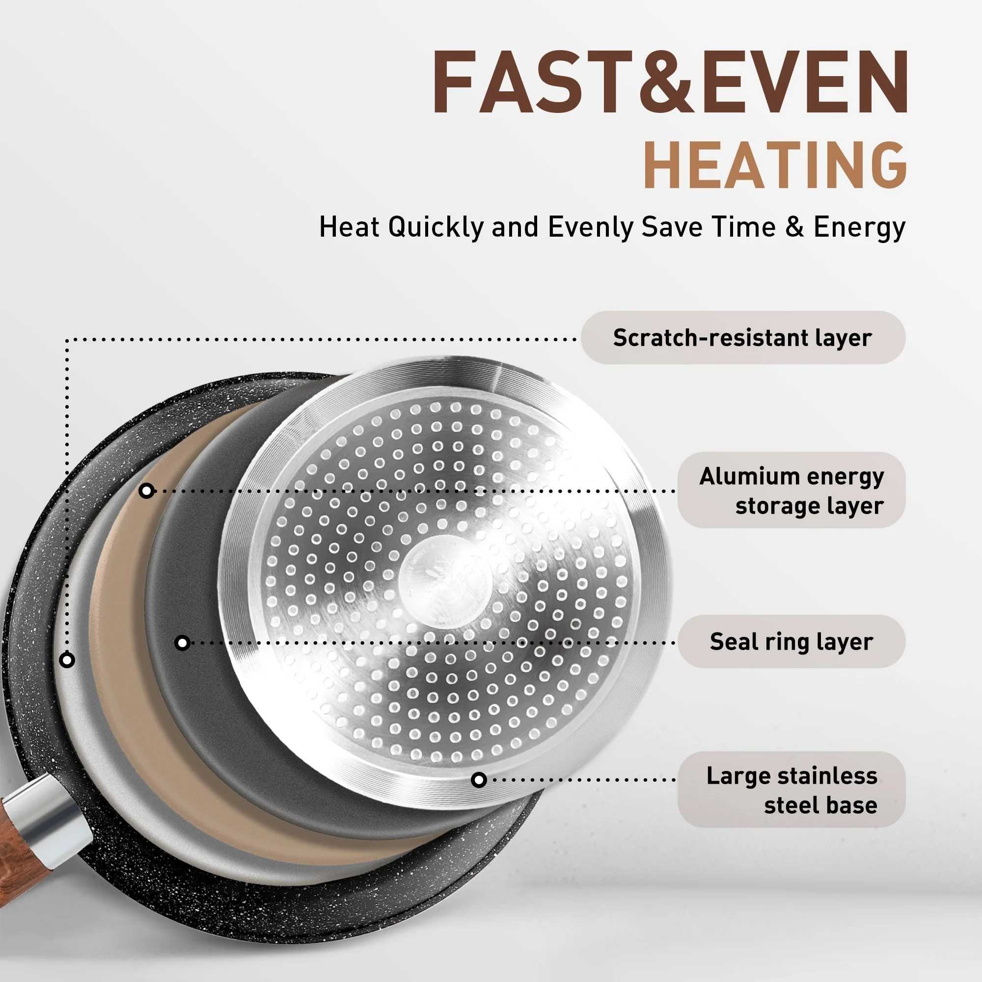 Toxin-free Cooking Set: When buying a new set, make sure that it clearly indicates that it is lead, PFOS, and PFOA-free. These are the three things that you don't want to have in your cookware because of their potential health dangers. Fortunately, you can get granite cookware that is free of these harmful chemicals. For more healthy & Eco-friendly.Induction Cookware Sets: When it comes to the interior, this cookware uses an aluminum core. The result is that the pan heats up quickly, and more importantly, distributes heat evenly. The cookware set works on all major types of cooktops. Larger high-magnetic conductive stainless steel bases ensure induction compatibility, especially glass stoves.
