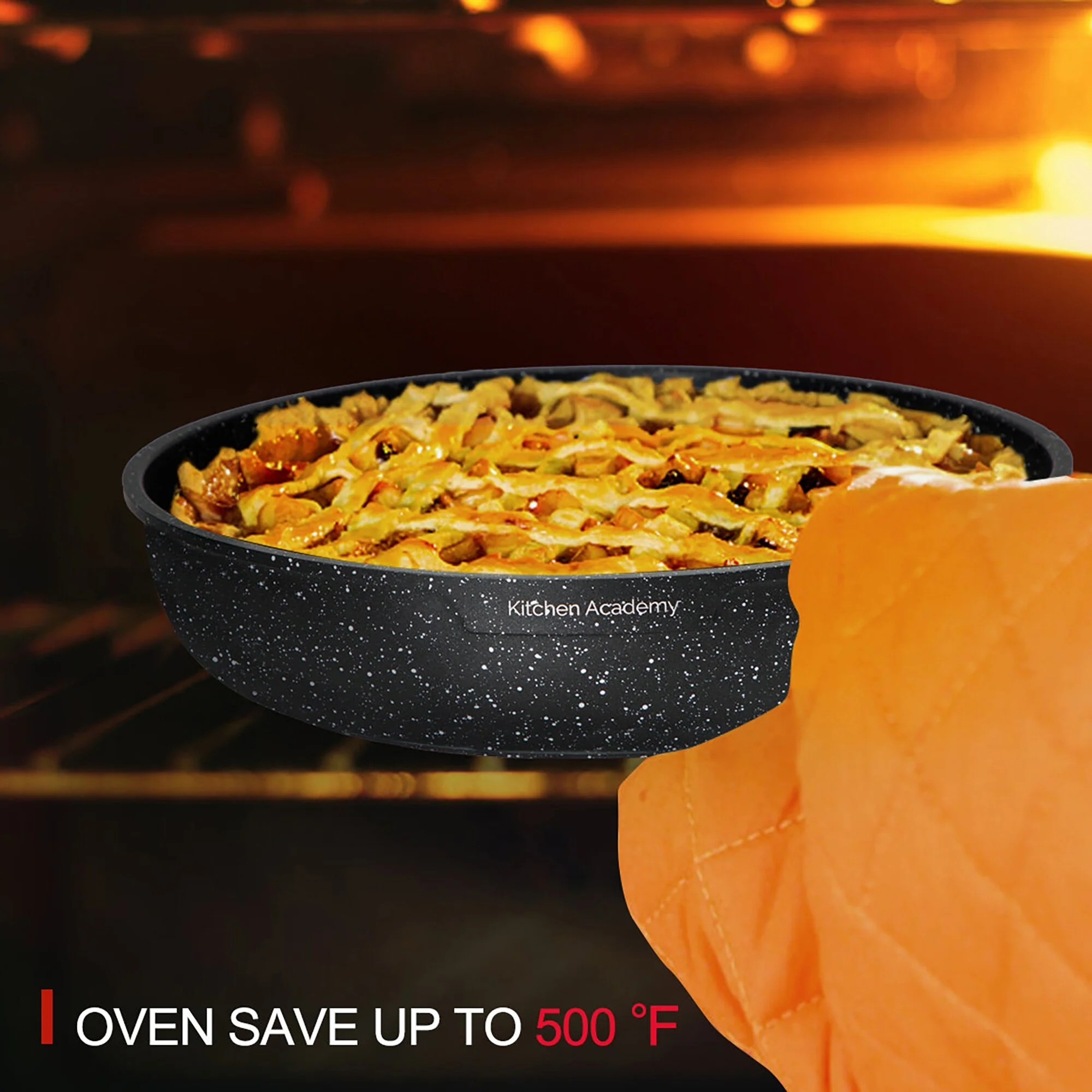 Upgrade your pots and pans with this extensive, top-quality cookware set from Kitchen Academy. Complete with frying pans, saucepans, lids, and more, this set has everything you need. This set includes a ceramic coating for a nonstick surface without requiring oil.