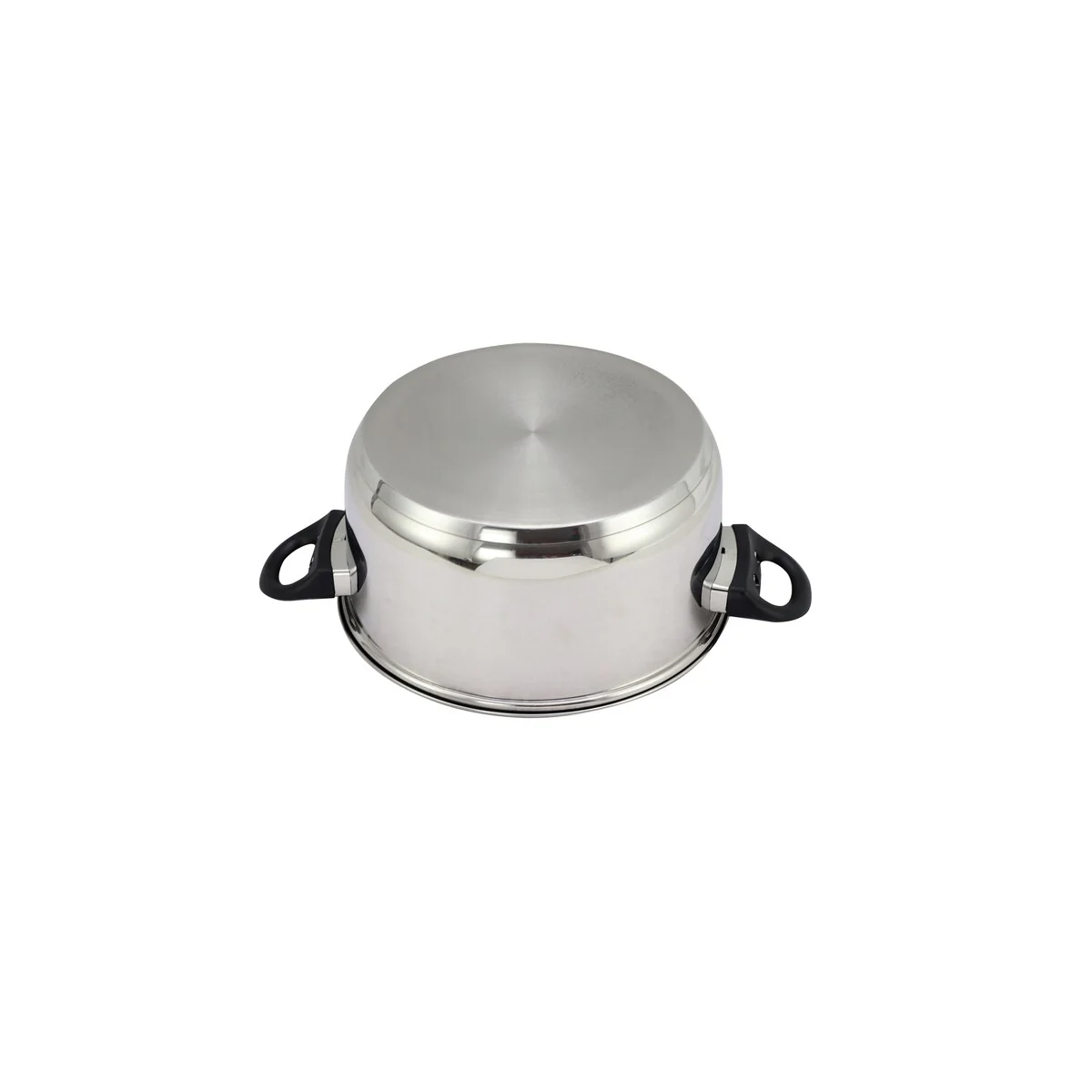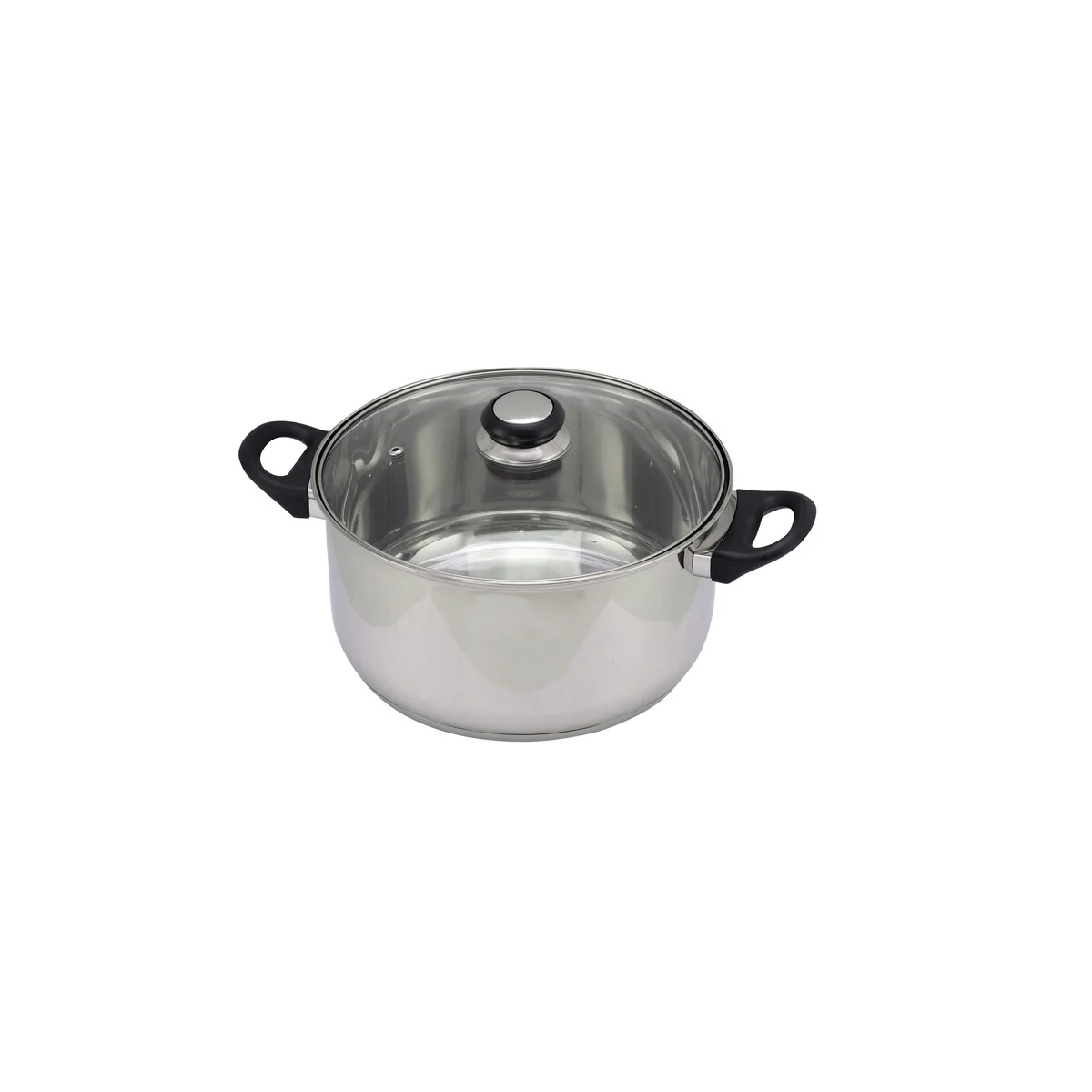 - Set includes three variously sized saucepans with lids, one casserole pot with a lid, and one fry pan (no lid).