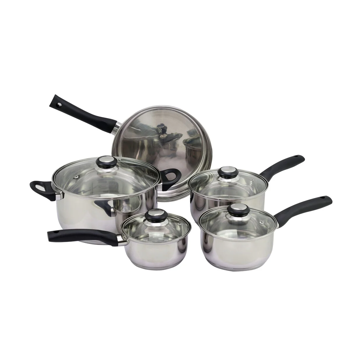 - A 9-piece cookware set including lids features three-step induction bottoms for even heating.