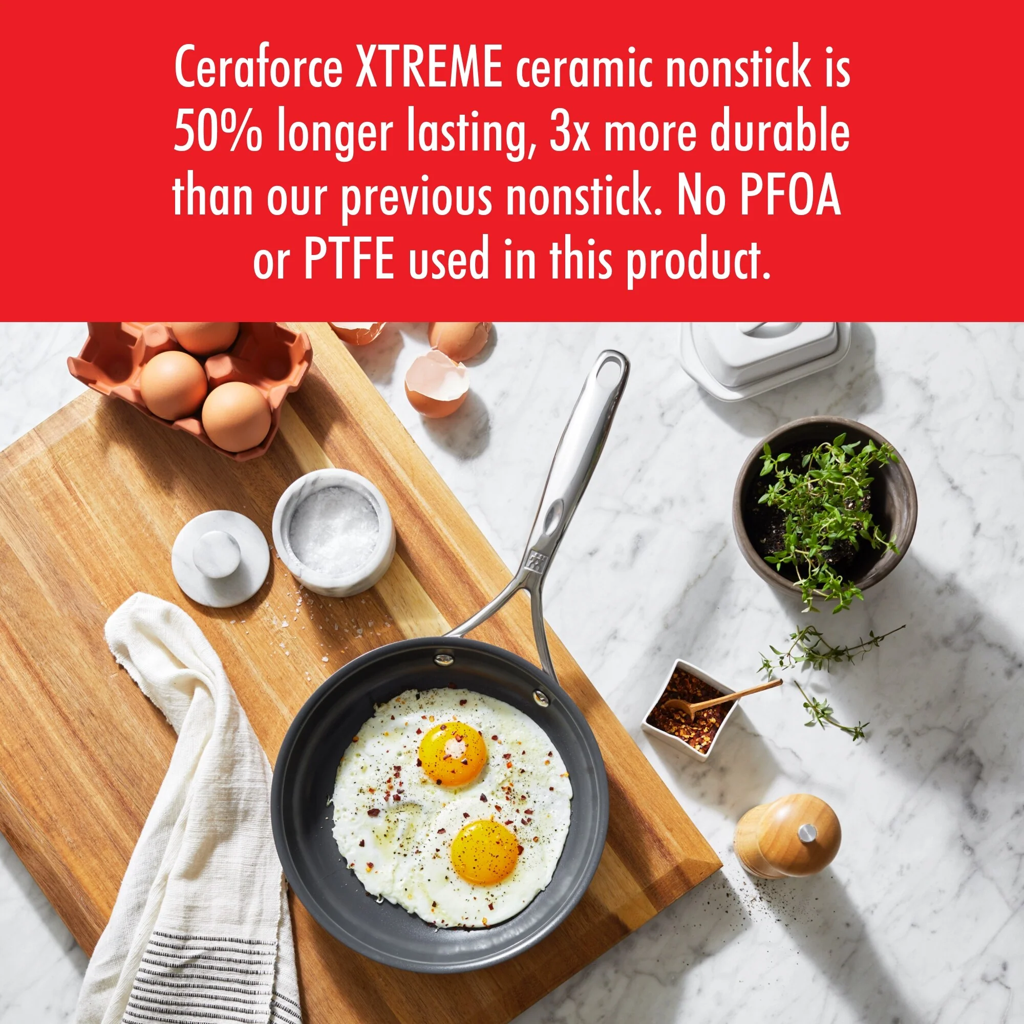Enjoy the high performance of the revolutionary Ceraforce XTREME ceramic nonstick coating. It’s 50% longer lasting and 3x more durable than our previous nonstick. The multi-layer nonstick coating offers effortless release and quick clean up, and the sturdy, clad construction with aluminum core heats up evenly and quickly.