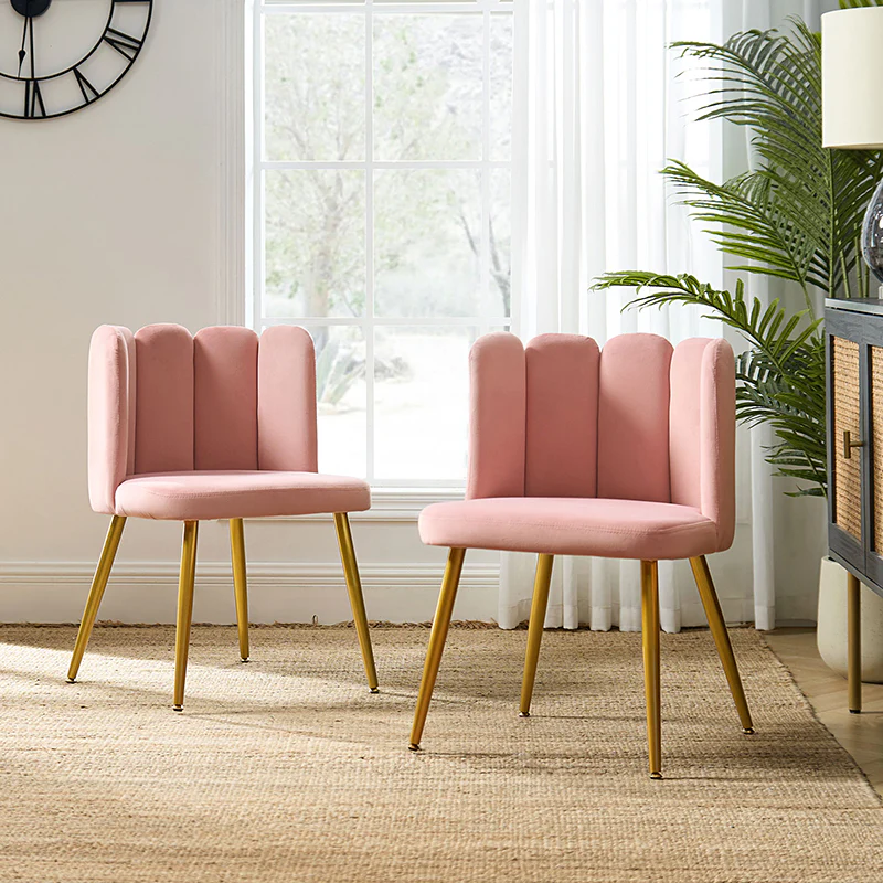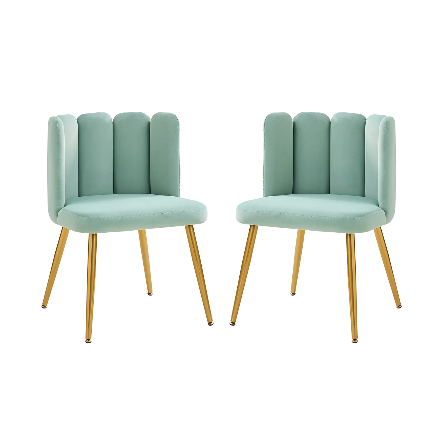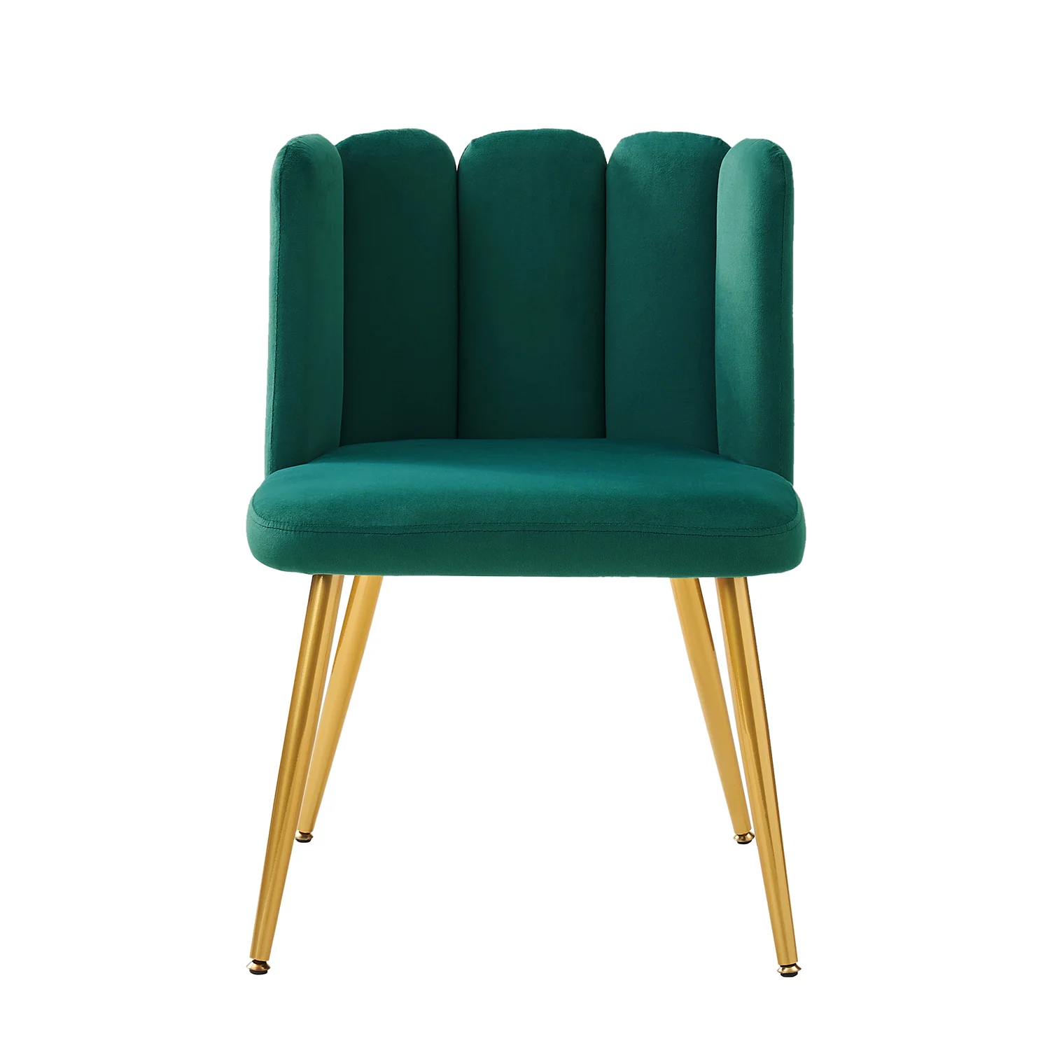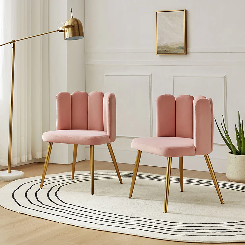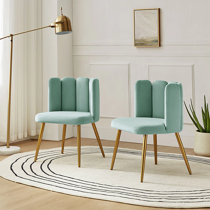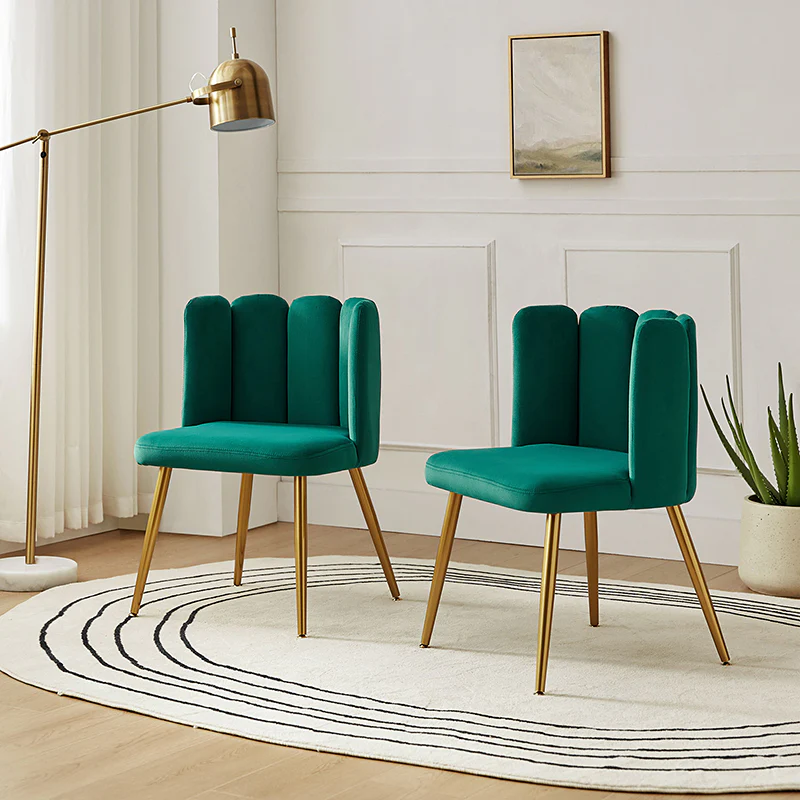Are you in search of the perfect side chair set to elevate your living room or bedroom? Look no further than this exquisite side chair set, which boasts a captivating silhouette. Crafted with a high-quality frame, the unique gold-plated metal legs with adjustable pads not only introduce a sense of fashion and luxury to your home but also provide a sturdy support structure. The velvet fabric, expertly concealing stitching, imparts a subtle hazy reflection of light, enhancing the overall aesthetic. Sink into comfort with the plush foam padding on the seat, while the timeless tufted design brings an element of luxurious comfort to your seating experience. Whether placed in your guest room or dining area, this chair set effortlessly radiates both comfort and elegance.