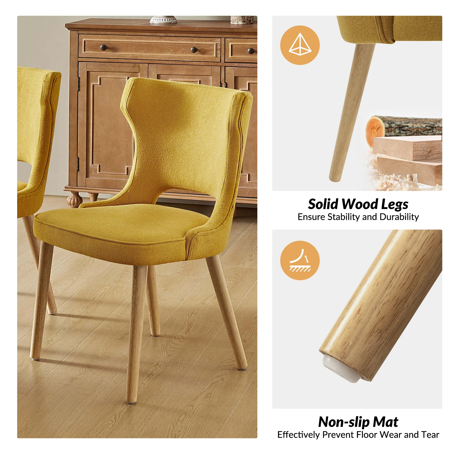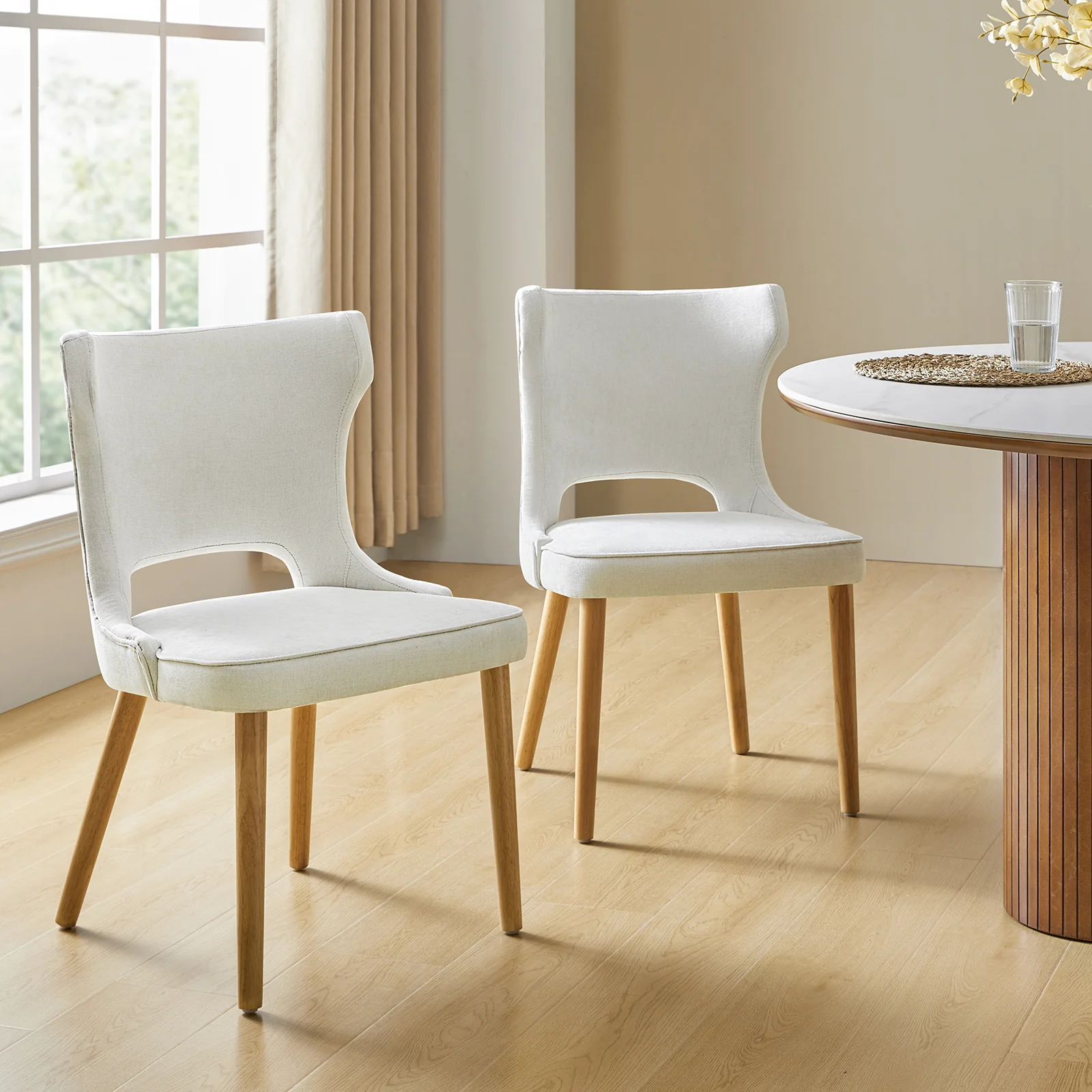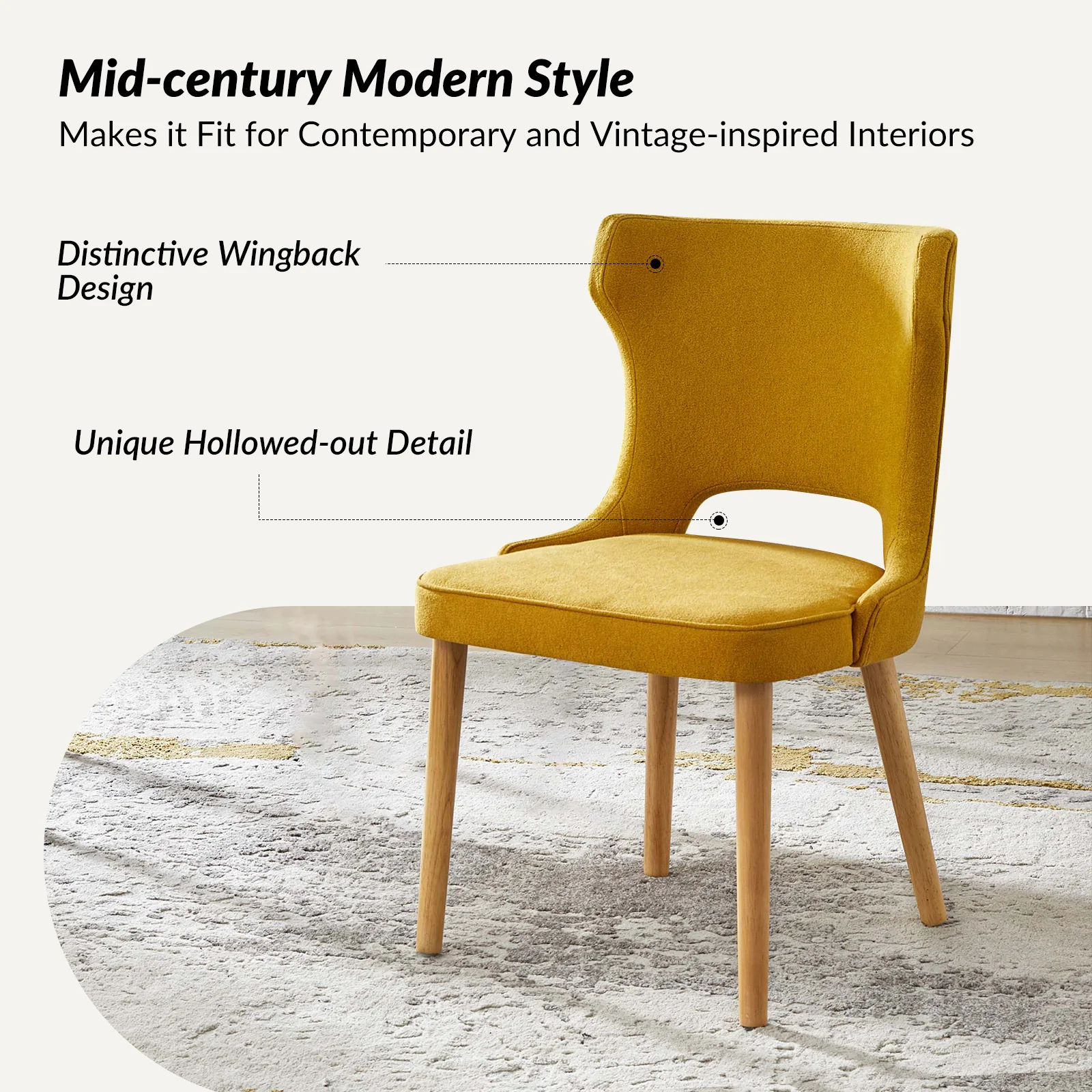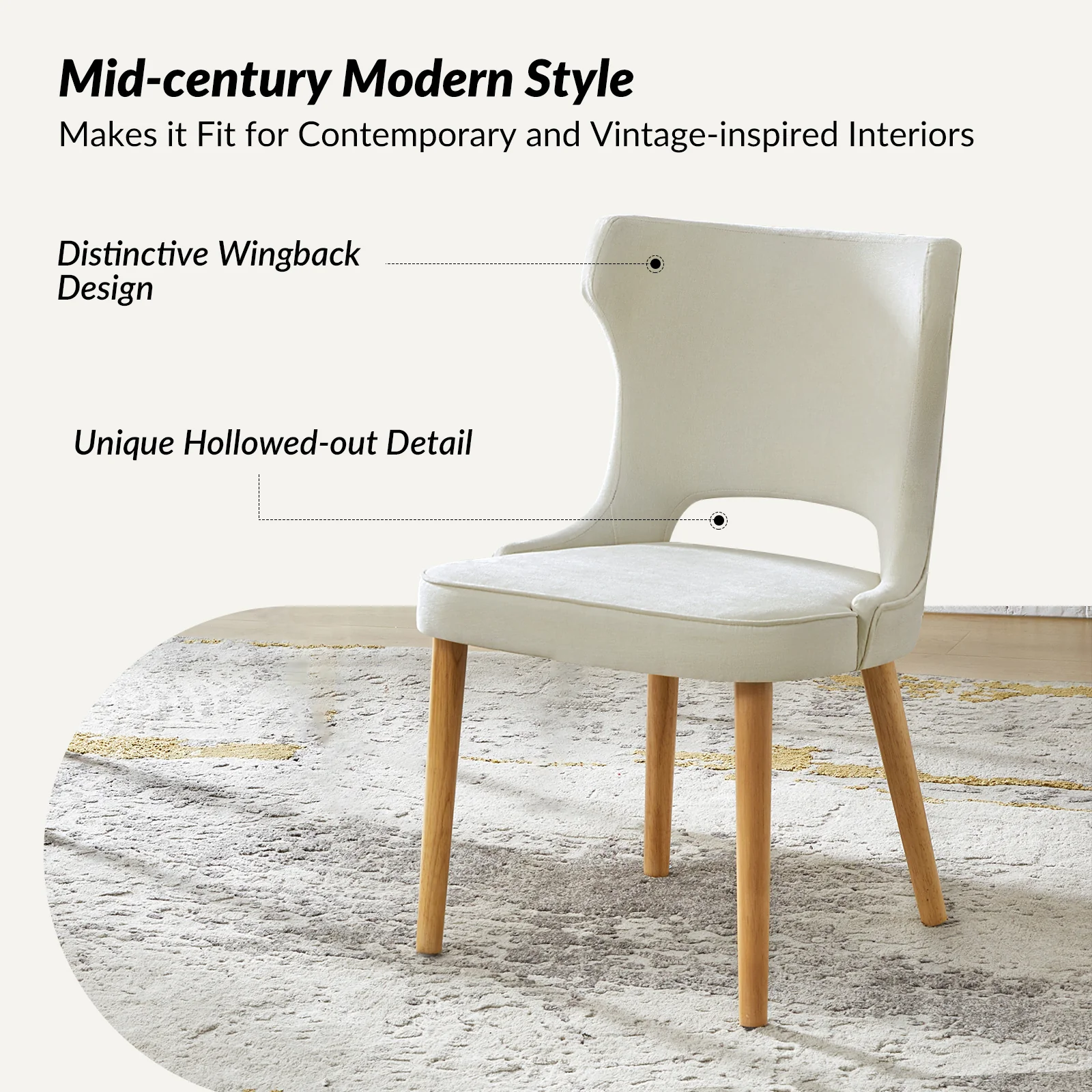 This dining chair set of 2/set of 4 embodies a mid-century modern style with a unique wingback design. Its distinctive hollow design features add an elegant touch, while the solid wood legs ensure stability and durability. The seat is upholstered in anti-water fabric, making it practical for everyday use and easy to maintain. Filled with density foam, the cushion provides exceptional support and comfort, ensuring a pleasant dining experience. This dining chair is easy to install with threaded legs, no tools required. This combination of aesthetic appeal and functional design makes the chair set of 2/set of 4 a stylish and practical addition to any dining space.
