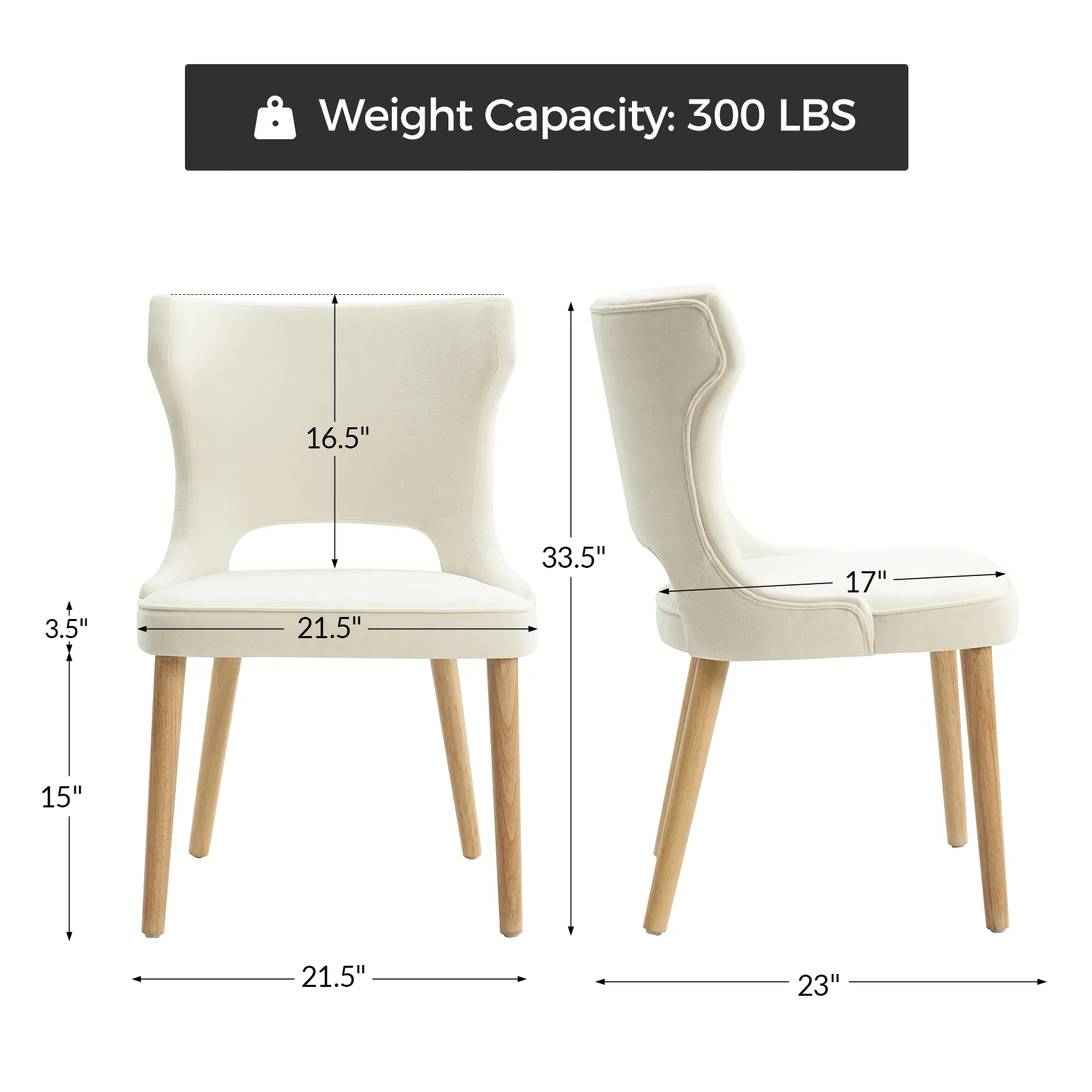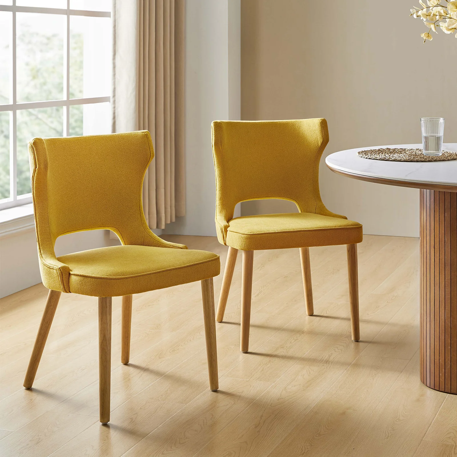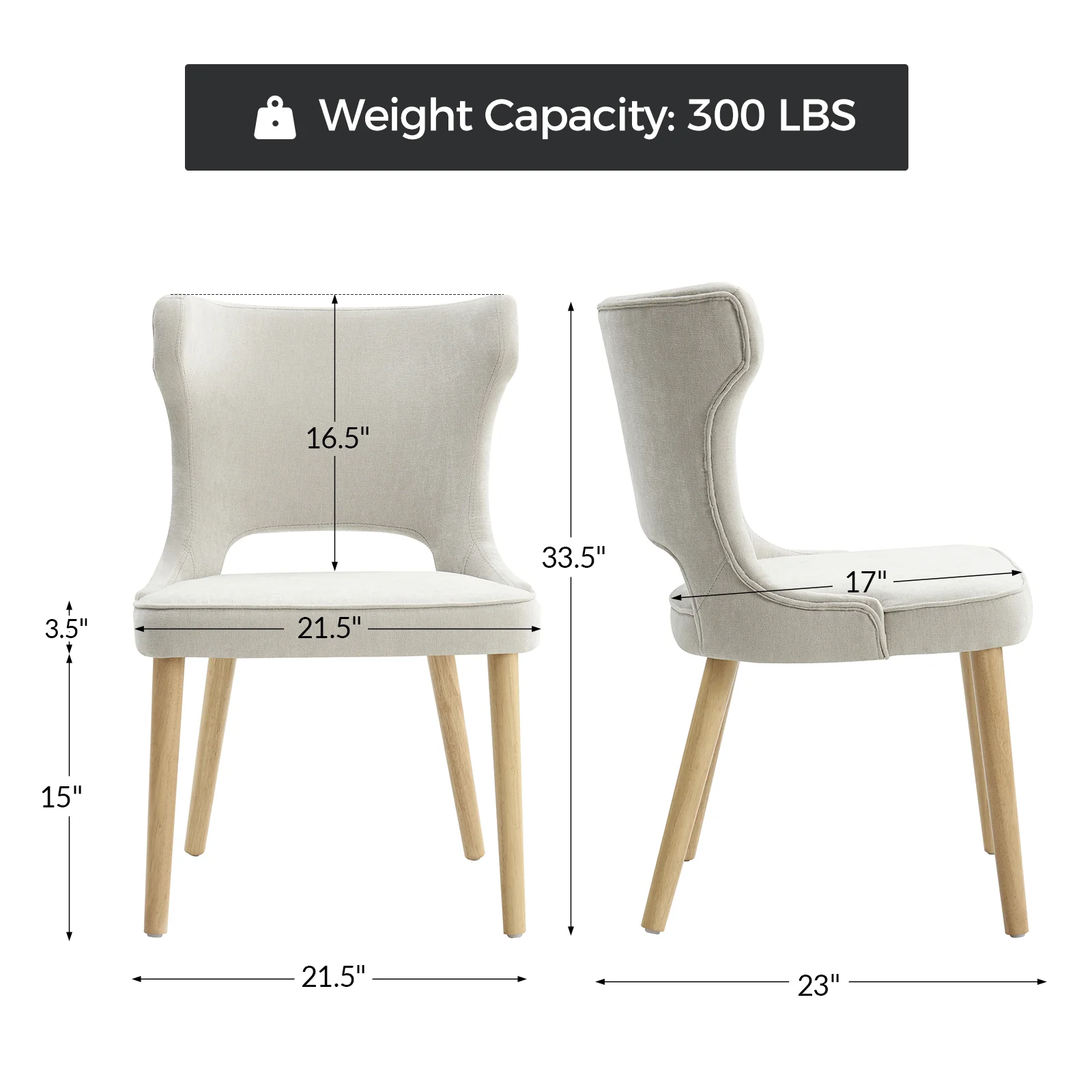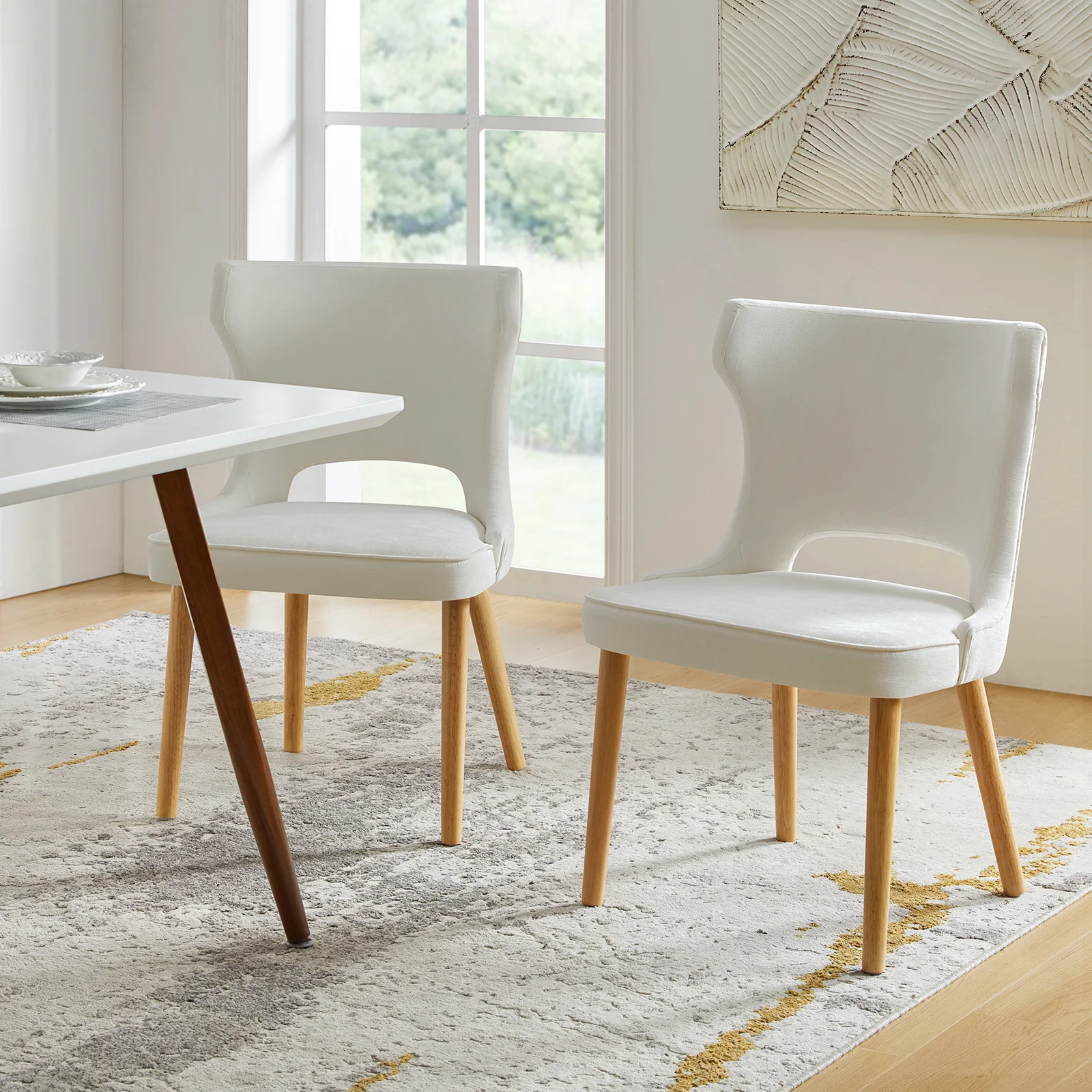 This dining chair set of 2/set of 4 embodies a mid-century modern style with a unique wingback design. Its distinctive hollow design features add an elegant touch, while the solid wood legs ensure stability and durability. The seat is upholstered in anti-water fabric, making it practical for everyday use and easy to maintain. Filled with density foam, the cushion provides exceptional support and comfort, ensuring a pleasant dining experience. This dining chair is easy to install with threaded legs, no tools required. This combination of aesthetic appeal and functional design makes the chair set of 2/set of 4 a stylish and practical addition to any dining space.