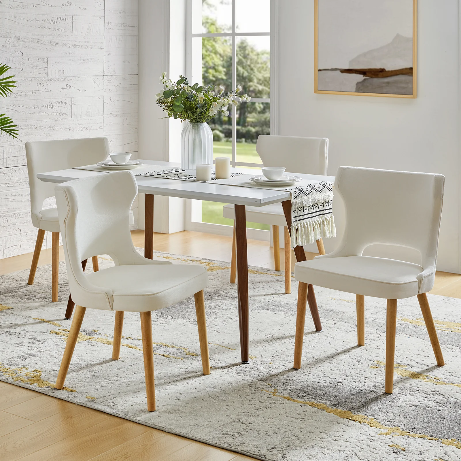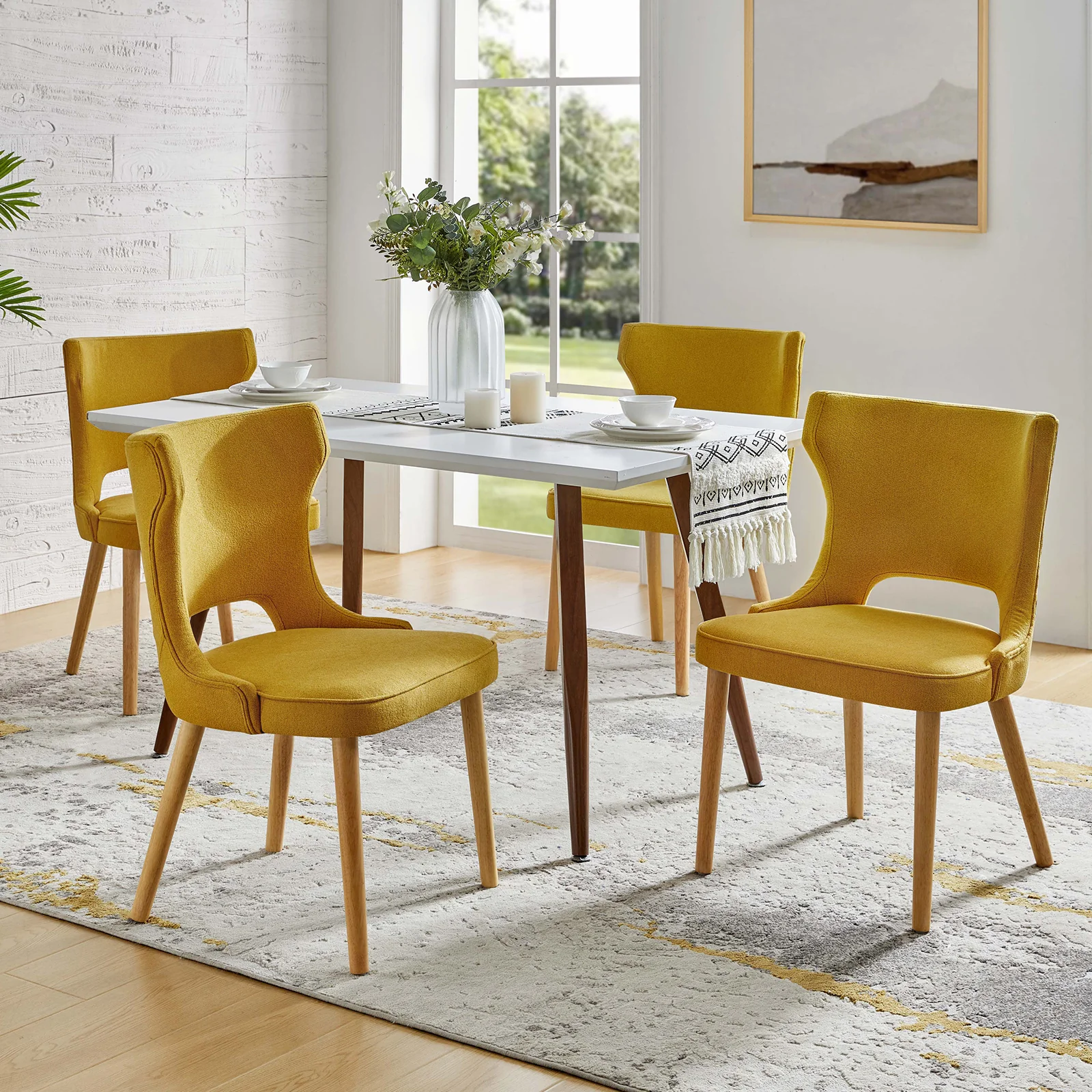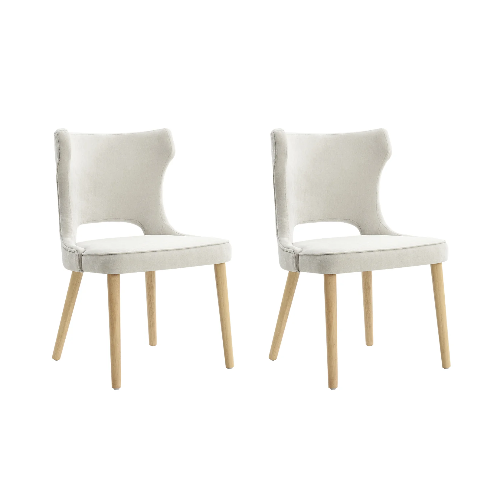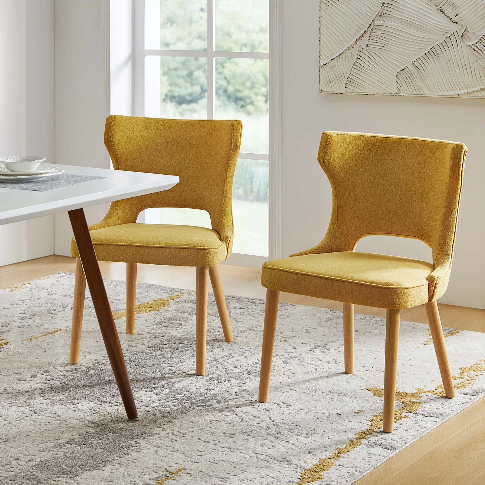 This dining chair set of 2/set of 4 embodies a mid-century modern style with a unique wingback design. Its distinctive hollow design features add an elegant touch, while the solid wood legs ensure stability and durability. The seat is upholstered in anti-water fabric, making it practical for everyday use and easy to maintain. Filled with density foam, the cushion provides exceptional support and comfort, ensuring a pleasant dining experience. This dining chair is easy to install with threaded legs, no tools required. This combination of aesthetic appeal and functional design makes the chair set of 2/set of 4 a stylish and practical addition to any dining space.