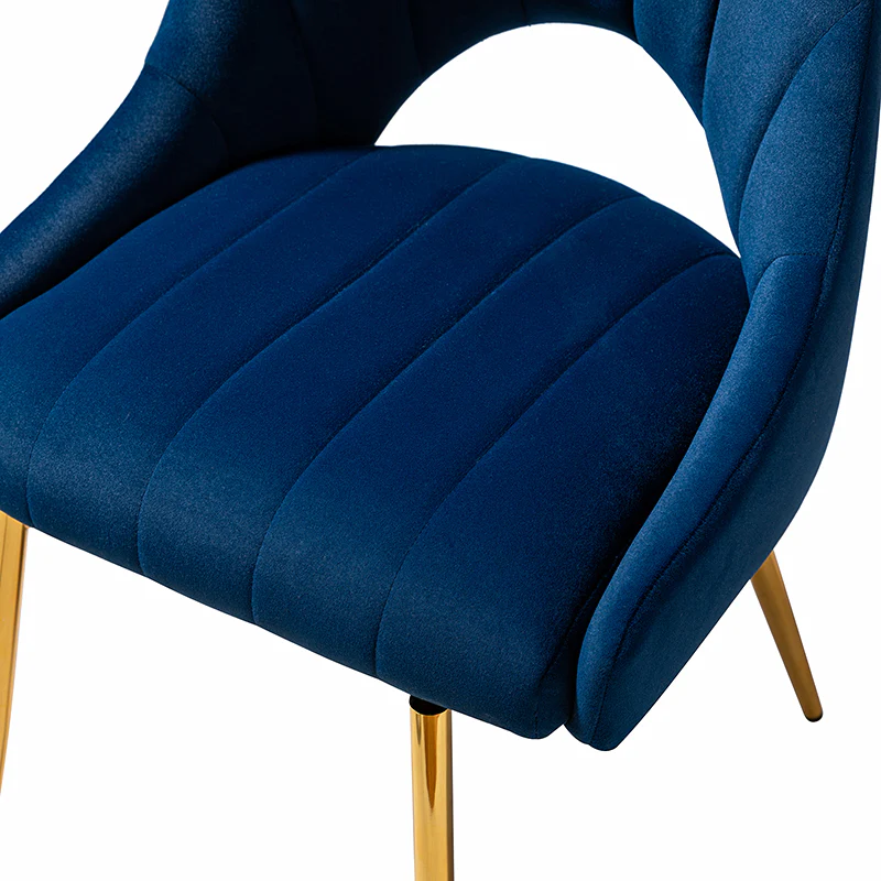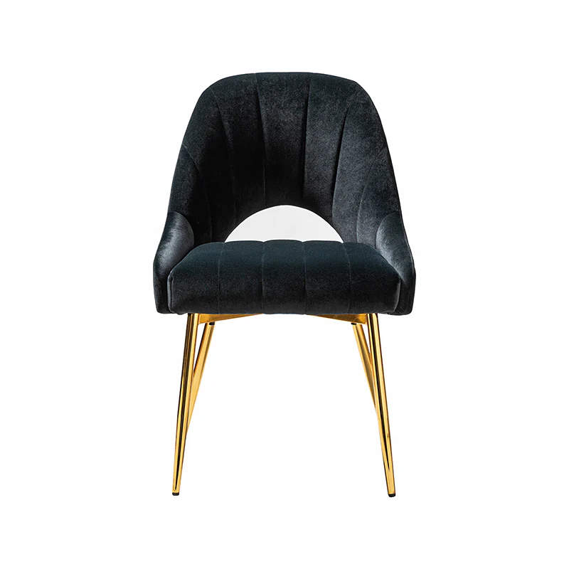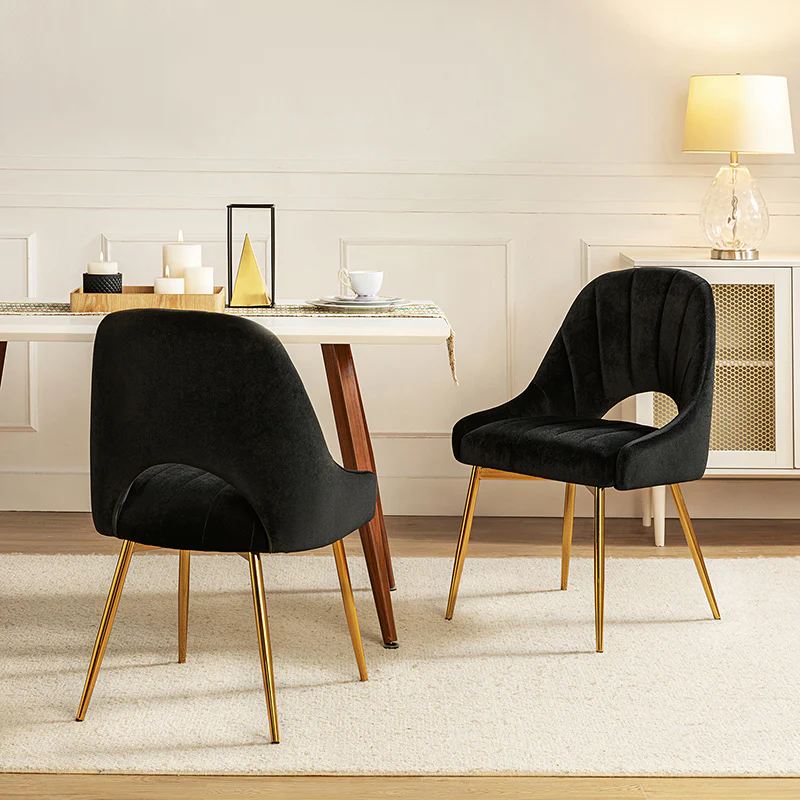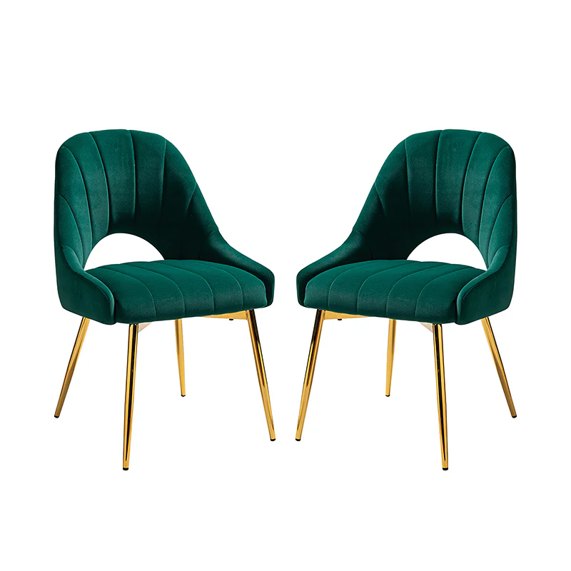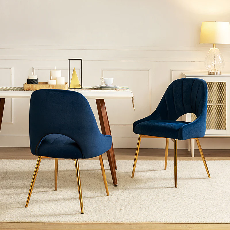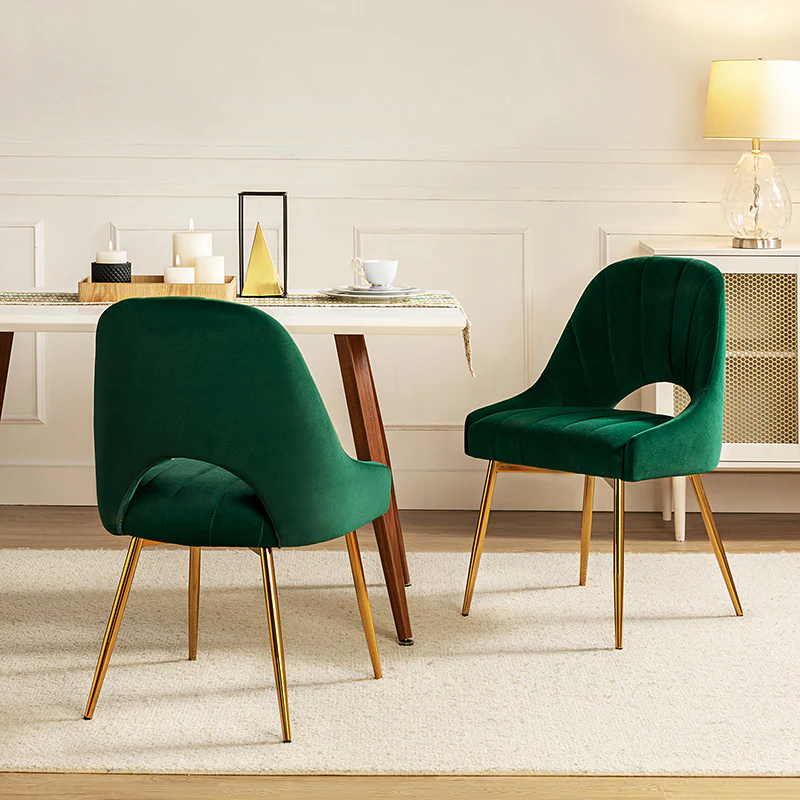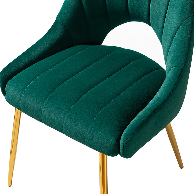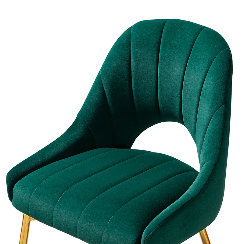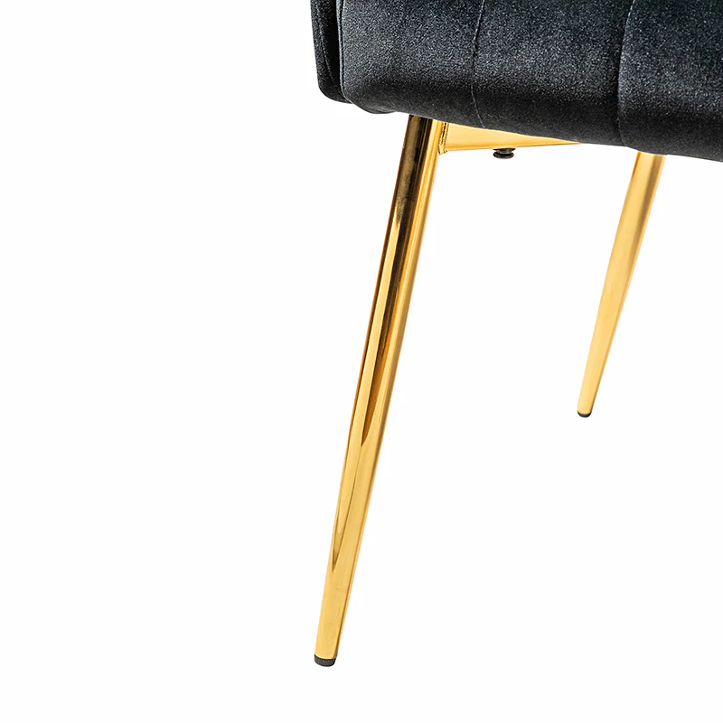 The epitome of luxury and elegance in dining chairs. The surrounding armless design of this chair set provides ample space and comfort, while the hollowed-out back promotes good posture. The chair set is upholstered in plush velvet, and the golden metal legs offer both support and a touch of glamour to the overall design. The tufted detailing on the backrest and seat adds an extra element of sophistication to the already stunning Victoria dining chair set. It has a wide range of functions and can be used as a dining chair set, leisure chair set, or makeup stool set, suitable for small spaces. Whether you're hosting a dinner party or enjoying a meal with your family, this chair set is sure to elevate your dining experience to the next level. Sit back, relax, and enjoy the comfort and style of 'Victoria' at your dining table.