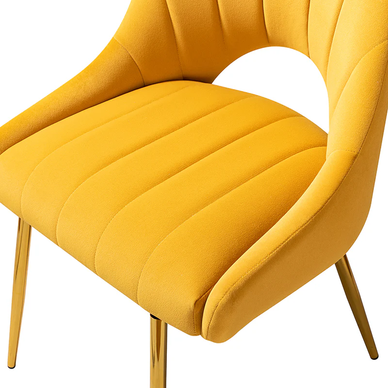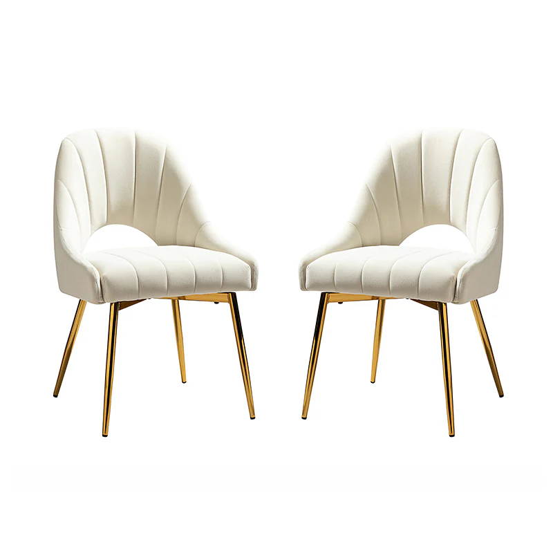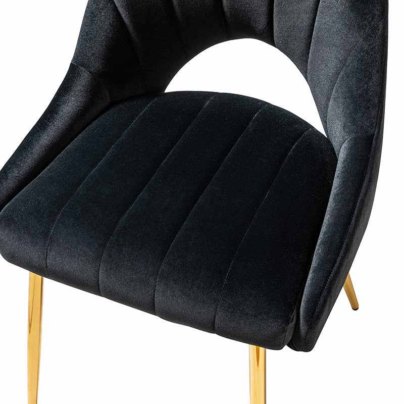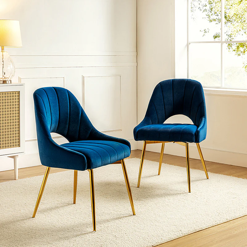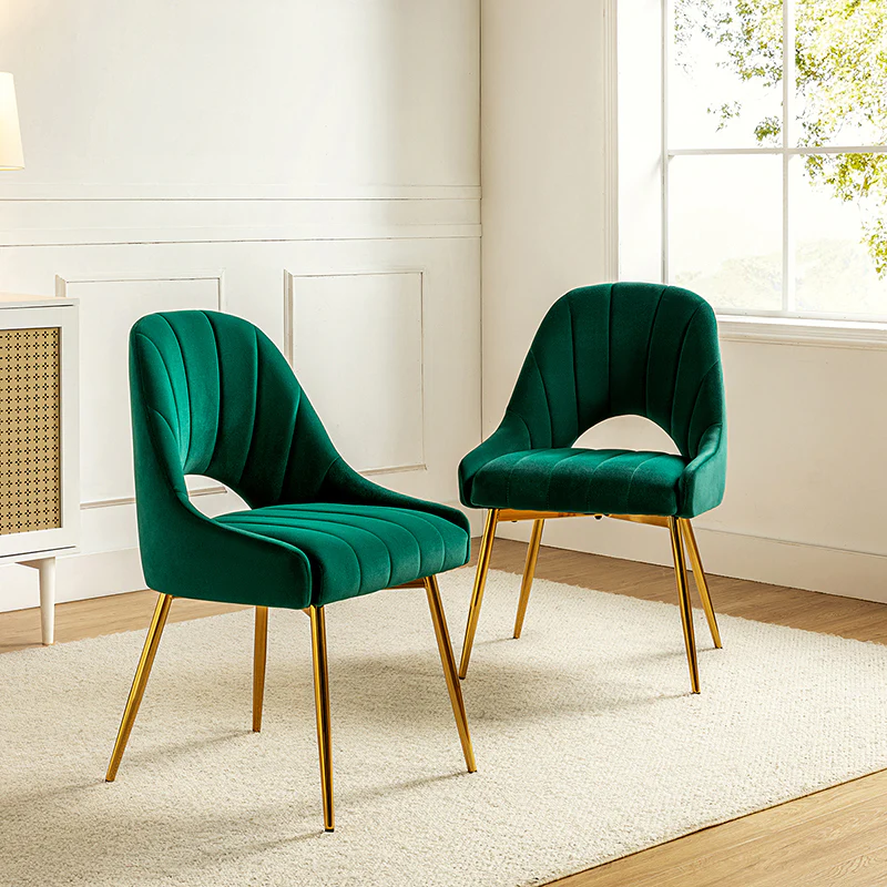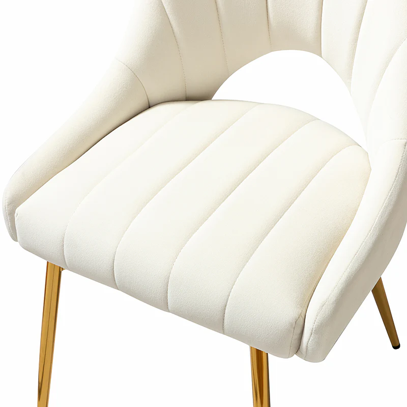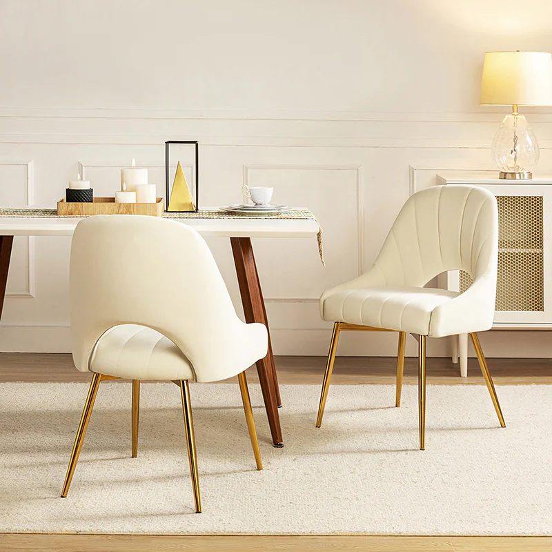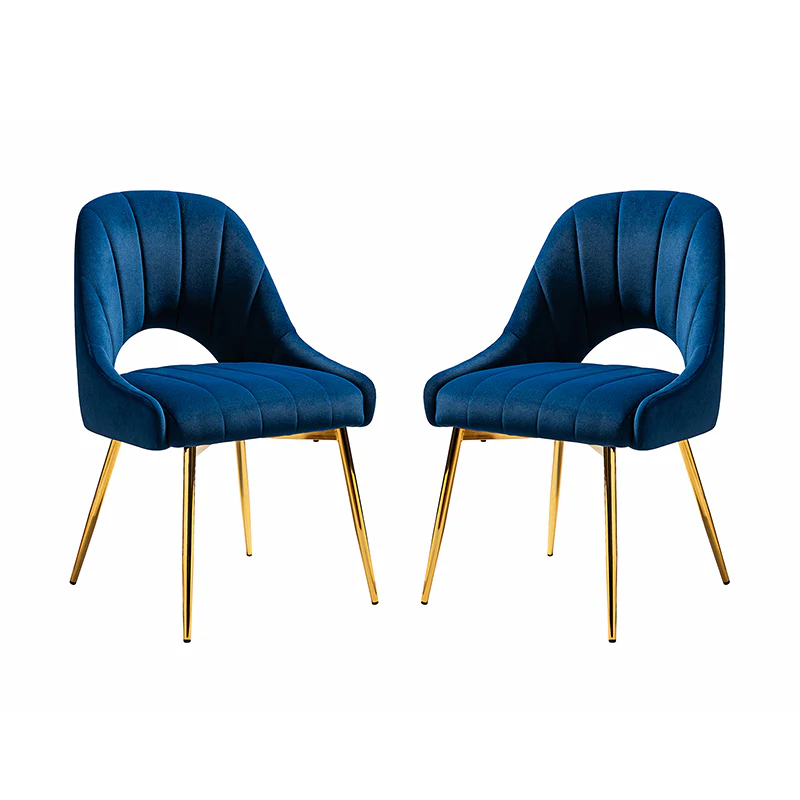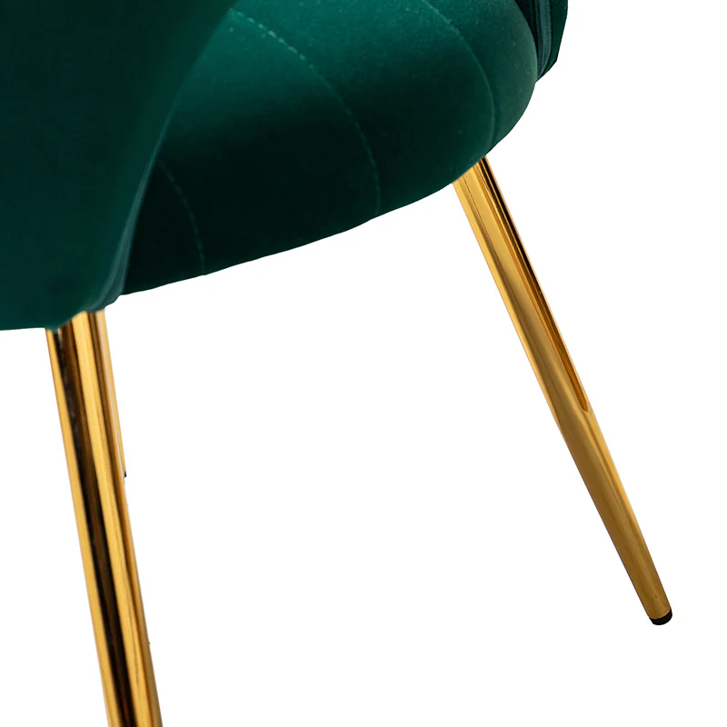 The epitome of luxury and elegance in dining chairs. The surrounding armless design of this chair set provides ample space and comfort, while the hollowed-out back promotes good posture. The chair set is upholstered in plush velvet, and the golden metal legs offer both support and a touch of glamour to the overall design. The tufted detailing on the backrest and seat adds an extra element of sophistication to the already stunning Victoria dining chair set. It has a wide range of functions and can be used as a dining chair set, leisure chair set, or makeup stool set, suitable for small spaces. Whether you're hosting a dinner party or enjoying a meal with your family, this chair set is sure to elevate your dining experience to the next level. Sit back, relax, and enjoy the comfort and style of 'Victoria' at your dining table.