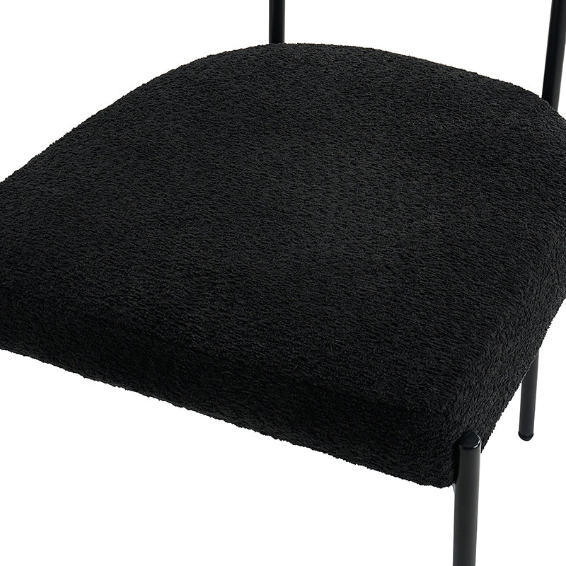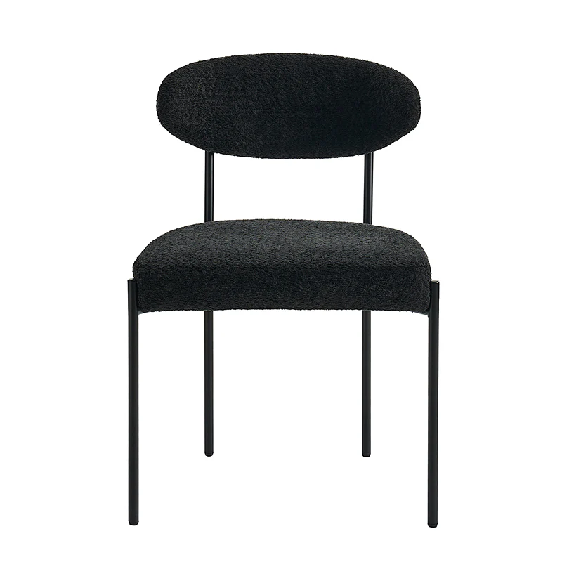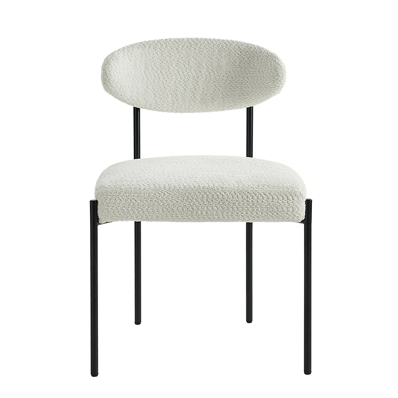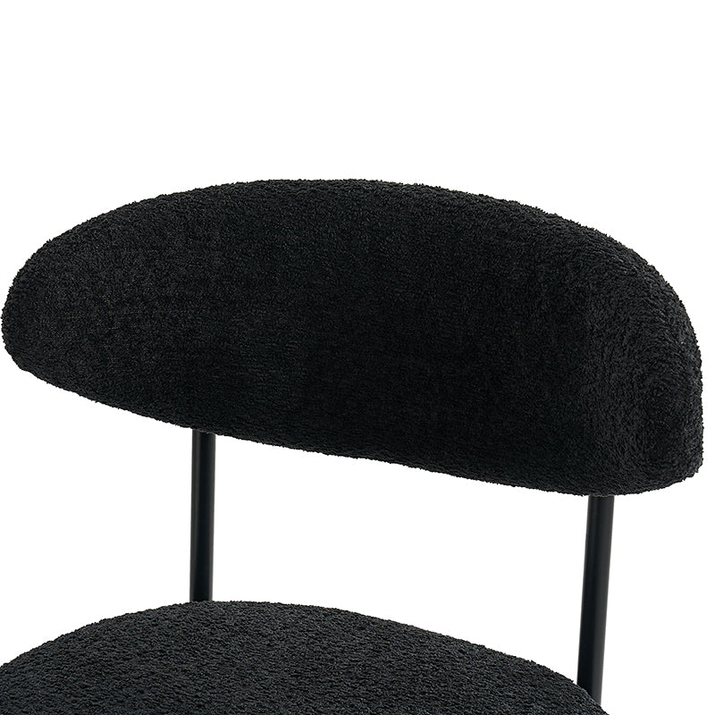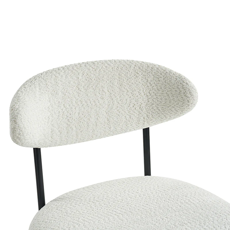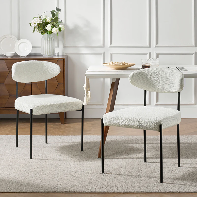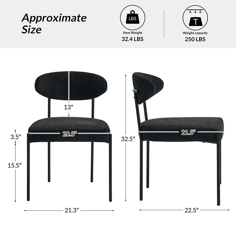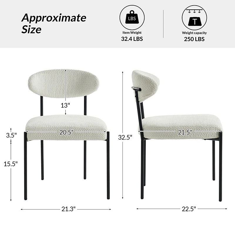 Indulge in modern elegance with this Scandinavian-inspired dining chair set of 2. Crafted with contemporary flair, its sleek metal legs with adjustable feet provide stability and a touch of sophistication. The chair set of 2 features a distinctive curved backrest for added comfort and style. Embrace luxury with the plush lamb wool upholstery, ensuring a cozy and inviting atmosphere in your dining room, kitchen, or living room. The armless design promotes a minimalist aesthetic, while the removable and washable short plush boucle fabric seat cover adds practicality to your lifestyle. If you need to remove and wash the seat cushion, please remove the chair legs first. Elevate your dining experience with this modern design and comfort fusion, where form seamlessly meets function.