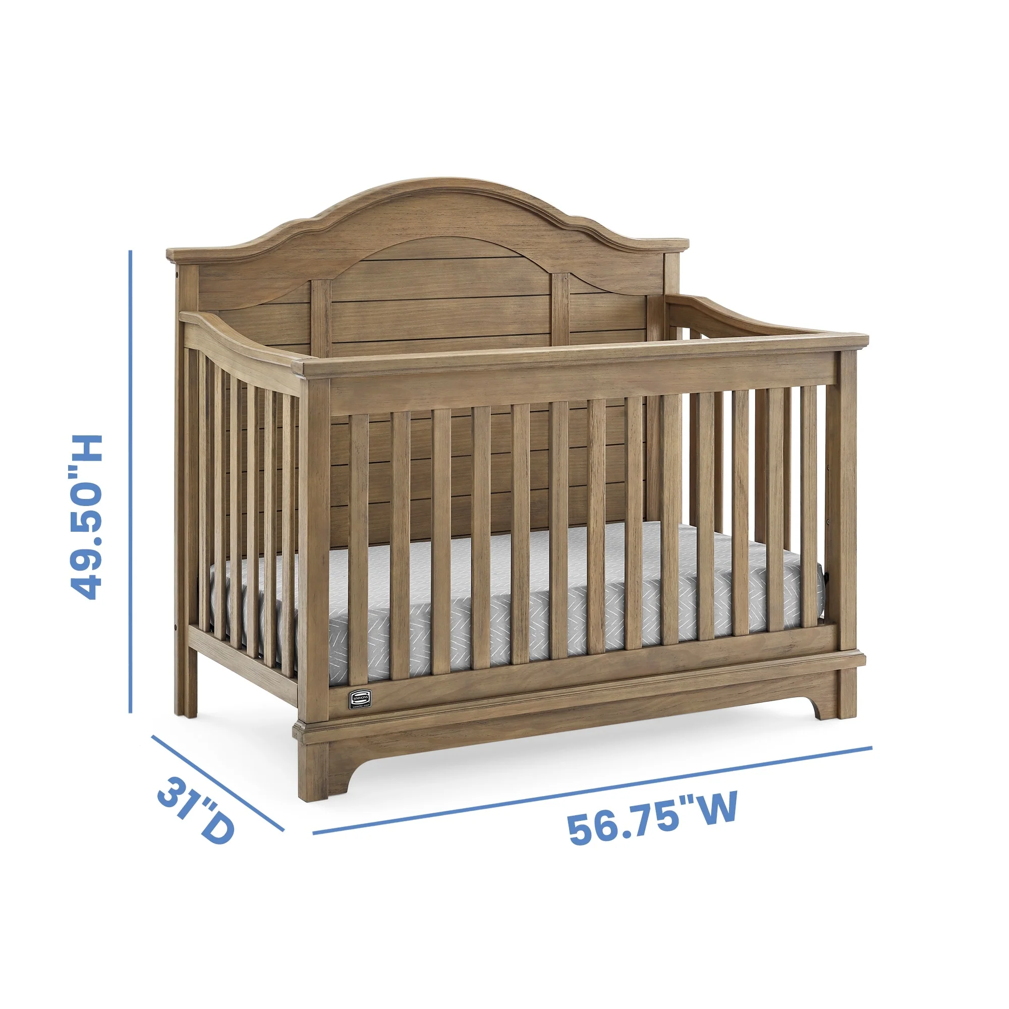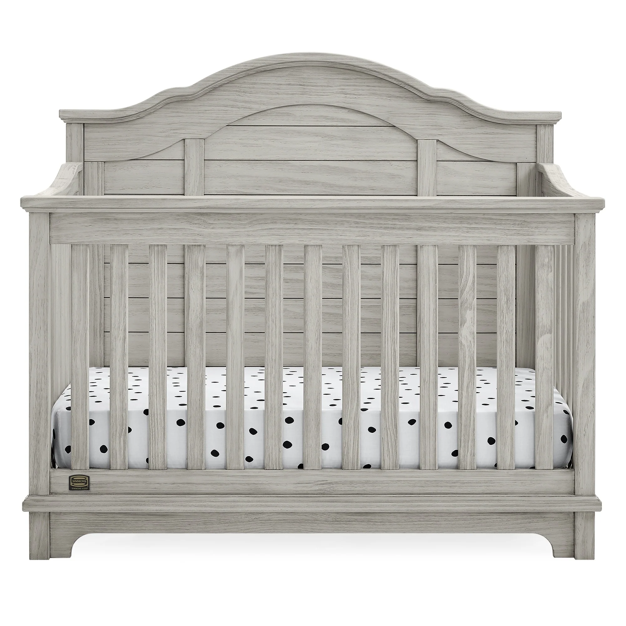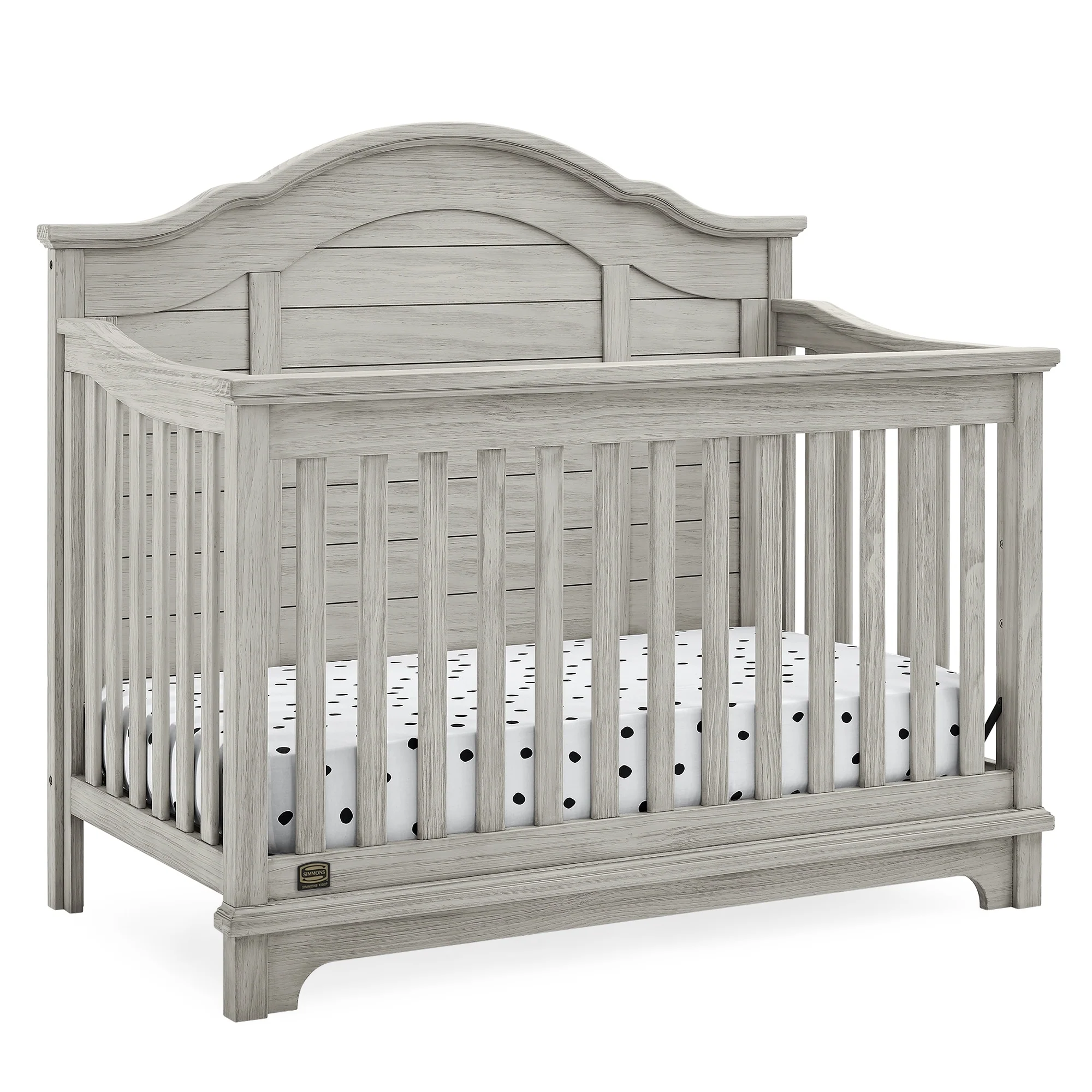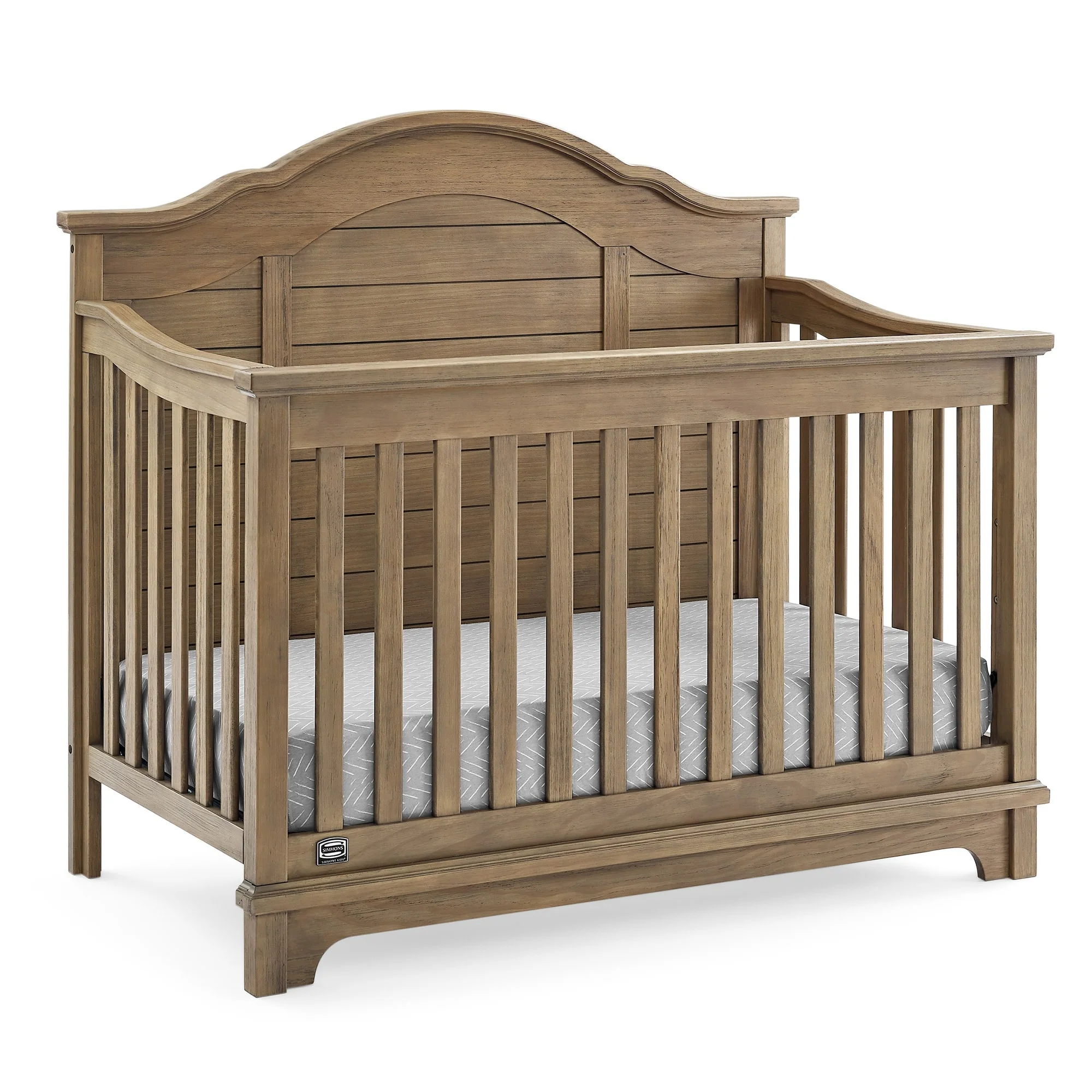 The elegant curves and shiplap-inspired headboard of the Asher 6-in-1 Convertible Baby Crib by Simmons Kids are brought to life with a lightly textured finish. A great option for your baby's nursery, this convertible crib features a dramatic silhouette that will make it the focal point of any bedroom for years to come. Its grow-with-me design features three adjustable height levels that allow the crib to be lowered as your child grows, plus it converts from a crib, to a toddler bed, sofa, daybed, full size bed with headboard or full size bed with headboard and footboard. The only bed your little one will ever need, this versatile crib will take you from the nursery to high school, and all the years in between. Toddler Guardrail included; Full Size Bed Rails sold separately. Given the hand applied nature of this baby crib's finish, variations in the wood are to be expected and celebrated.