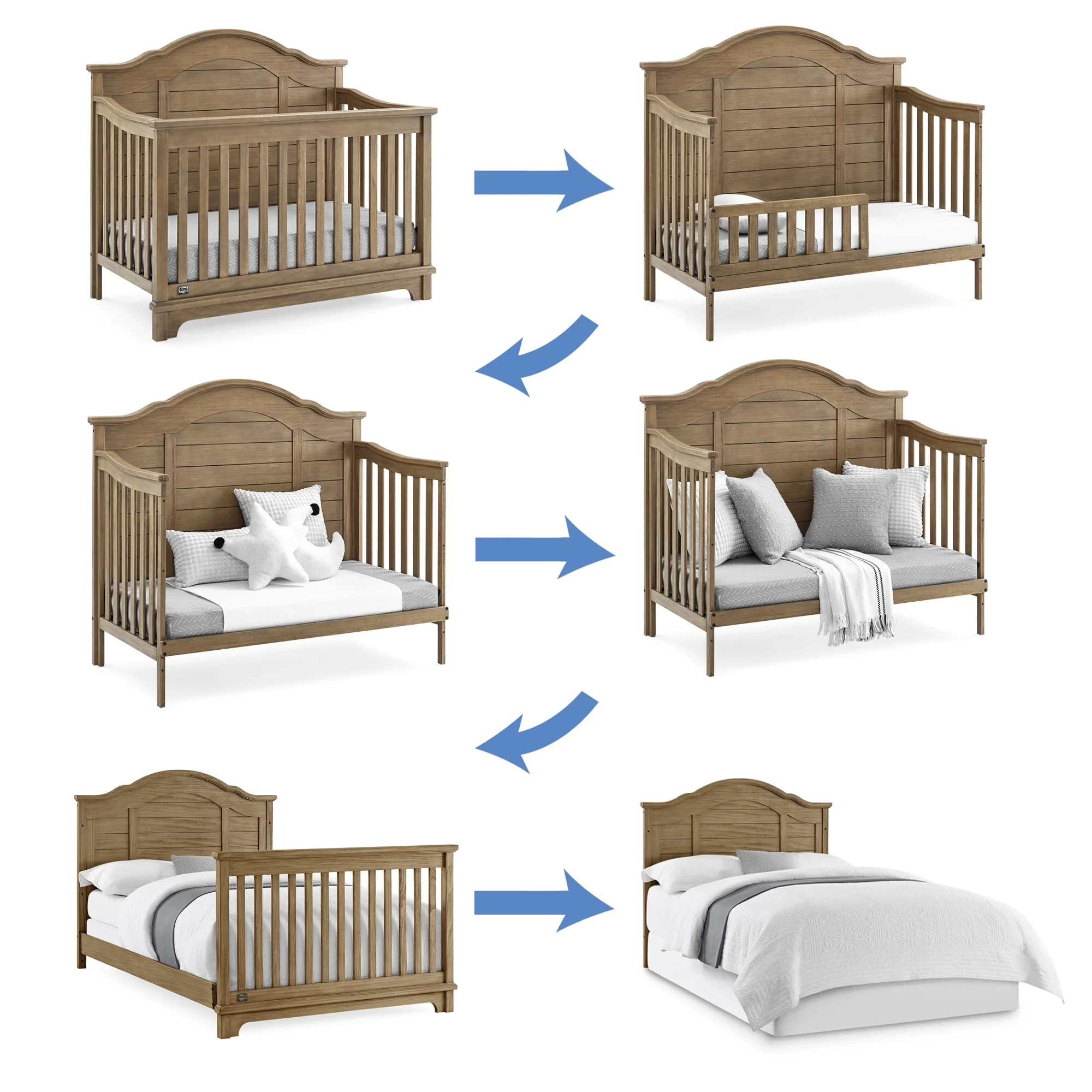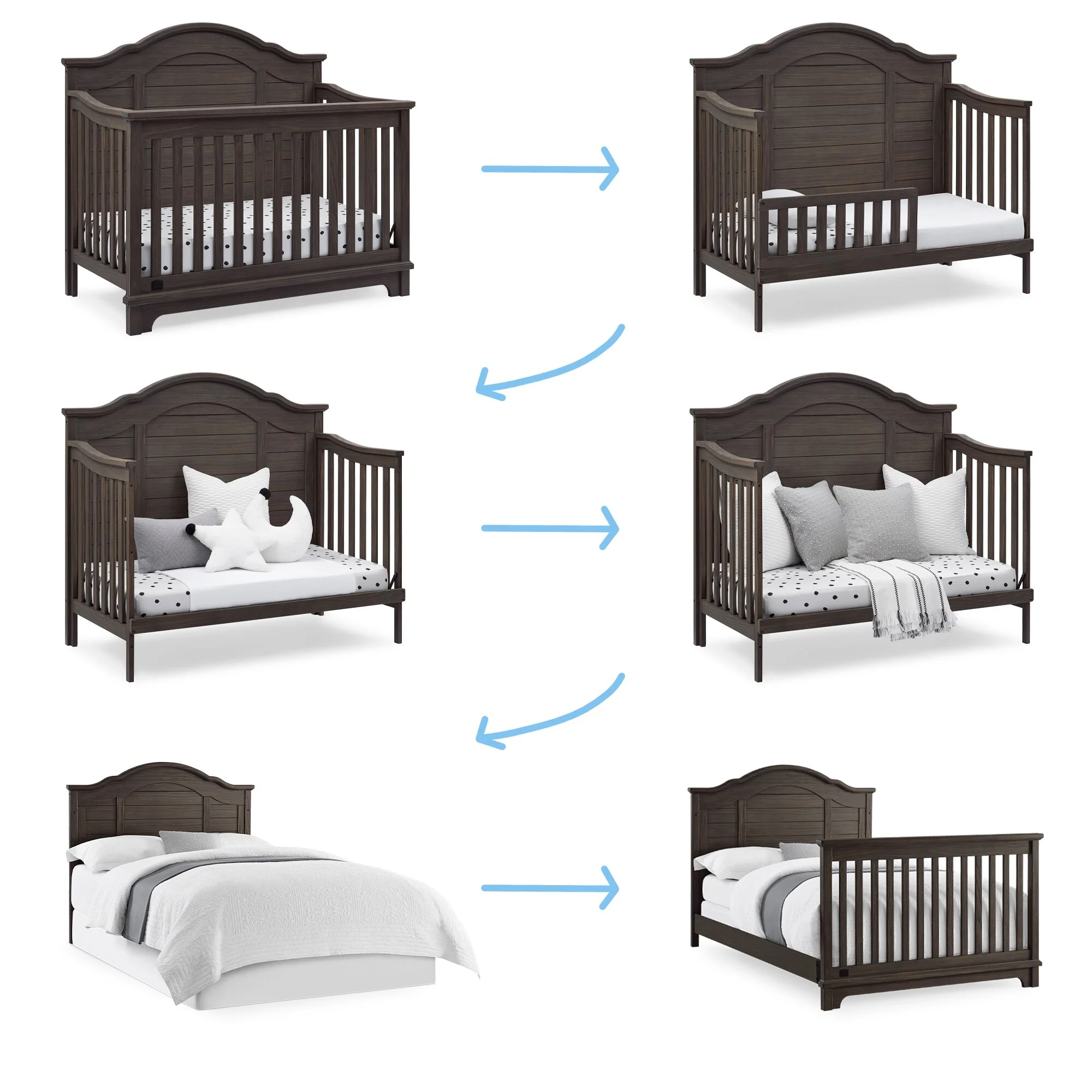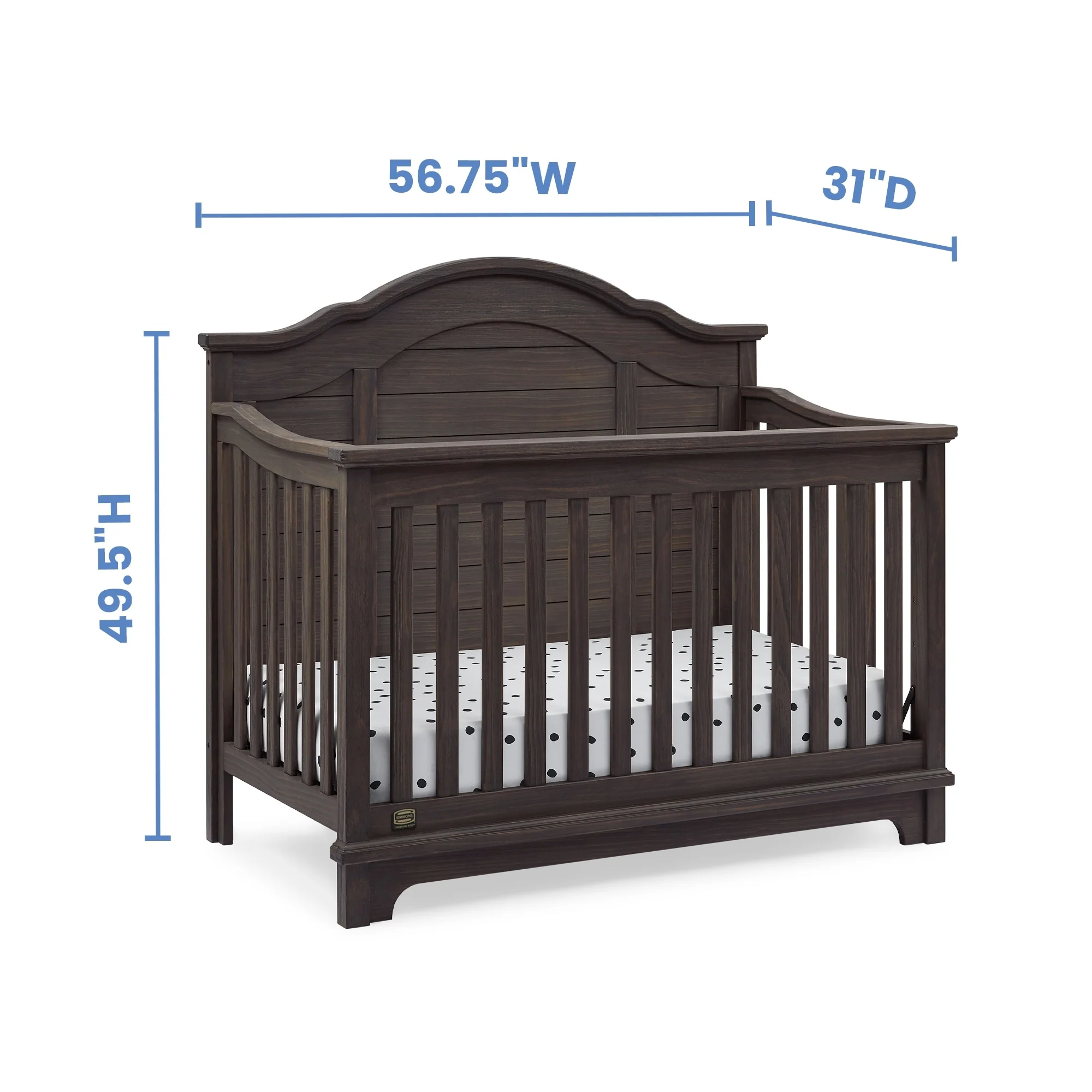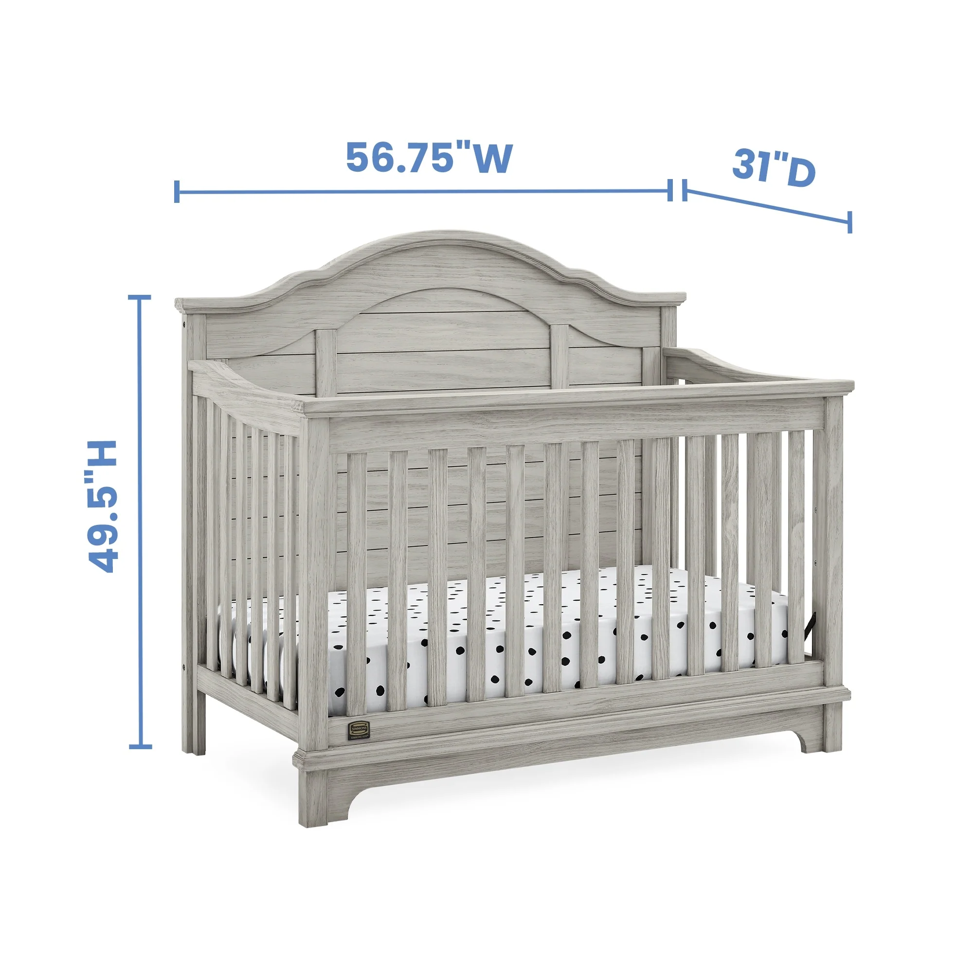 The elegant curves and shiplap-inspired headboard of the Asher 6-in-1 Convertible Baby Crib by Simmons Kids are brought to life with a lightly textured finish. A great option for your baby's nursery, this convertible crib features a dramatic silhouette that will make it the focal point of any bedroom for years to come. Its grow-with-me design features three adjustable height levels that allow the crib to be lowered as your child grows, plus it converts from a crib, to a toddler bed, sofa, daybed, full size bed with headboard or full size bed with headboard and footboard. The only bed your little one will ever need, this versatile crib will take you from the nursery to high school, and all the years in between. Toddler Guardrail included; Full Size Bed Rails sold separately. Given the hand applied nature of this baby crib's finish, variations in the wood are to be expected and celebrated.